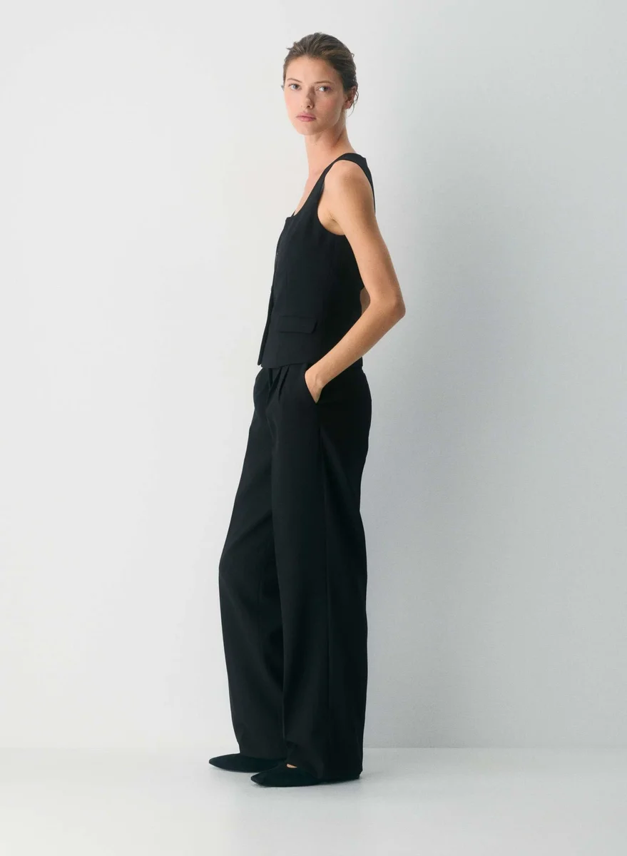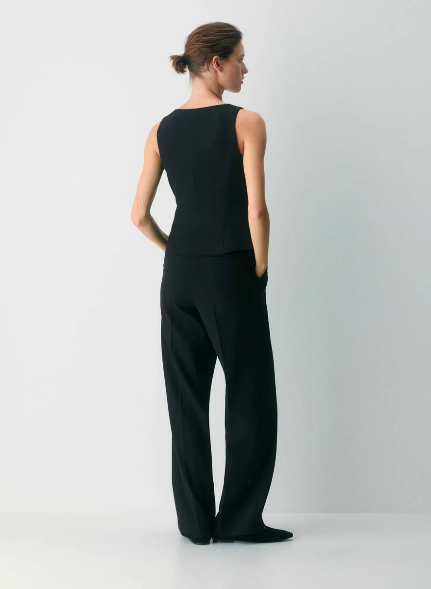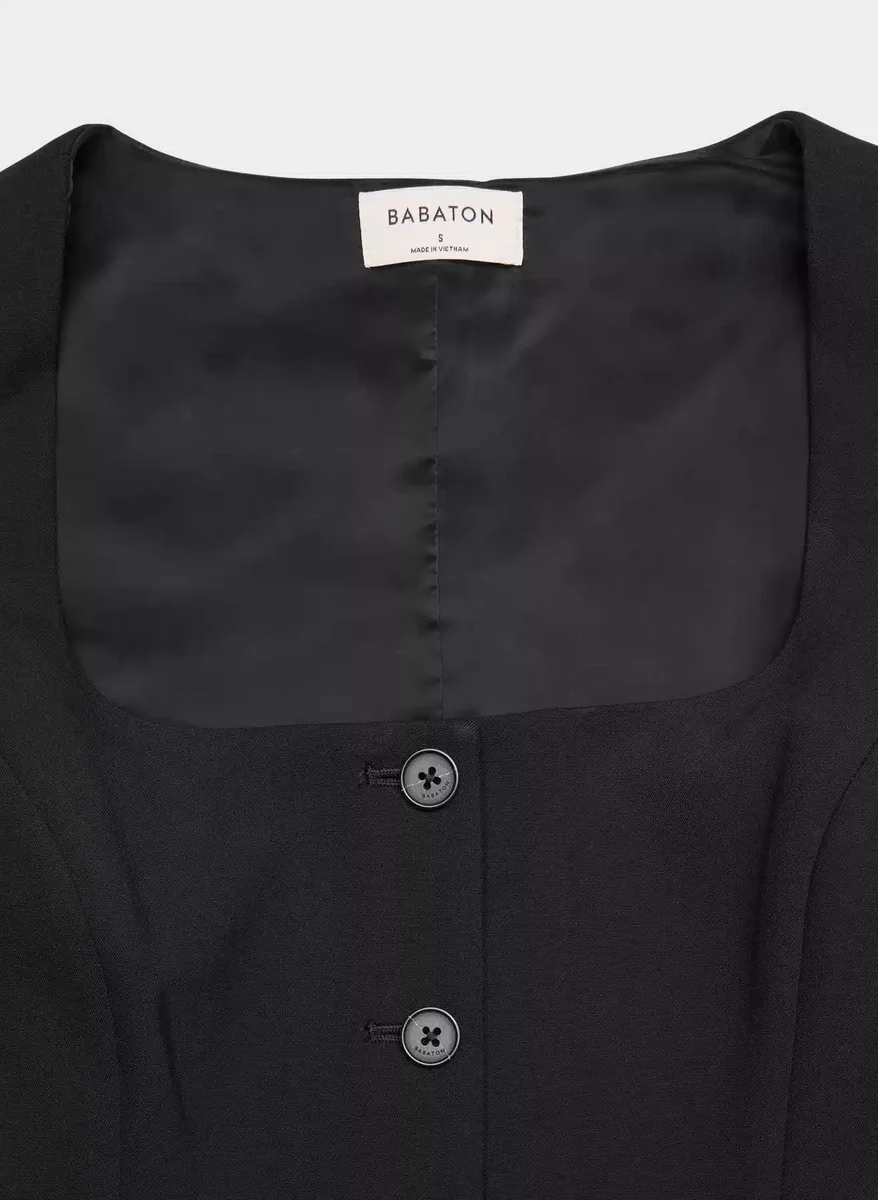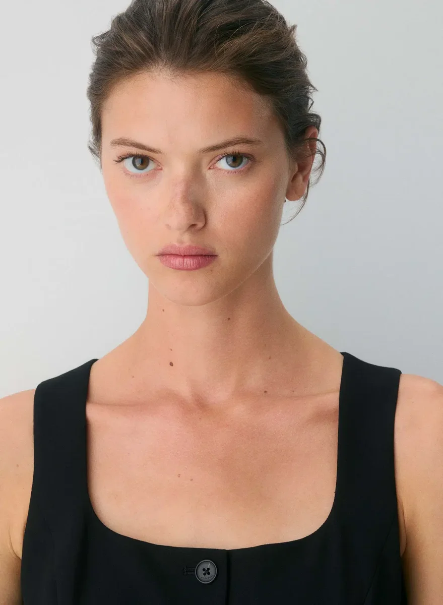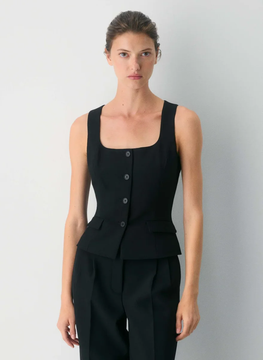This is a fully lined vest with a square neckline, princess seams for shaping and a slim fit. It’s expertly tailored with (Re)ssential — softly structured stretch fabric that holds its form while you move easy. This fabric is sourced from a premier Portuguese mill and made with 54% recycled polyester and 26% LENZING™ ECOVERO™ Viscose.