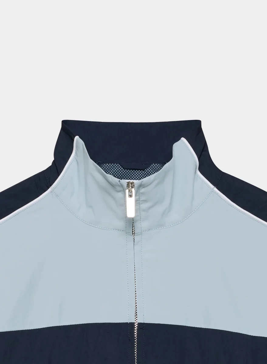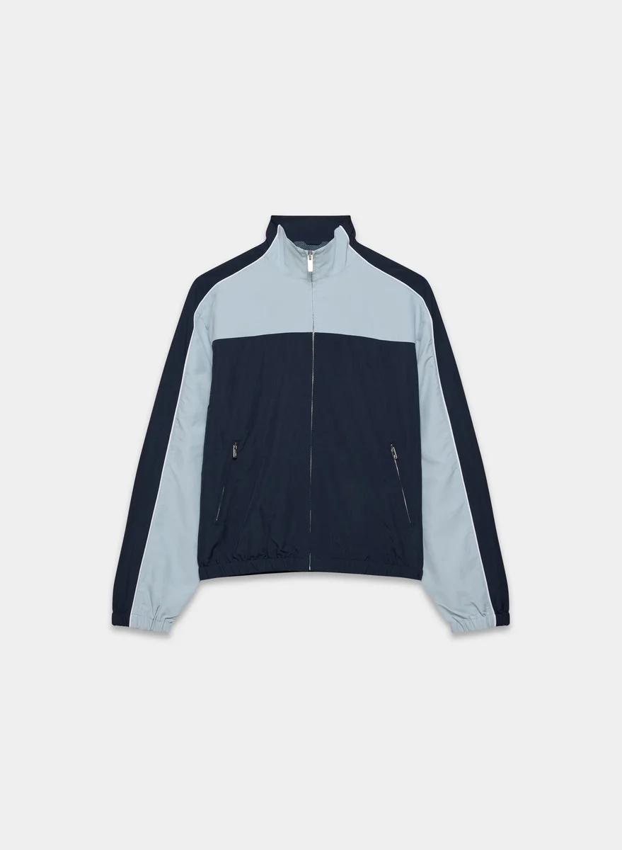 This is a zip-up track jacket with a mesh lining and front welt pockets. It’s cut from water-repellent nylon with a crinkled finish.