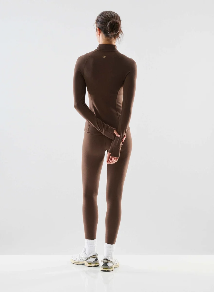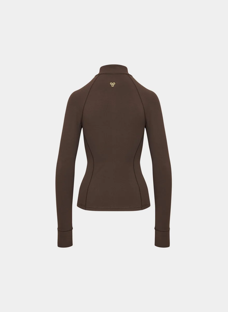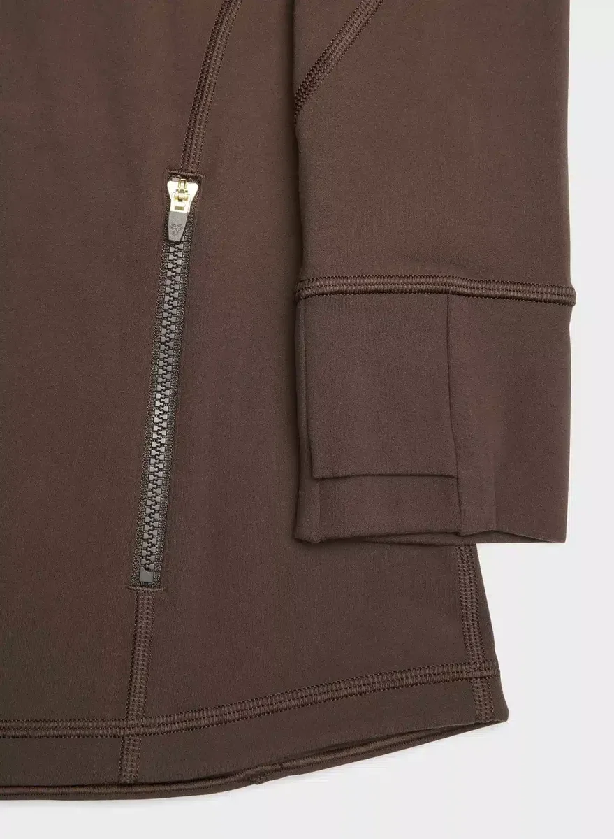 This is a mockneck zip-up with thumbholes, zippered pockets and a tight fit. It’s made with BUTTER — barely there, buttery soft sweat-wicking fabric that shapes to your body.