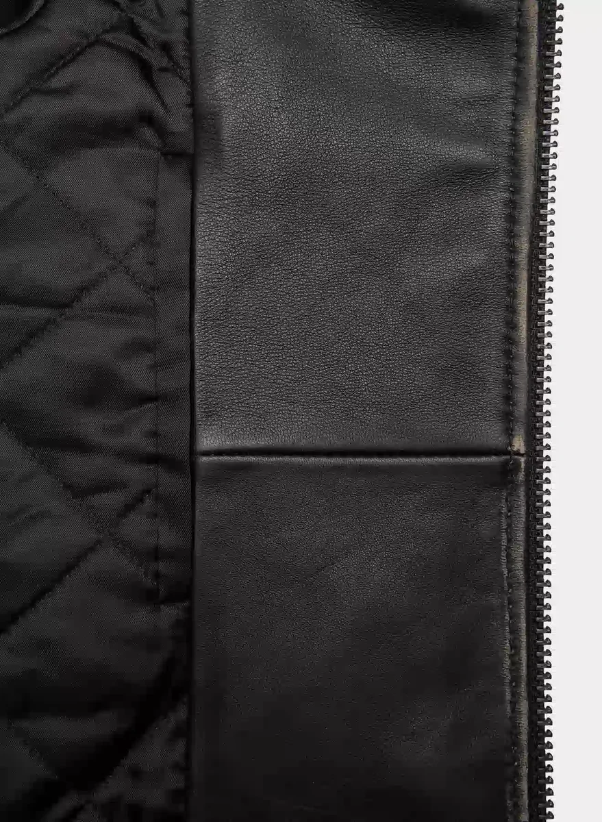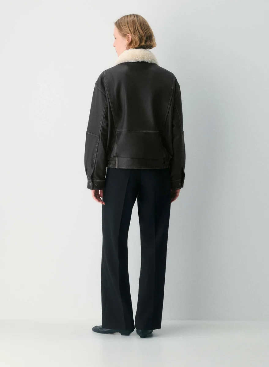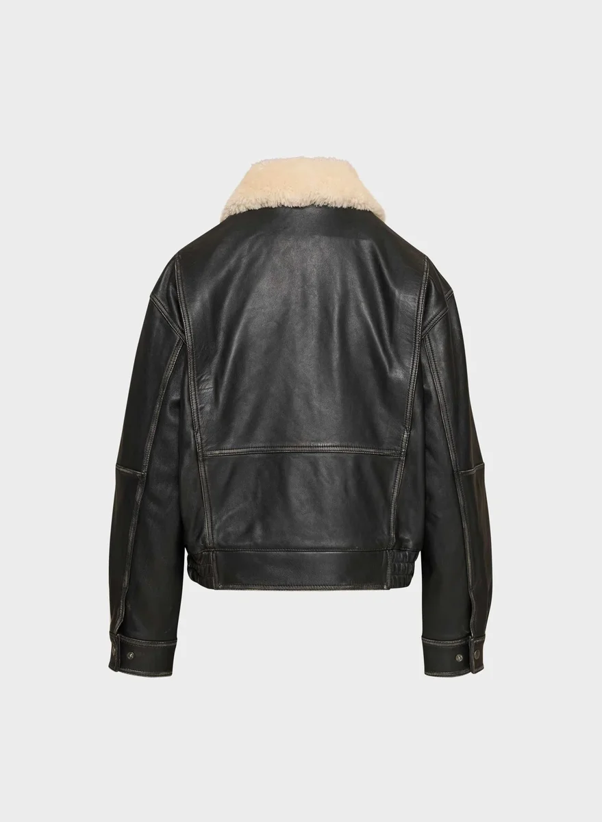 Pilot license and registration?This is an aviator jacket with quilted cupro lining, a shearling collar and inseam pockets. It’s expertly crafted from Nappa Leather — 100% lamb leather with a buttery soft, luxuriously smooth look and feel. This leather features a unique, vintage-like finish.