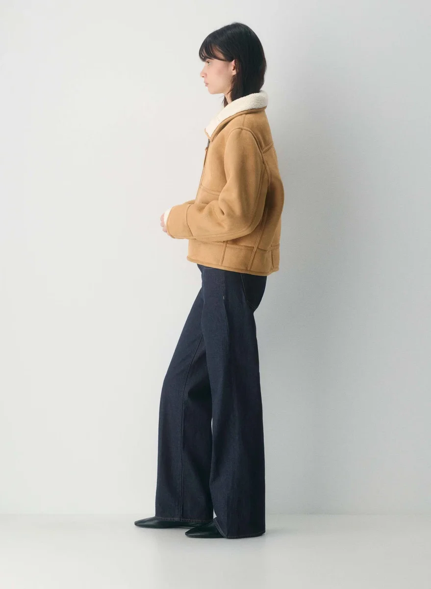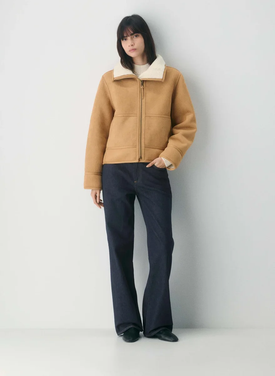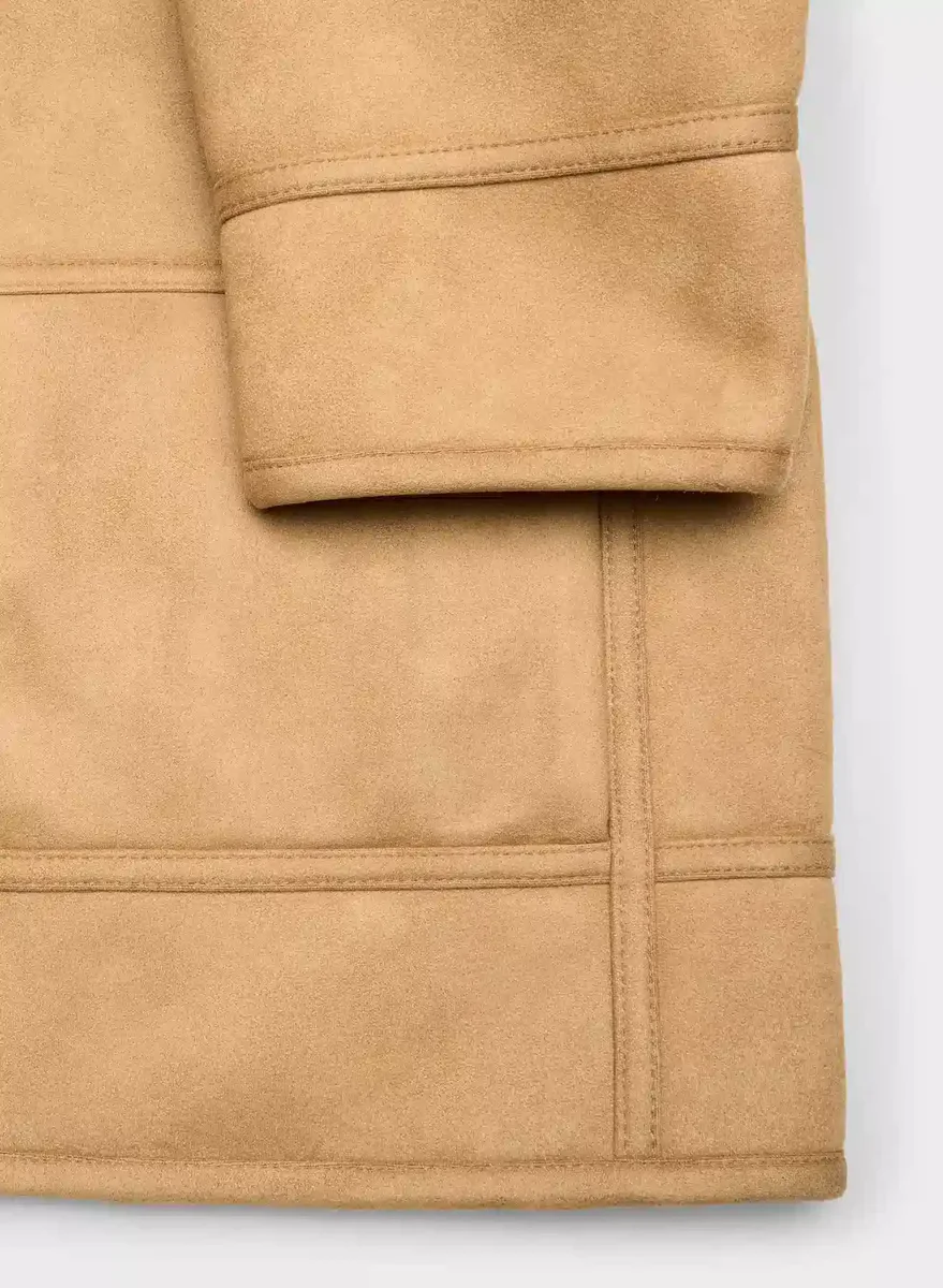 You’re the pilot nowThis is an aviator coat with hand pockets and a relaxed fit. It features a faux suede exterior with a warm faux-shearling fleece interior.