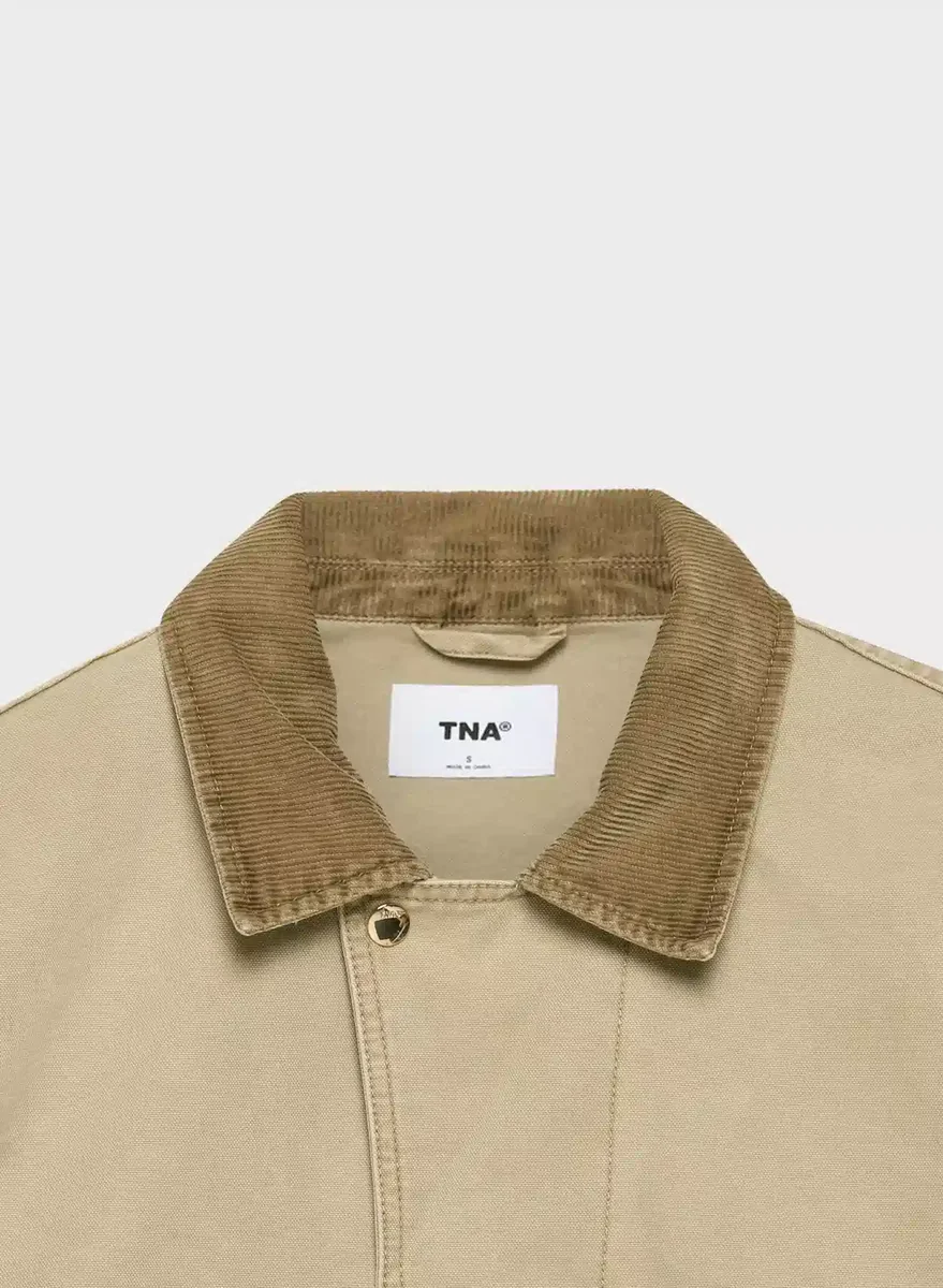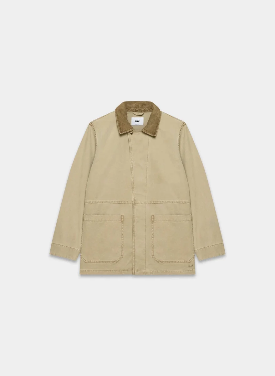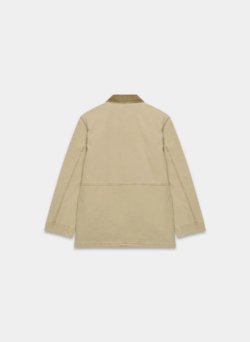 This is an unlined chore jacket with a corduroy collar and snap closures. It’s made from Heritage Canvas — 100% cotton canvas with a softly structured feel and timeless look.