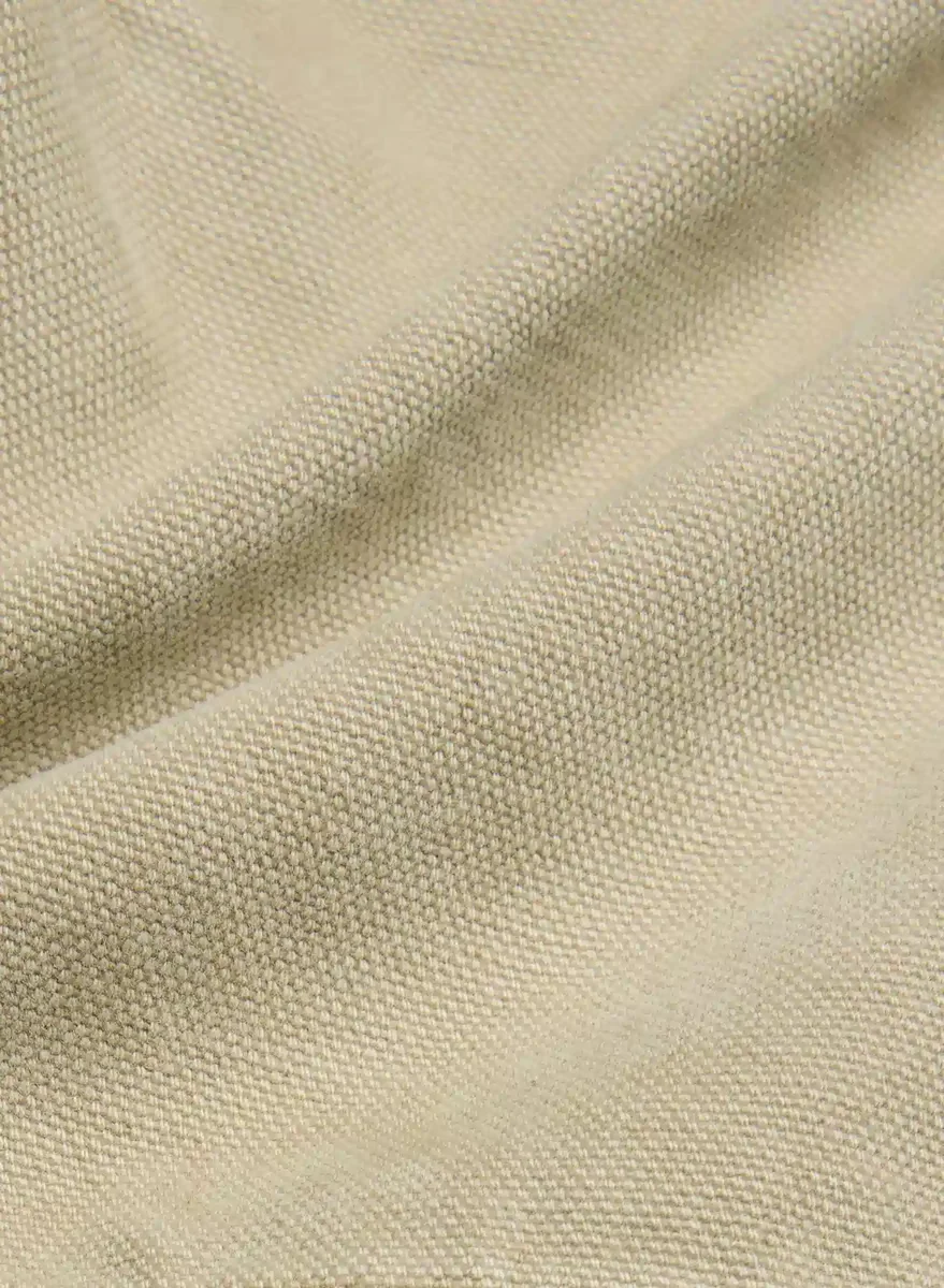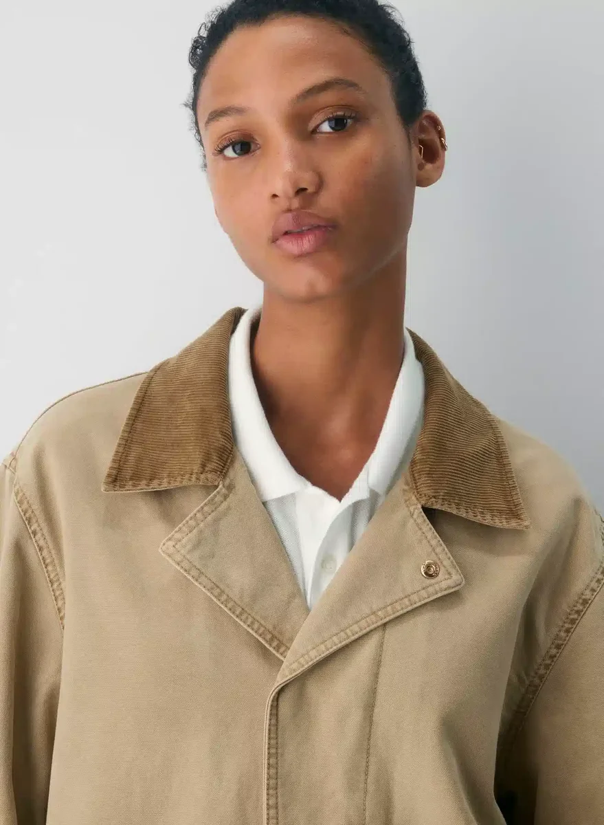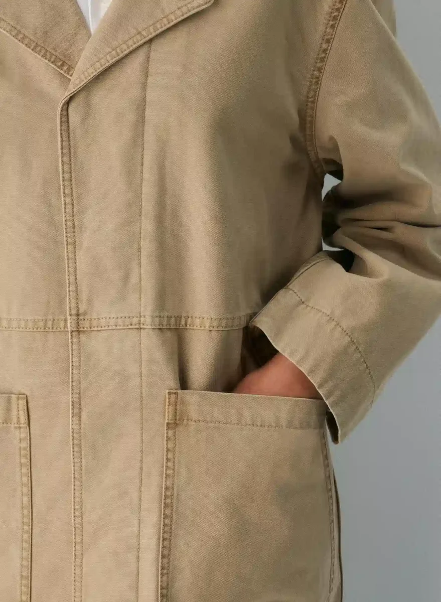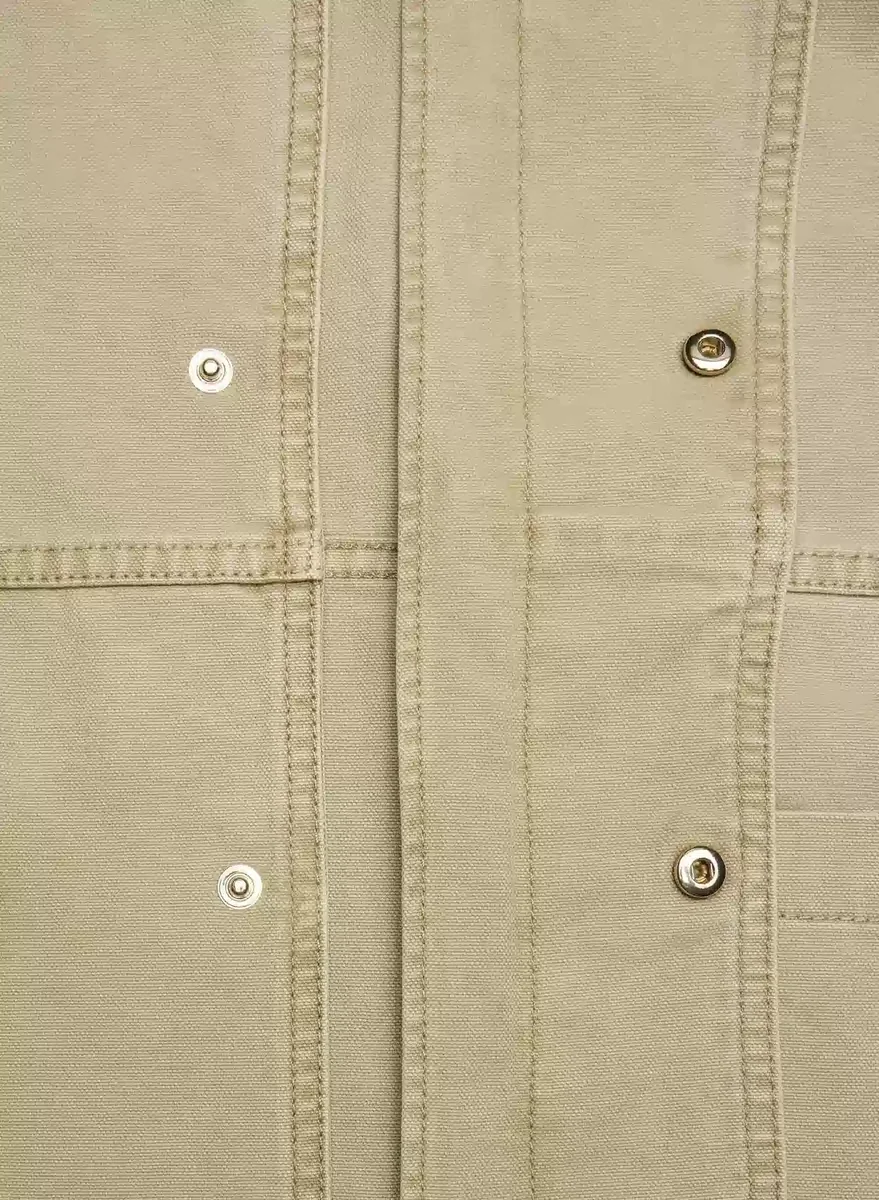 This is an unlined chore jacket with a corduroy collar and snap closures. It’s made from Heritage Canvas — 100% cotton canvas with a softly structured feel and timeless look.