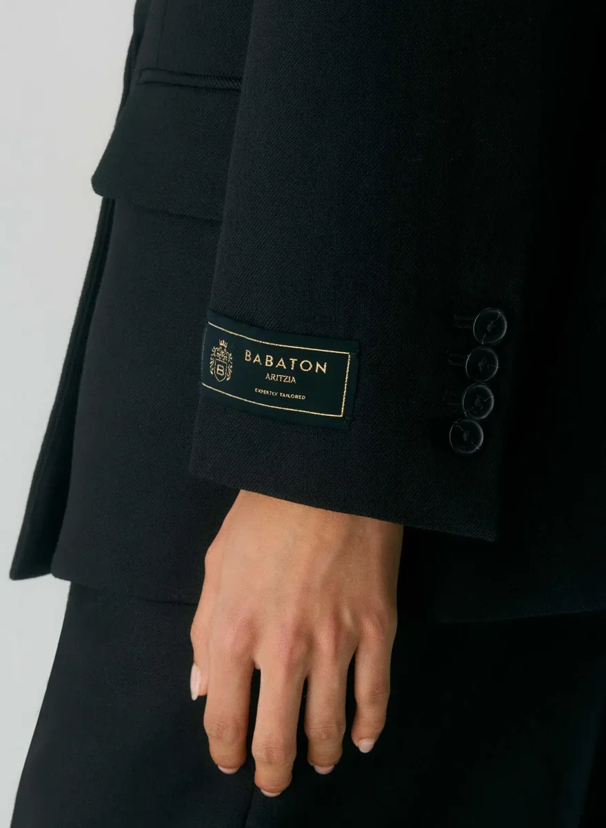 This is a fully lined double-breasted blazer with a peaked lapel, darted waist and an oversized fit. It’s finely tailored with 100% virgin wool twill that is softly structured and responsibly sourced. This fabric is from a premier Italian mill.