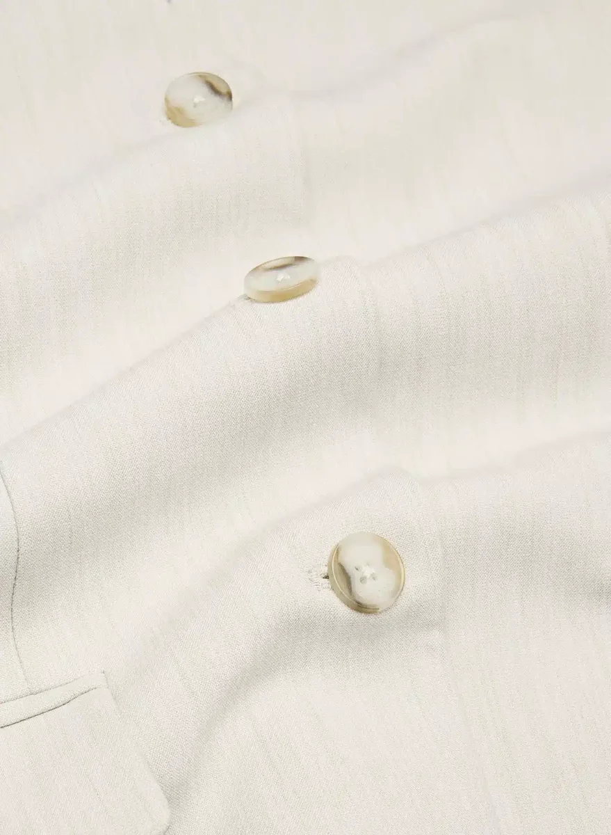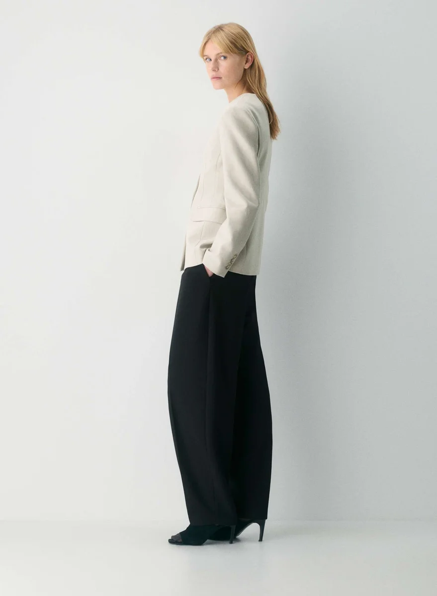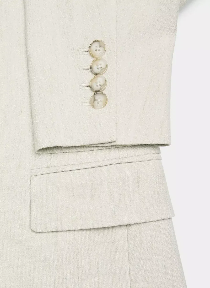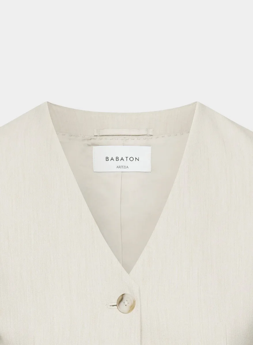 This is a single-breasted, collarless blazer with an hourglass silhouette. It’s finely tailored with a softly structured stretch fabric that holds its form while you move easy. This fabric is sourced from a premier Portuguese mill and made with 26% LENZING™ ECOVERO™ Viscose.