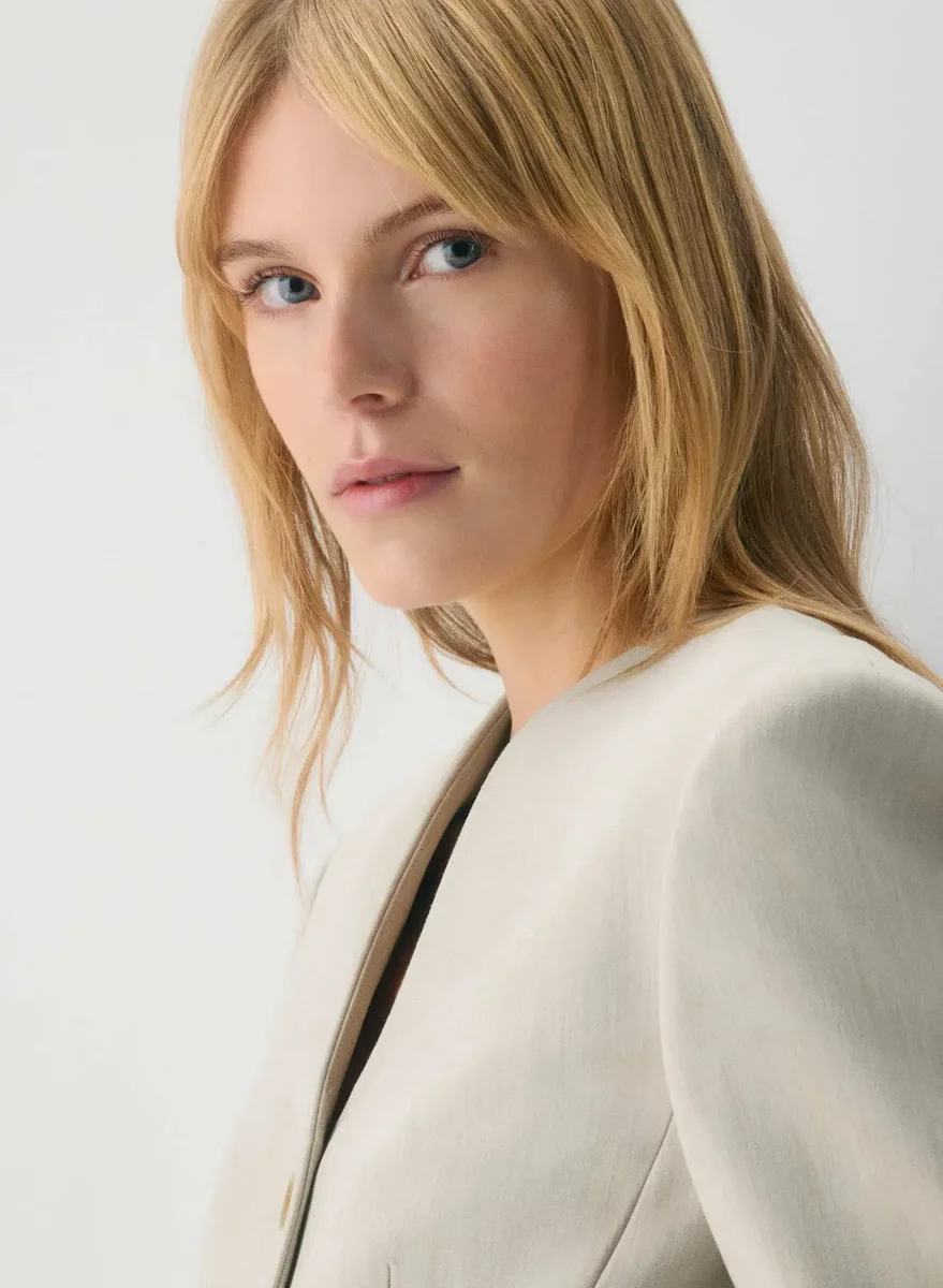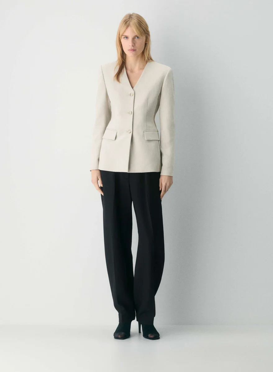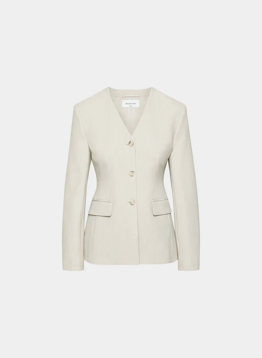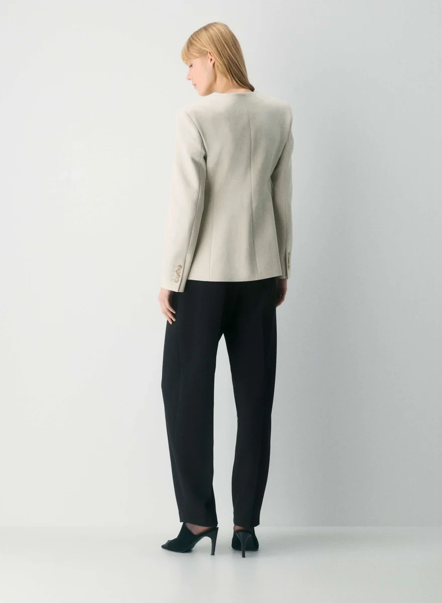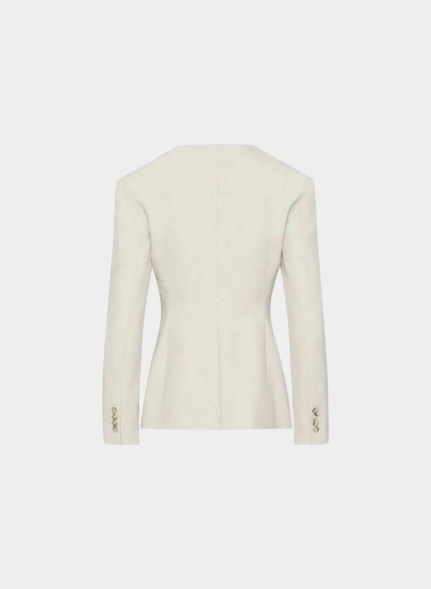 Softly structured collarless hourglass blazer