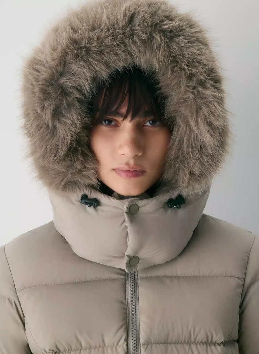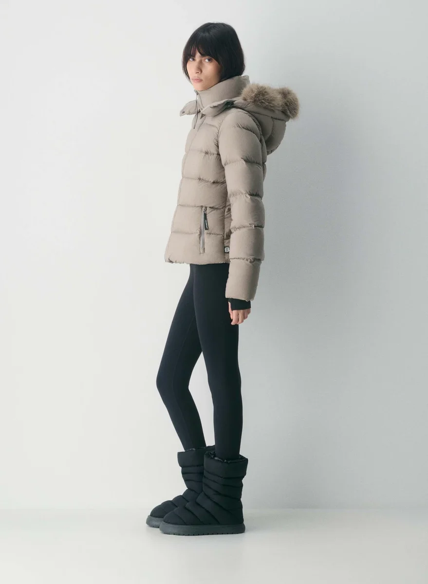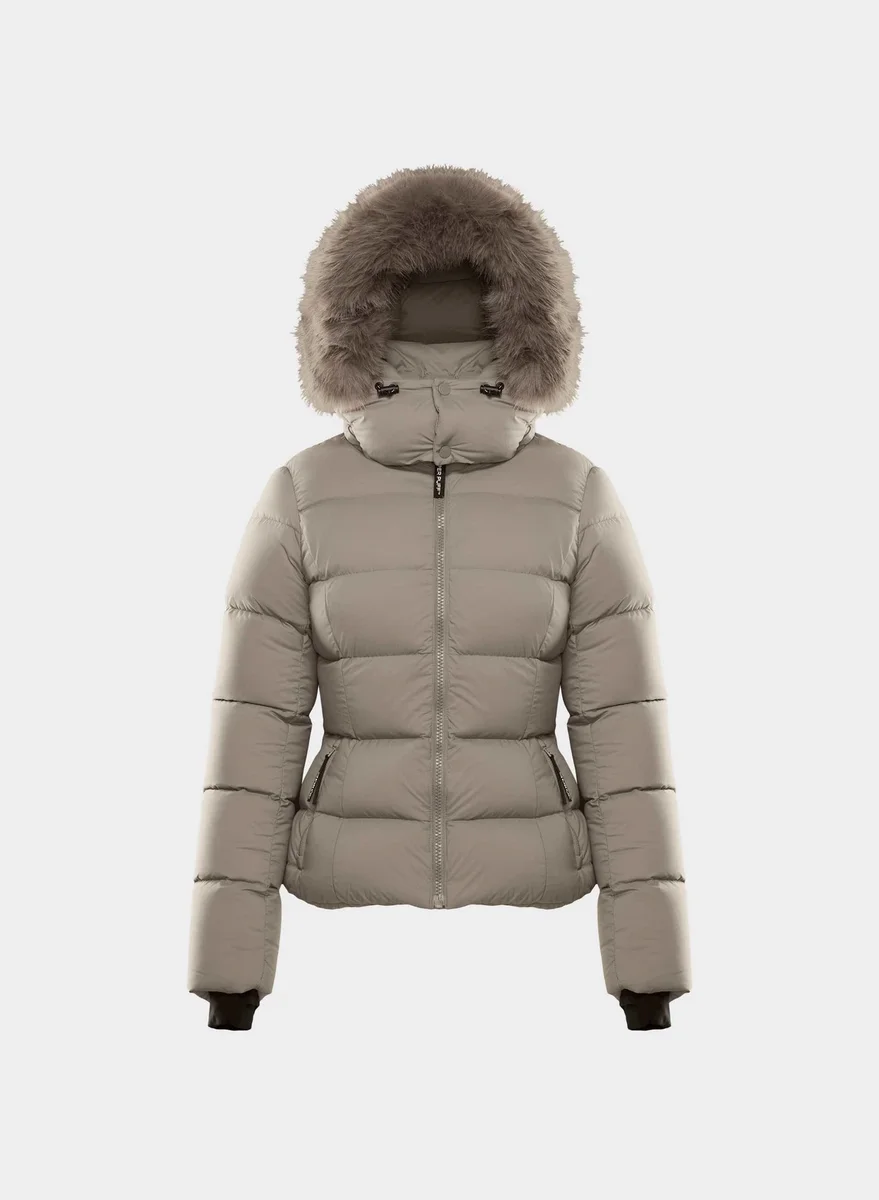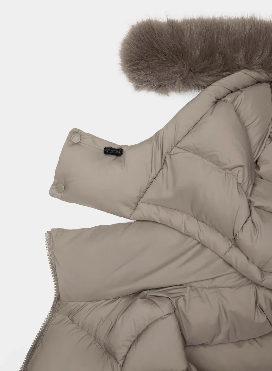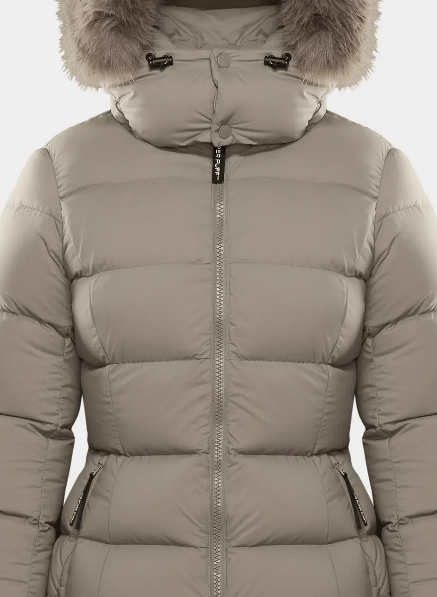 Japanese ripstop premium down hourglass puffer jacket with Real Faux Fur trim