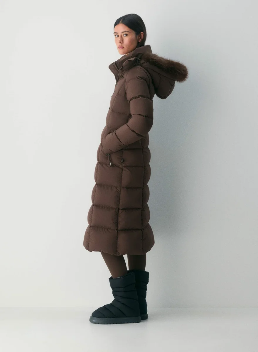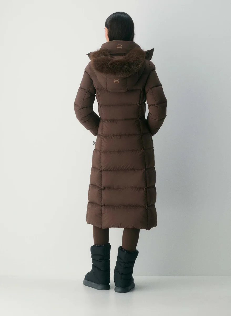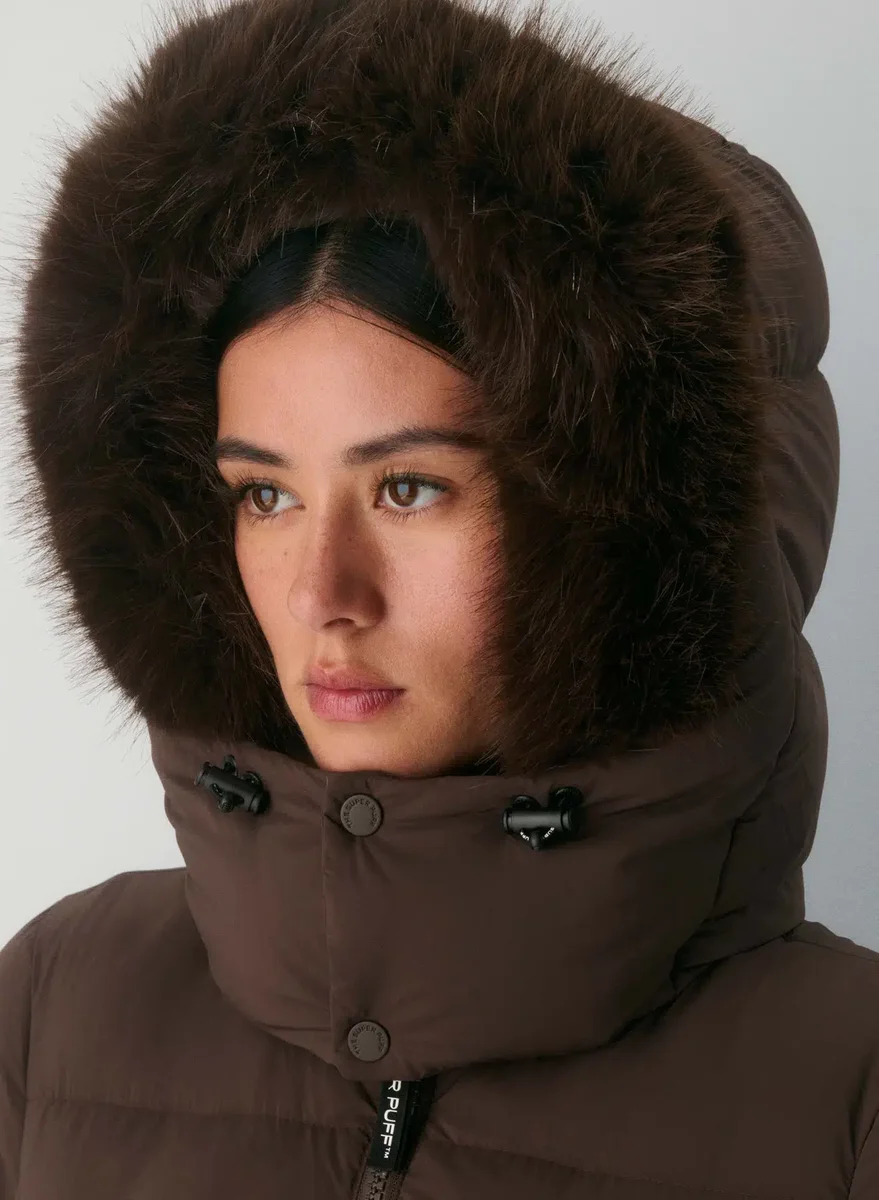 Japanese ripstop long premium down hourglass puffer jacket with Real Faux Fur trim