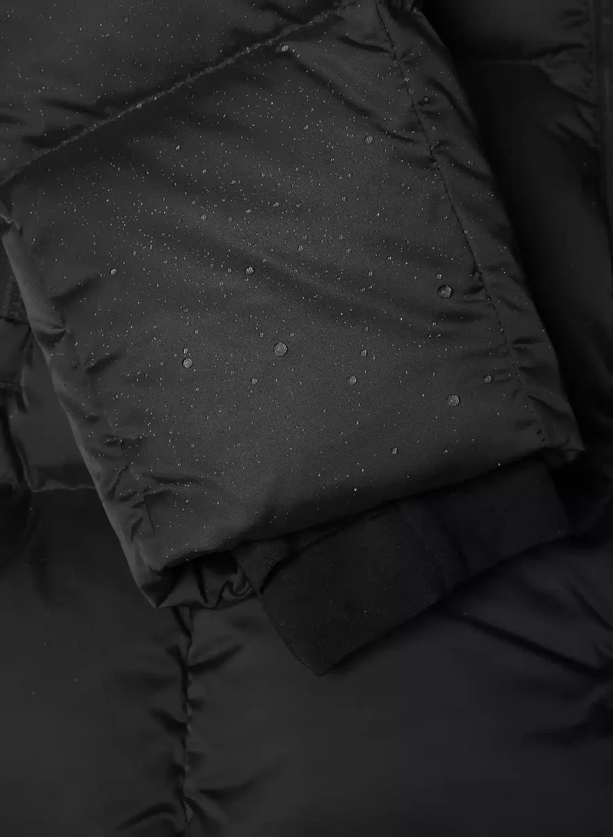 Content: 85% nylon, 15% elastane; Lining: 85% nylon, 15% elastane; Cuff: 80% nylon, 20% elastane; Body Fill: 90% goose down, 10% goose feathers; Centre Front Collar Tab Fill: 100% polyester; Storm Flap Fill: 100% polyester