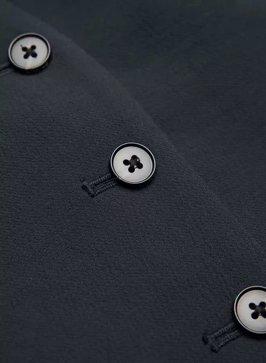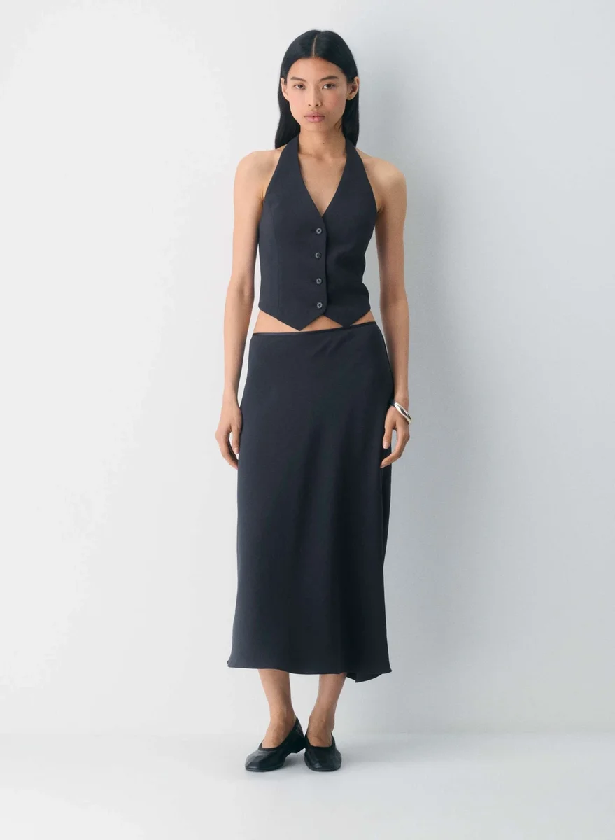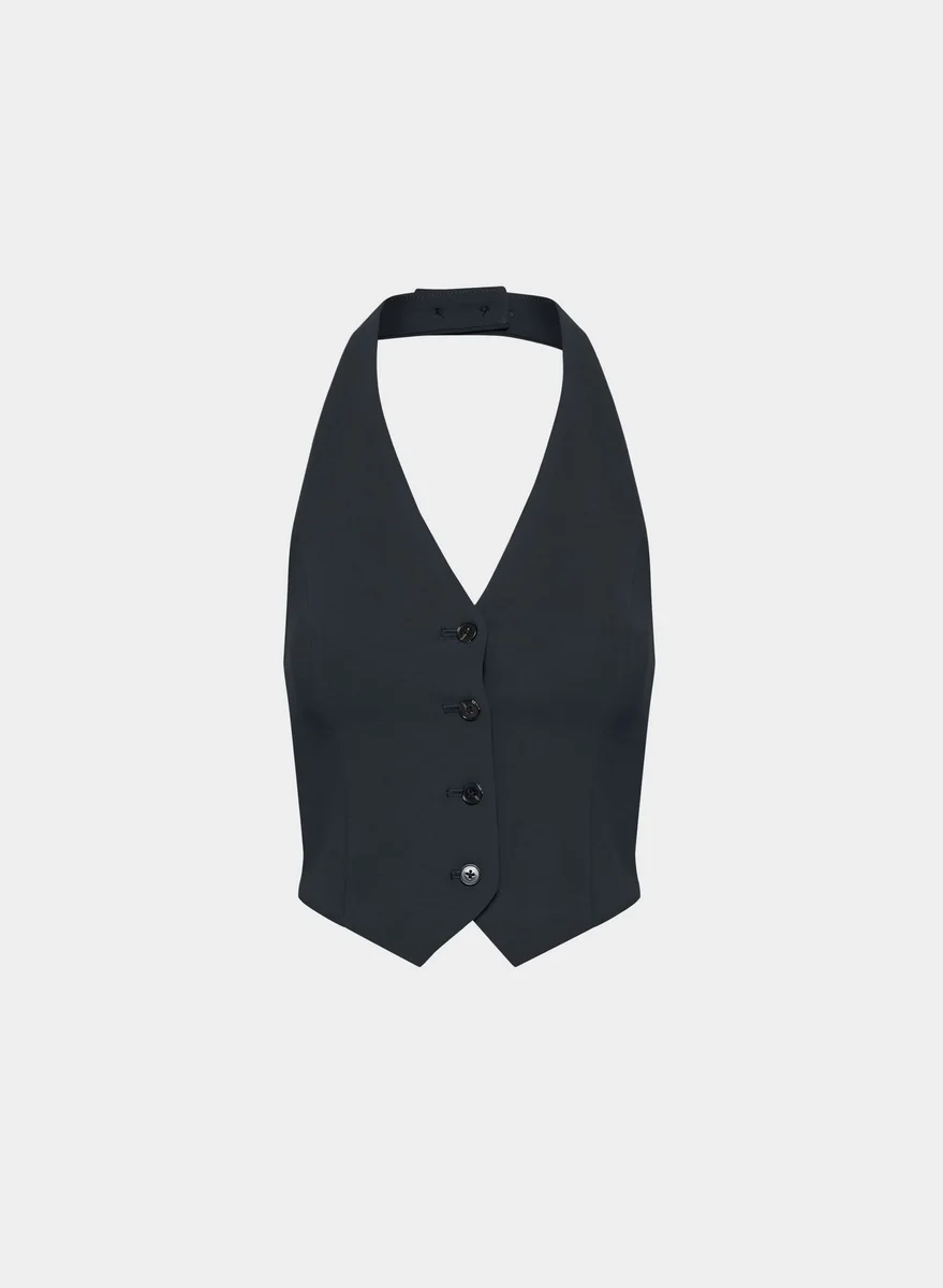 This is a halterneck vest with a V neckline and slim fit. It’s expertly tailored with Crepette™ — our one-of-a-kind Japanese crepe fabric beloved for its subtle texture, breezy drape and the fact that it basically never wrinkles.