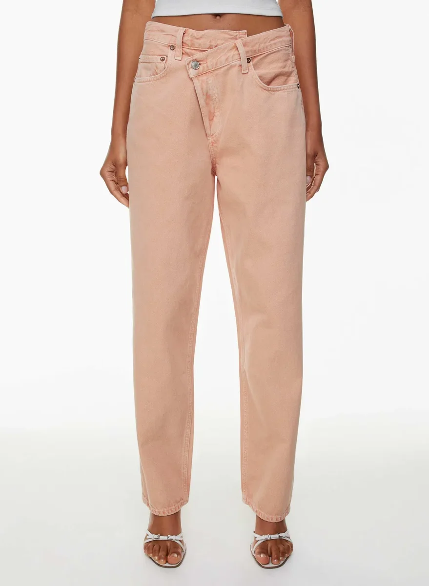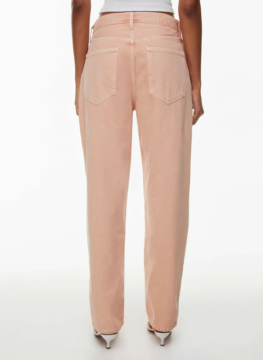 A cult favourite, these are high-rise jeans with a slouchy, relaxed fit and criss-cross button fly. They’re made with non-stretch 100% organic cotton denim with a subtle drape. This version comes in a soft pink wash with a clean hem.