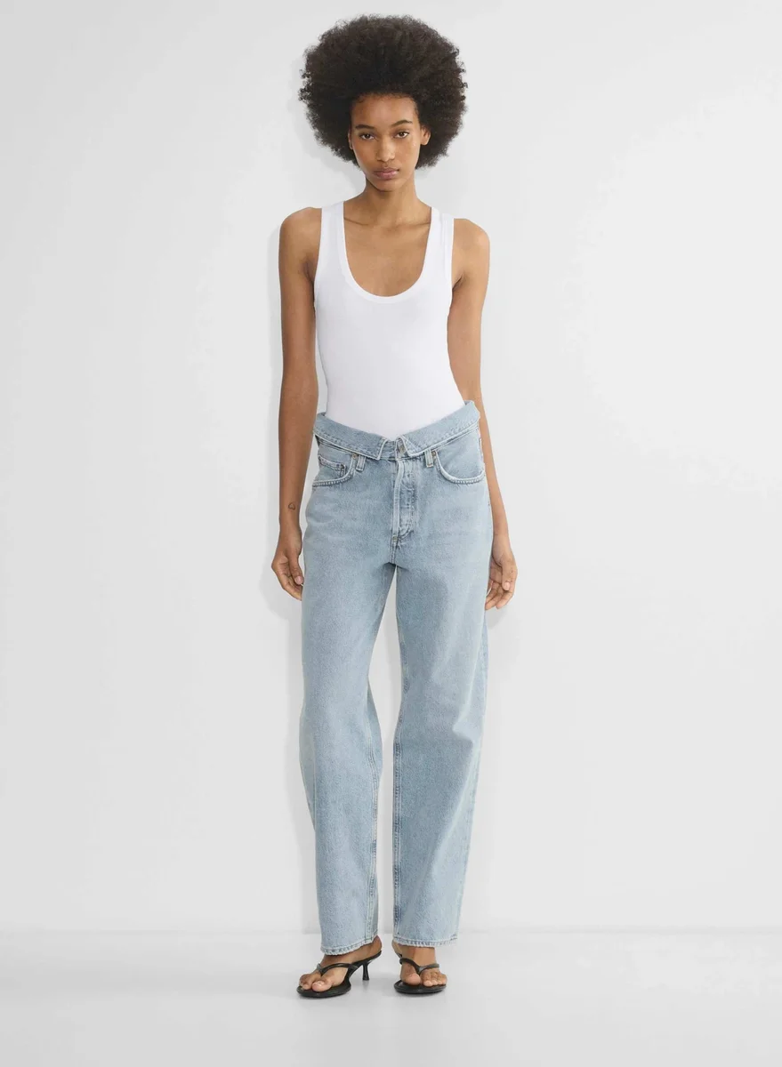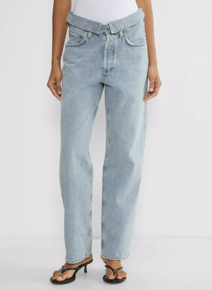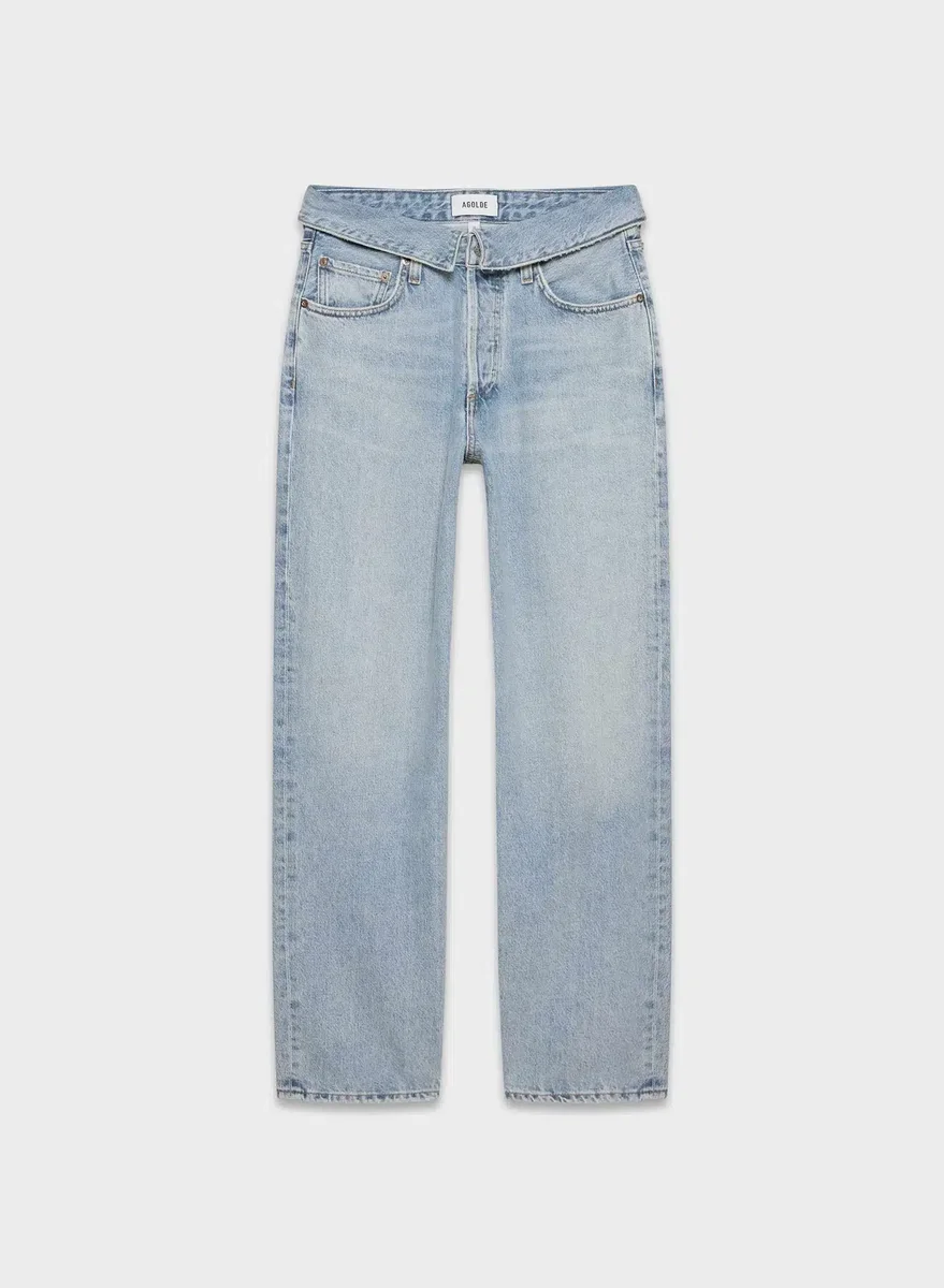 Waistband origamiThese are high-rise, wide-leg jeans with a relaxed fit and foldover waistband. They’re made with non-stretch 100% regenerative cotton denim with a soft finish. This version comes in a light indigo wash with fading and whiskering. It has a finished hem.