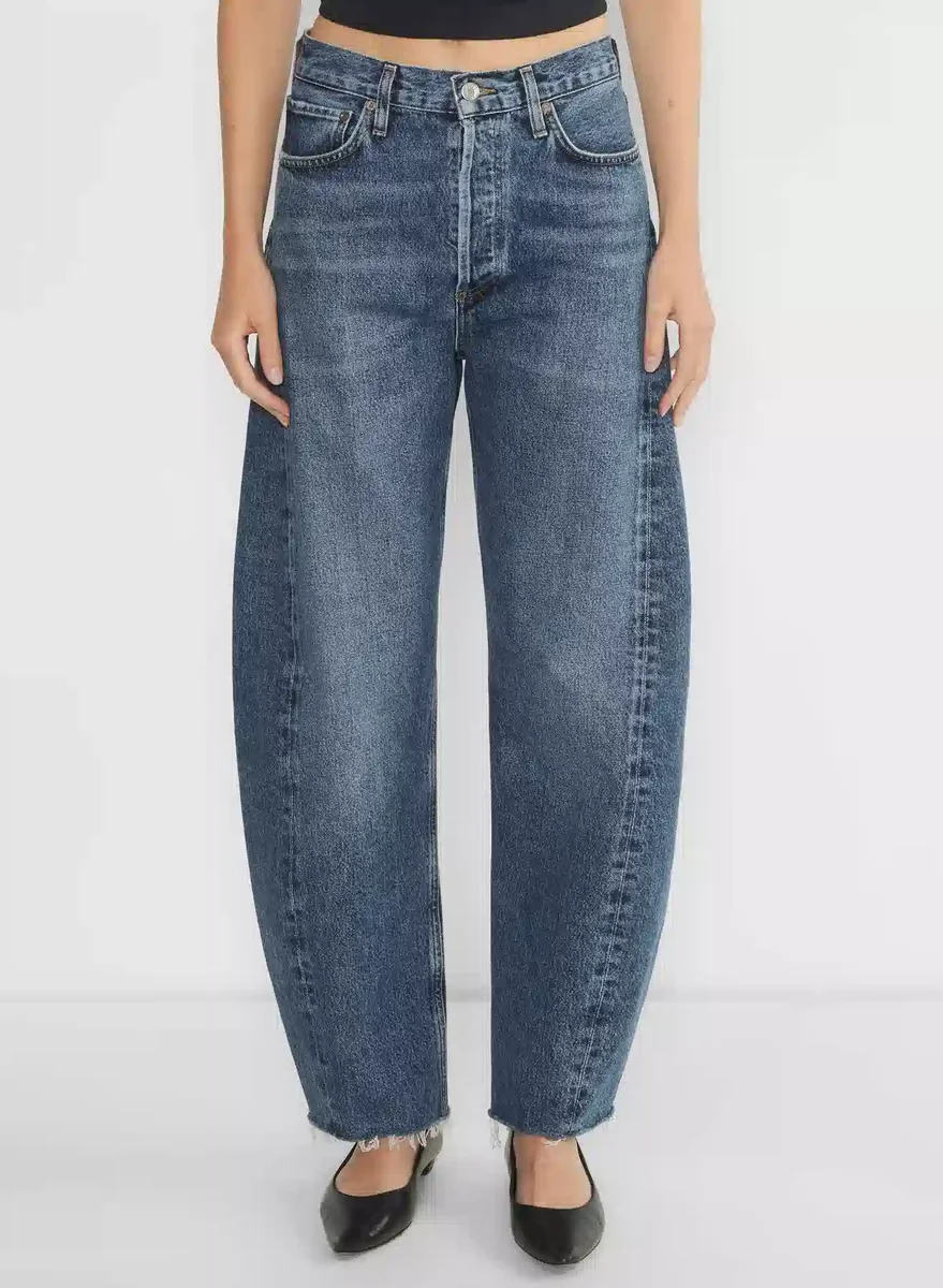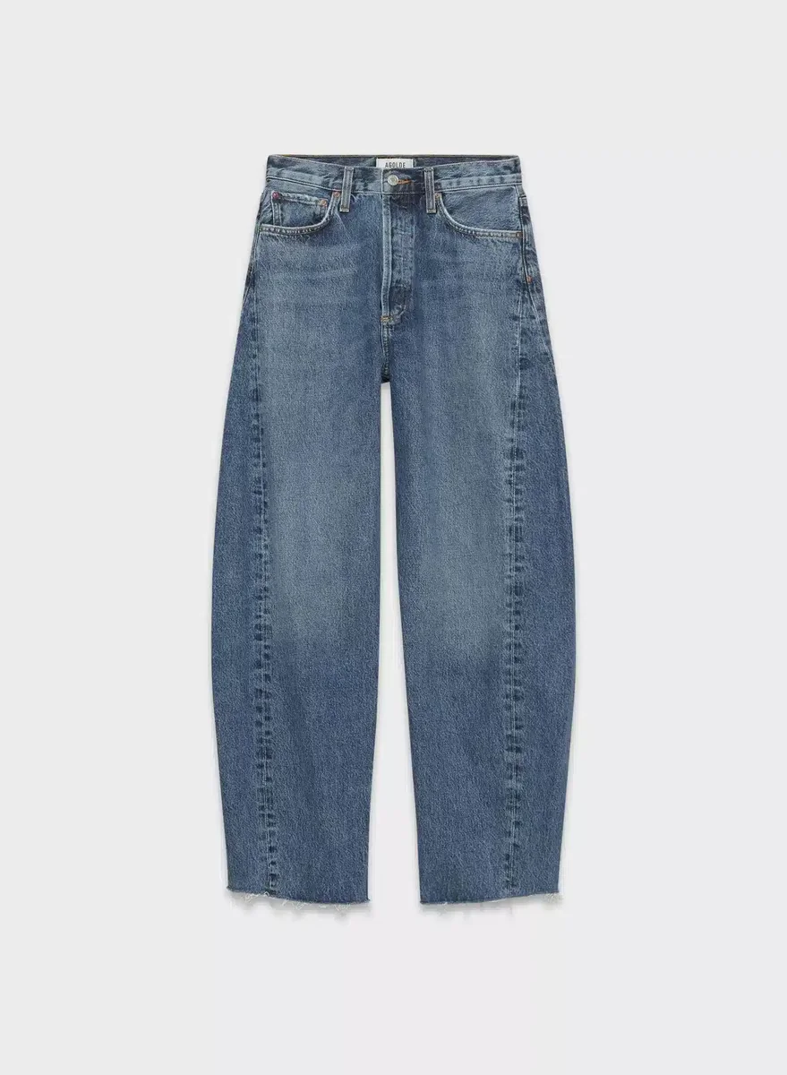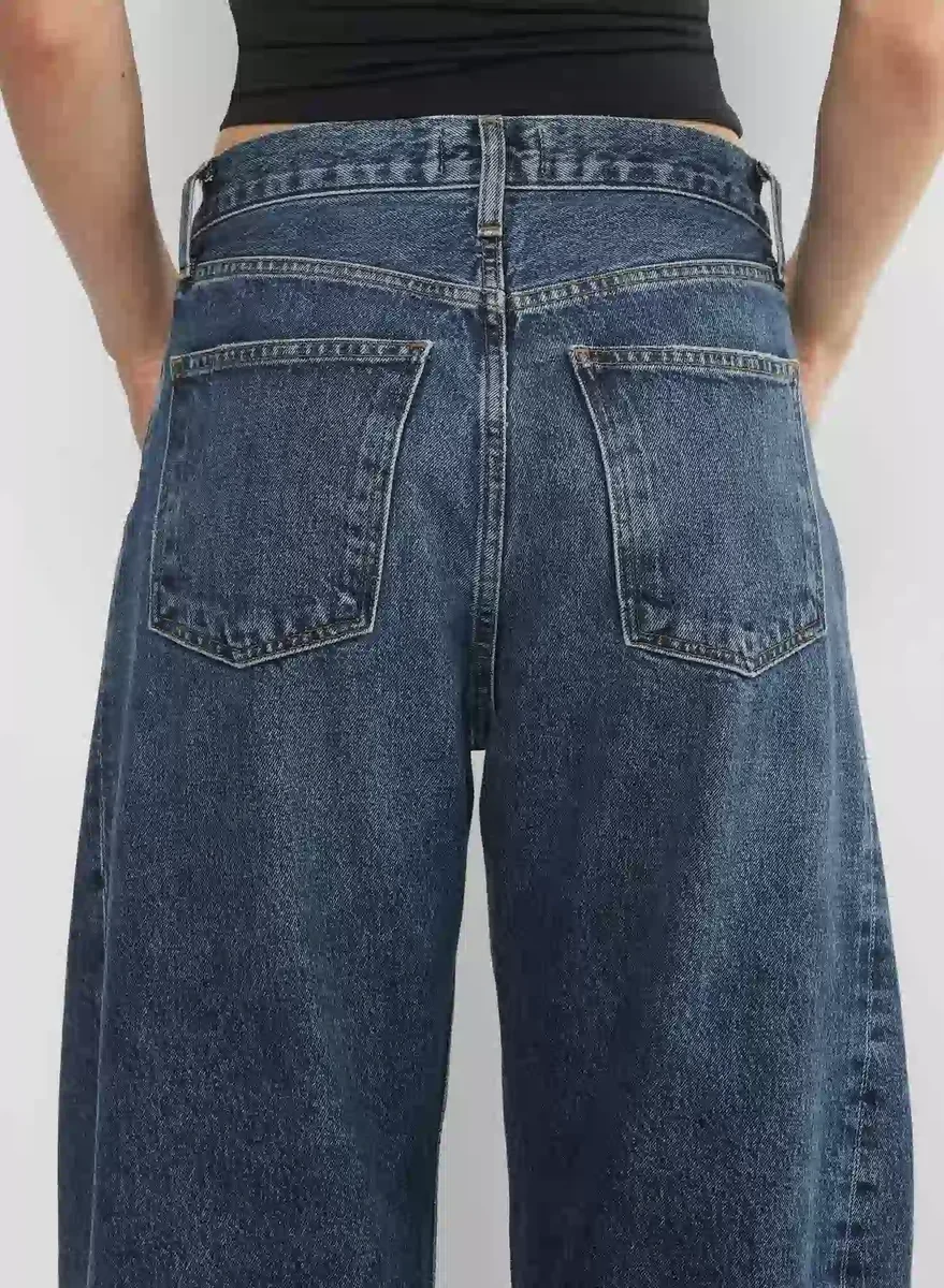 These are high-rise jeans with a bowed-leg silhouette, full-length inseam and pieced insert detailing. They’re cut from non-stretch, heavyweight regenerative cotton that only grows softer with wear. This version comes in a vintage dark indigo wash with heavy fading and whiskering and has a raw hem.