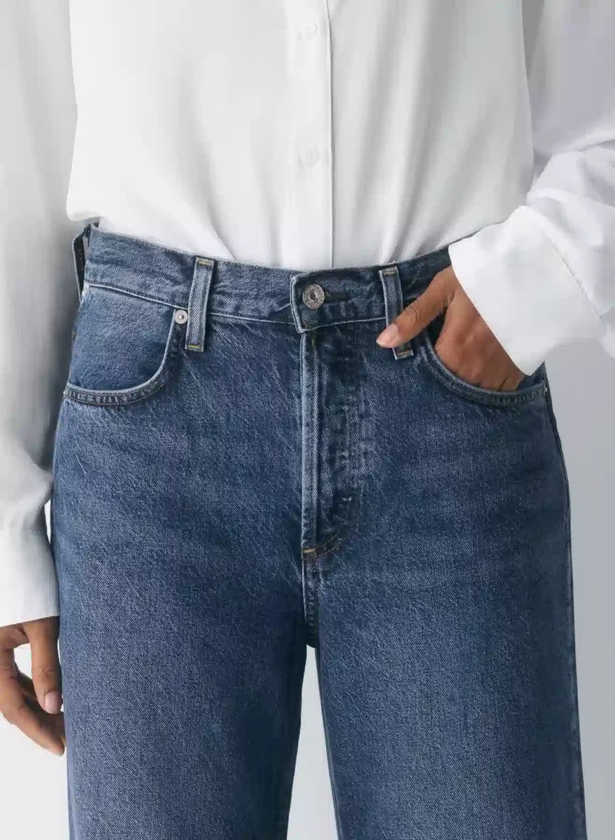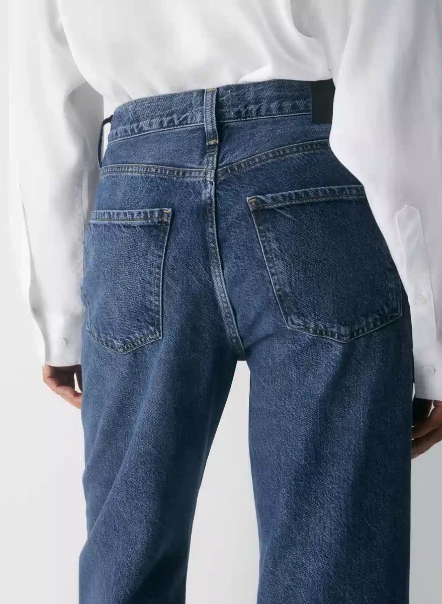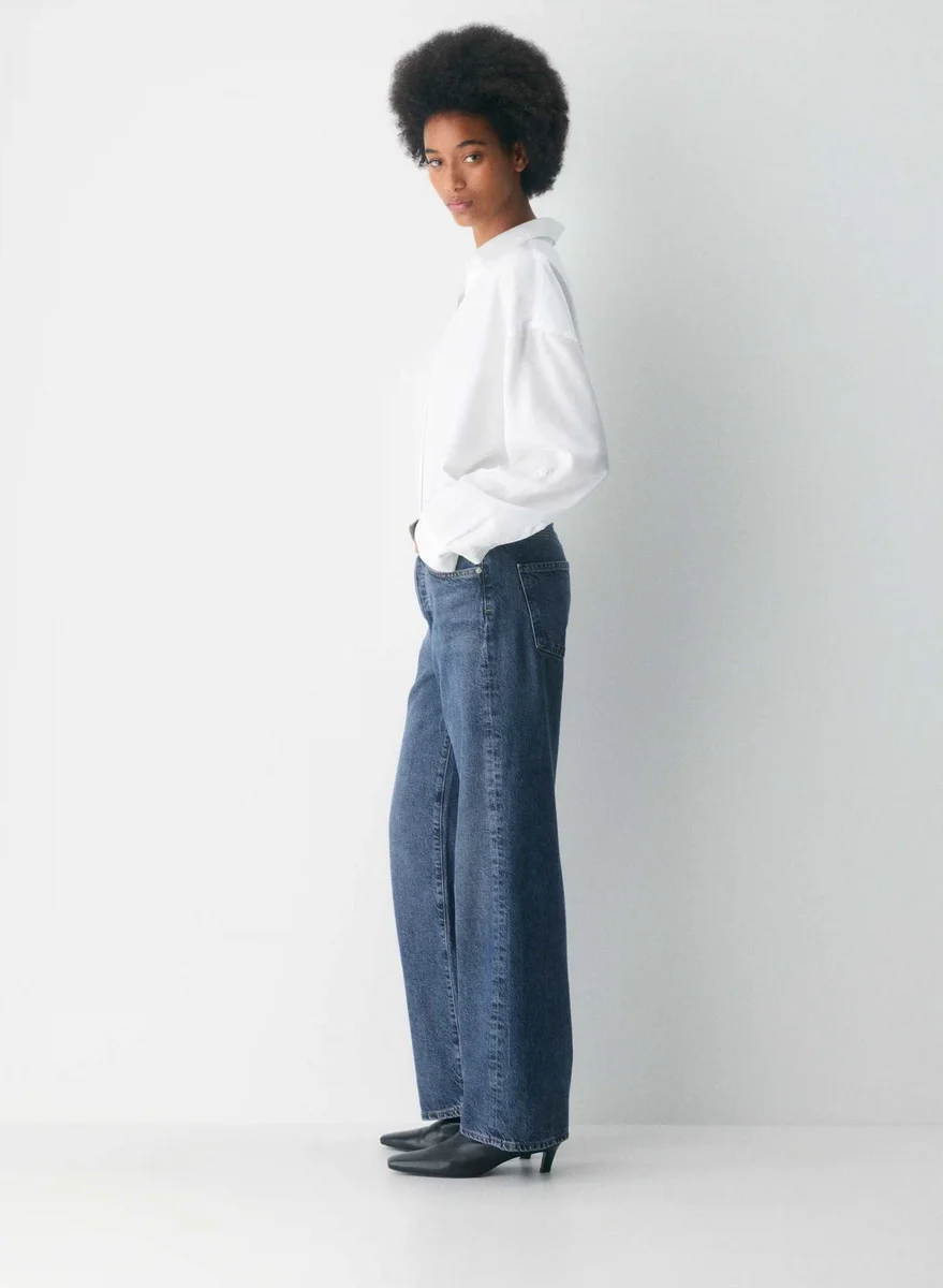 These are high-rise jeans with an easy-fitting top block and an ultra-relaxed wide leg. They’re made with rigid recycled cotton denim with a vintage feel. This version comes in a dark indigo wash with fading, whiskering and a finished hem.