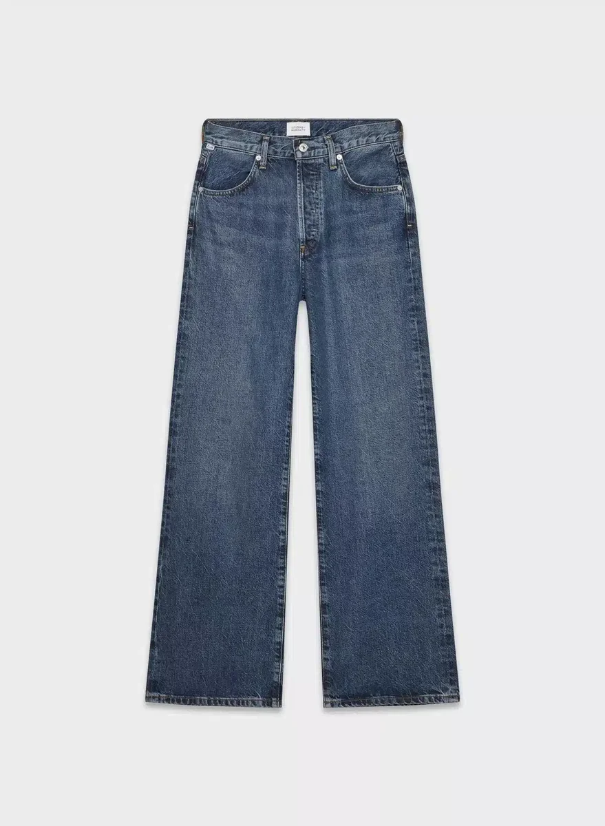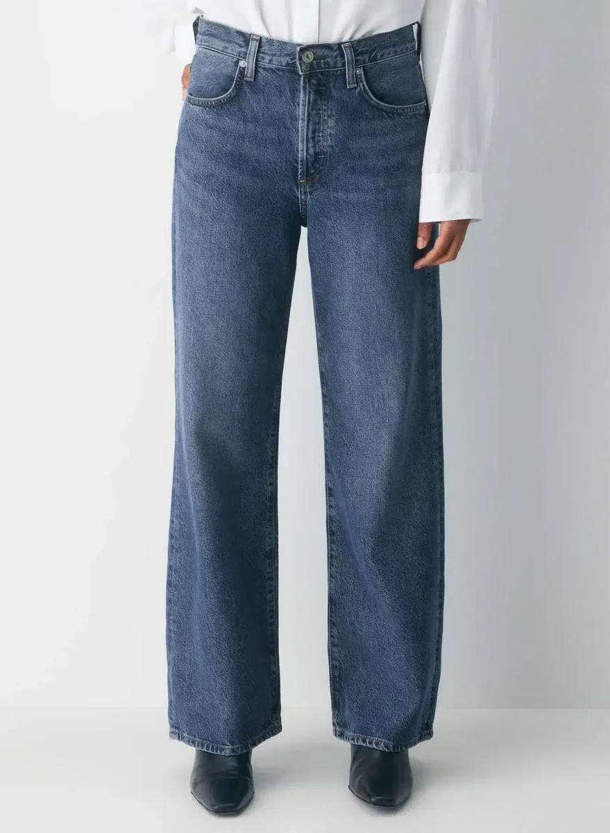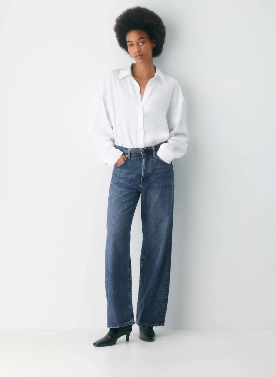 These are high-rise jeans with an easy-fitting top block and an ultra-relaxed wide leg. They’re made with rigid recycled cotton denim with a vintage feel. This version comes in a dark indigo wash with fading, whiskering and a finished hem.