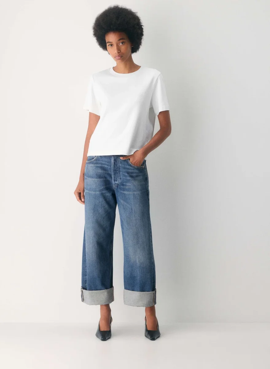 Roll callThese are high-rise jeans with a wide, oversized leg that can be rolled up. They’re made in the USA from non-stretch 100% regenerative cotton denim