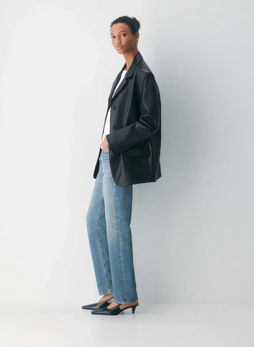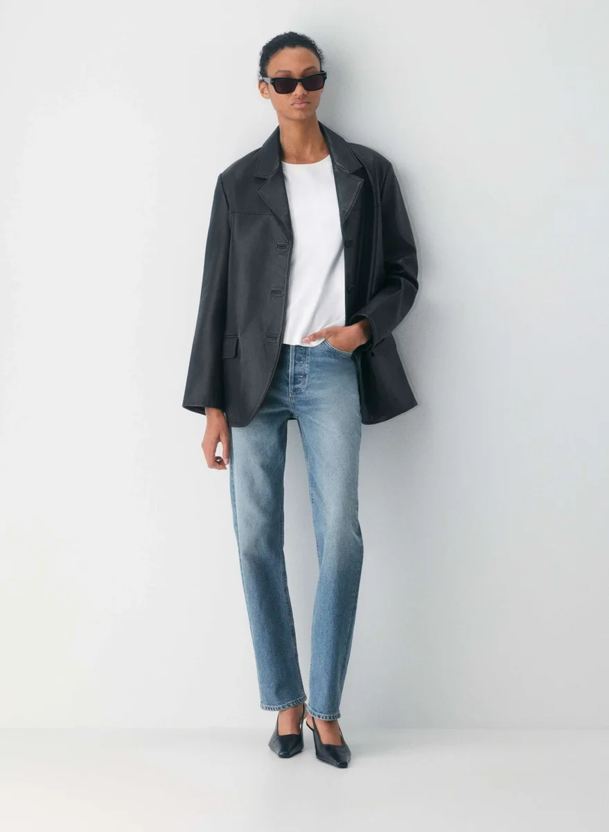 These are high-rise jeans with a straight leg. They’re cut from Japanese comfort-stretch denim. This version comes in a medium indigo wash with subtle fading, marbling and whiskering.