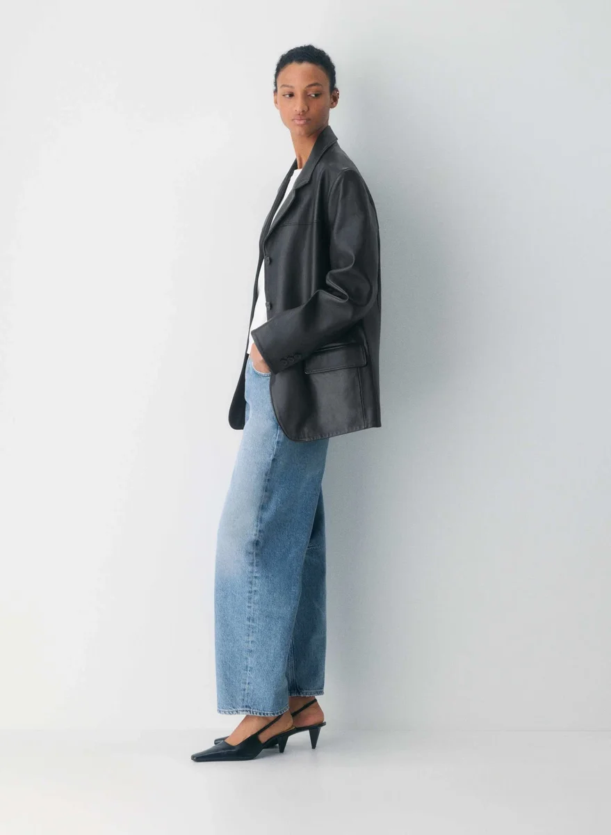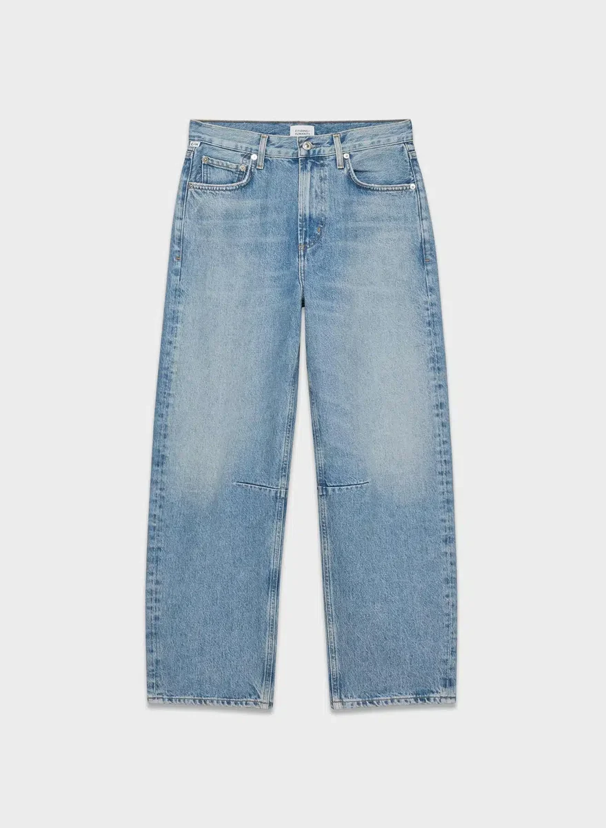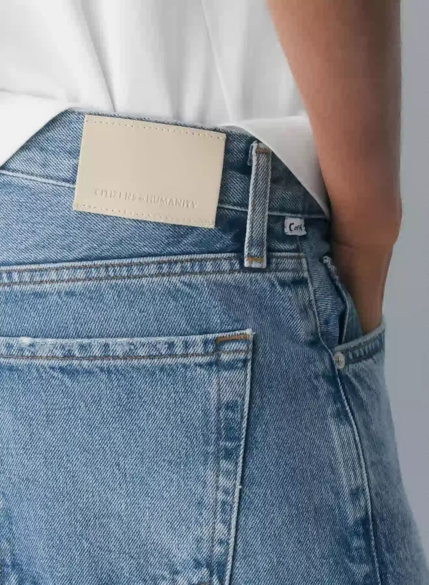 Bronco’s outsideThese are high-rise jeans with a tapered take on the baggy-leg silhouette. They’re made with non-stretch 100% regenerative cotton. This version comes in an indigo wash with whiskering and marbling.