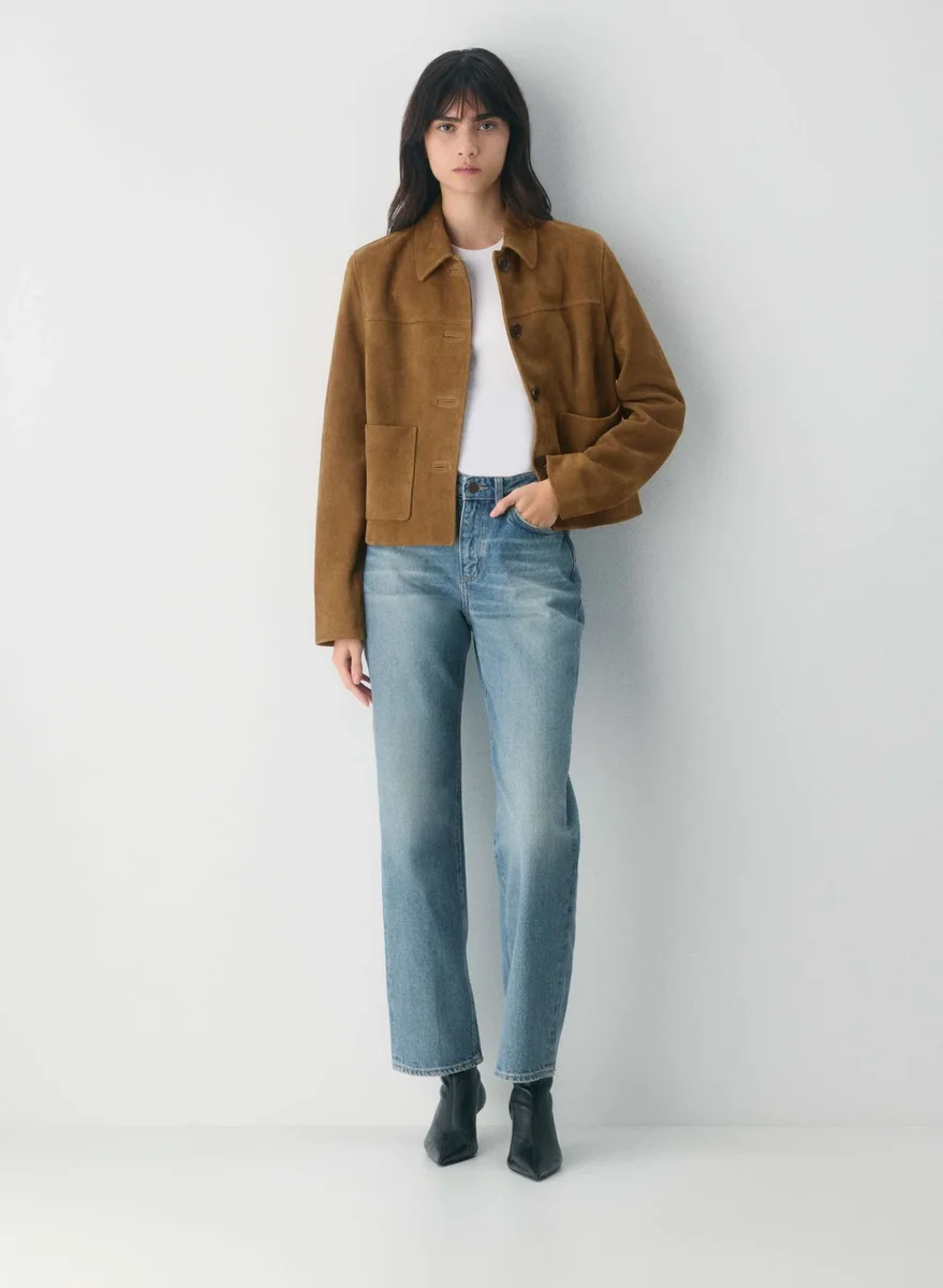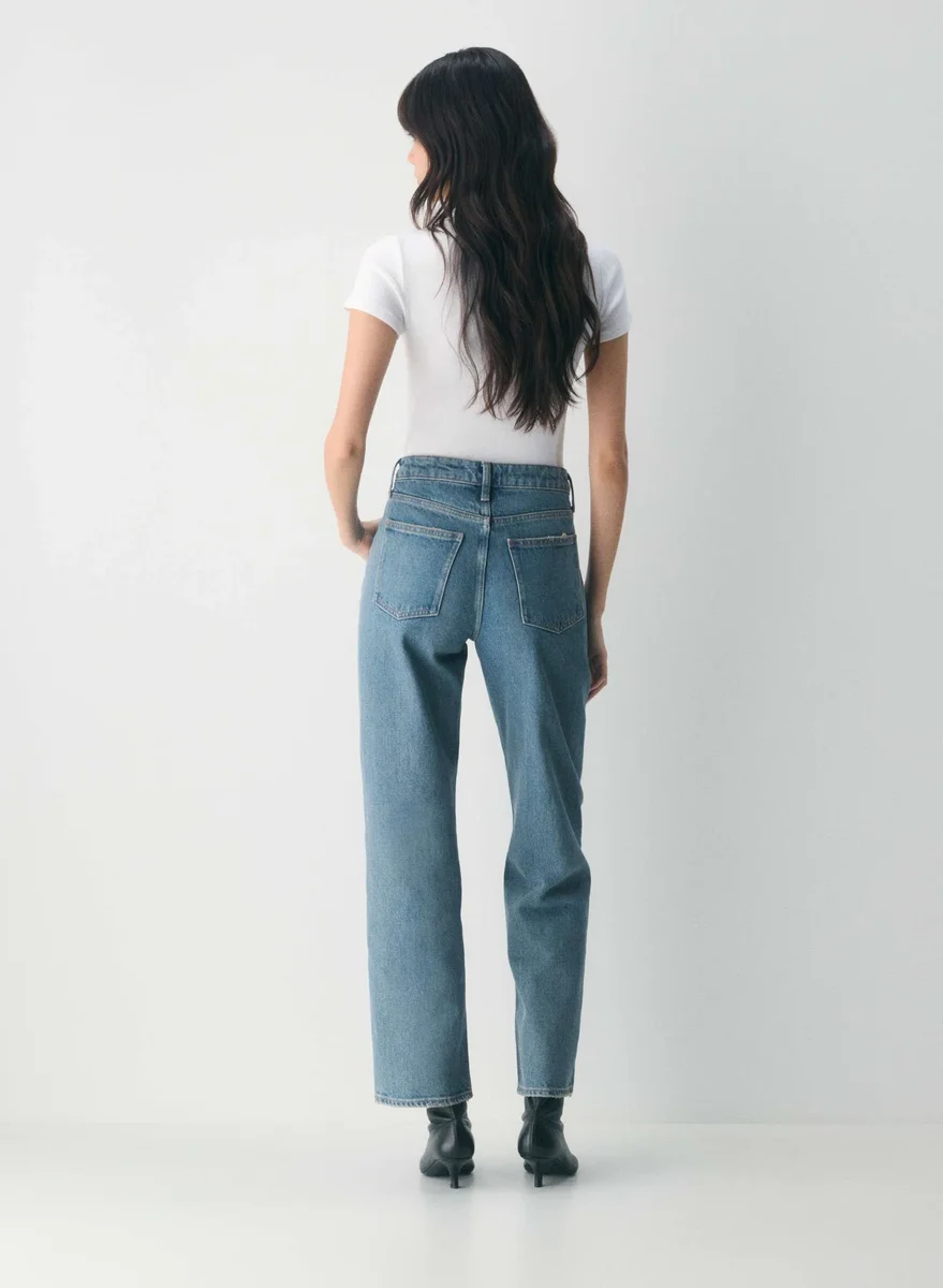 These are mid-rise jeans with a relaxed fit and straight leg. They’re cut from soft cotton denim with a hint of stretch for added comfort.