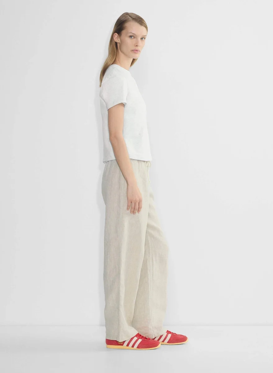 The outfit says vacation, even if you’re homeThese are pull-on wide leg pants with a drawcord waist and inseam pockets. They’re made from breathable 100% linen