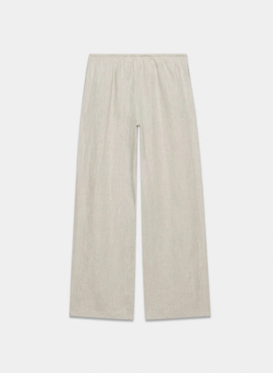 These are pull-on wide leg pants with a drawcord waist and inseam pockets. They’re made from breathable 100% linen with a subtle natural texture and soft, airy feel.