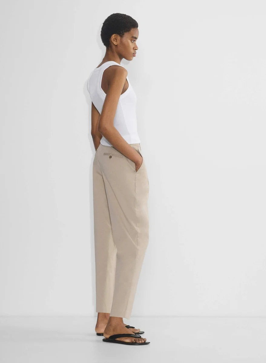 These are pleated mid-rise trousers with slash pockets and a relaxed fit. They’re made with Aritzia’s Chino — stretch cotton twill with a peachy feel. This fabric is easy-care and perfect for year-round wear. It’s made with 97% regenerative cotton.