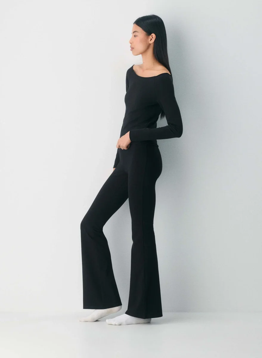 These are flare pull-on pants with a ribbed waistband. They’re made with a heavyweight version of Aritzia’s HomeStretch™ Smooth — body-hugging, stretch jersey fabric with a cottony soft feel. Your everyday smooth.