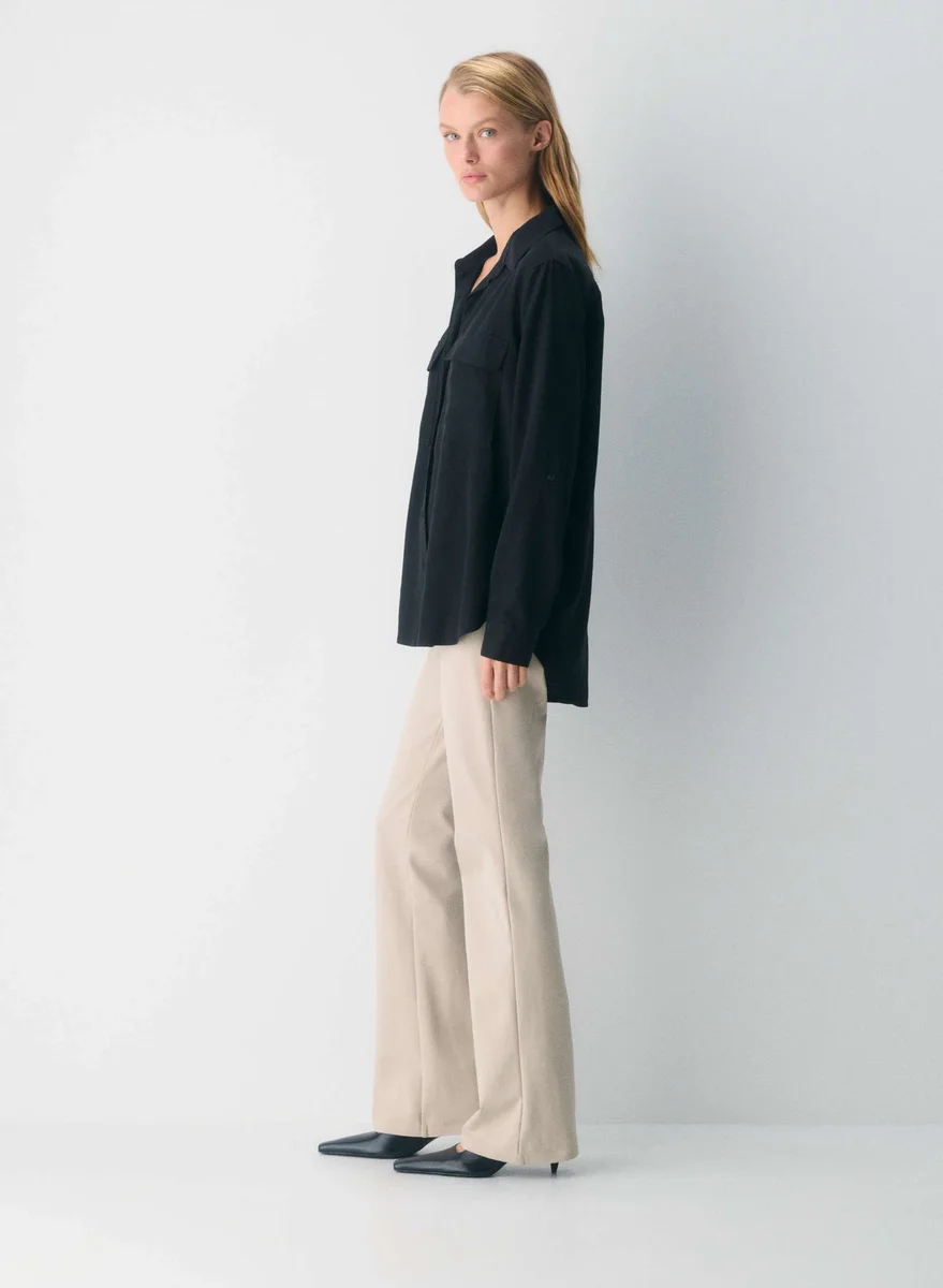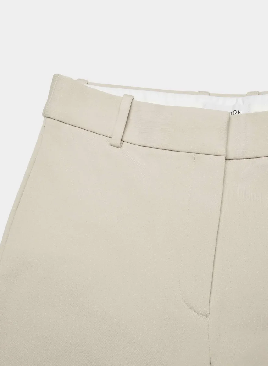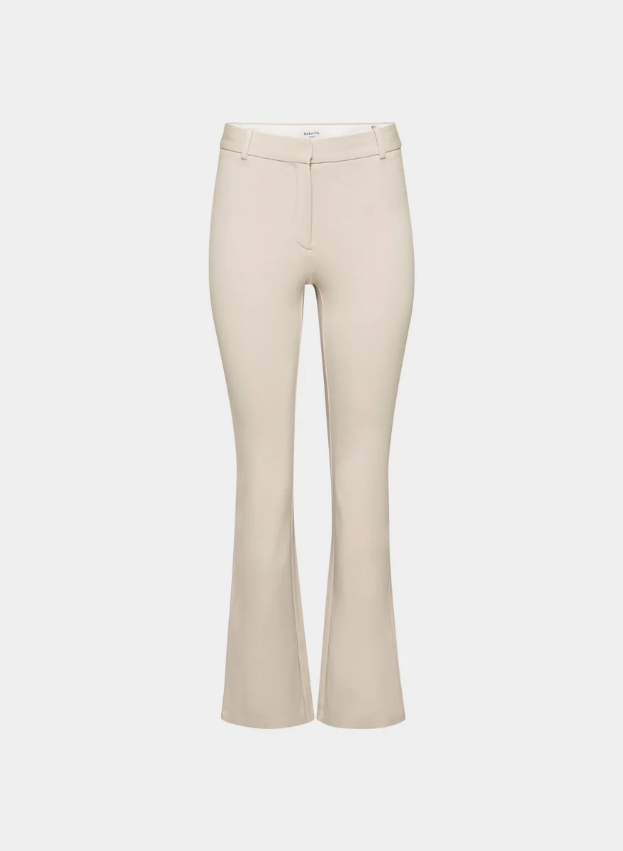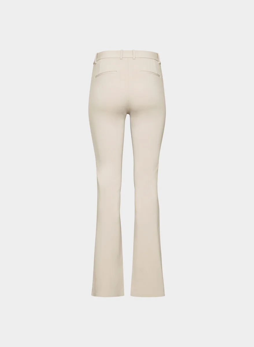 These are high-rise flared pants with back welt pockets and a slim fit. They’re made with smooth scuba fabric with double-knit, interlock construction that provides a refined look and soft-structured feel. This fabric is sourced from a premier Italian mill.
