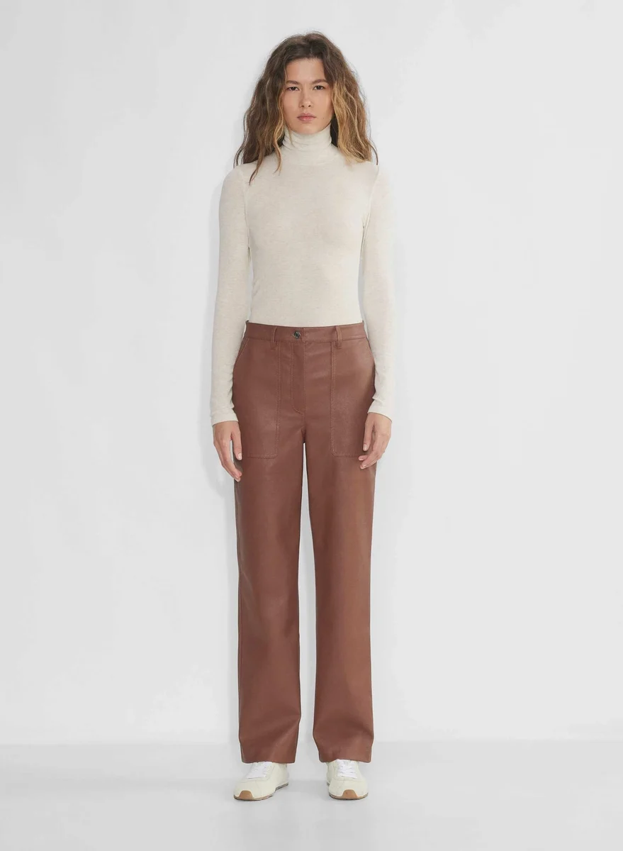 These are high-rise utility pants with patch hand pockets, a darted back waist and topstitch detailing throughout. They’re made with UnReal Leather — our timeless, innovative fabric with an authentic drape and soft sheen. Looks and feels so real, it’s kind of unreal.