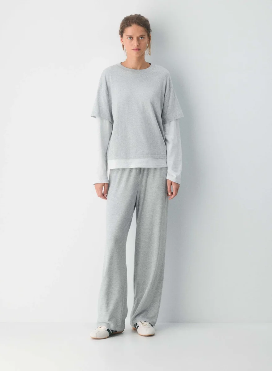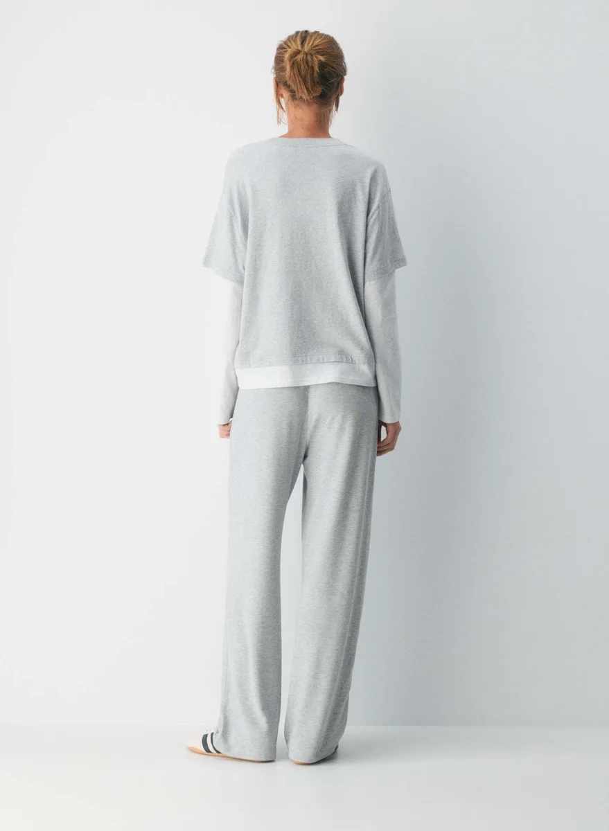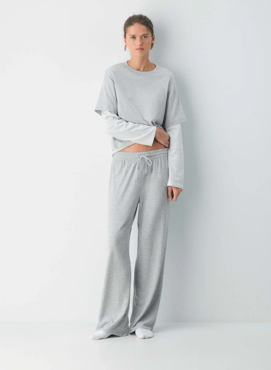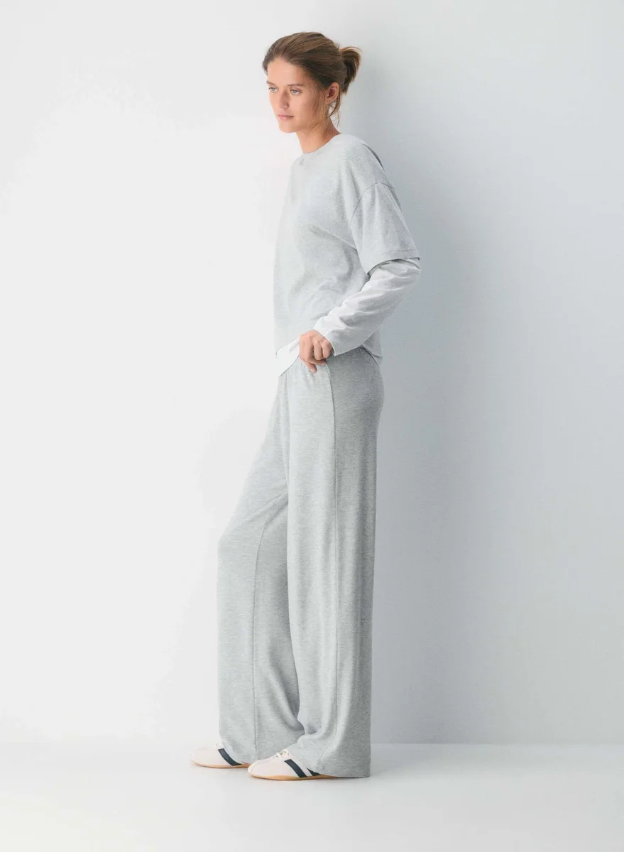 These are high-rise, wide-leg pull-on pants with a cinchable drawcord waist and a relaxed fit. They’re made from drapey, cozy-brushed jersey with a laid-back look.
