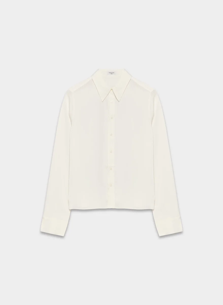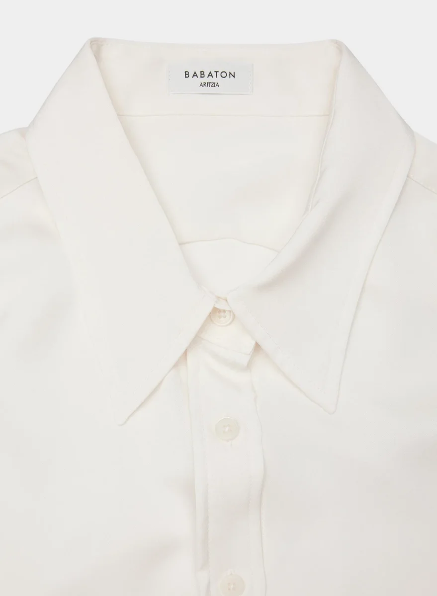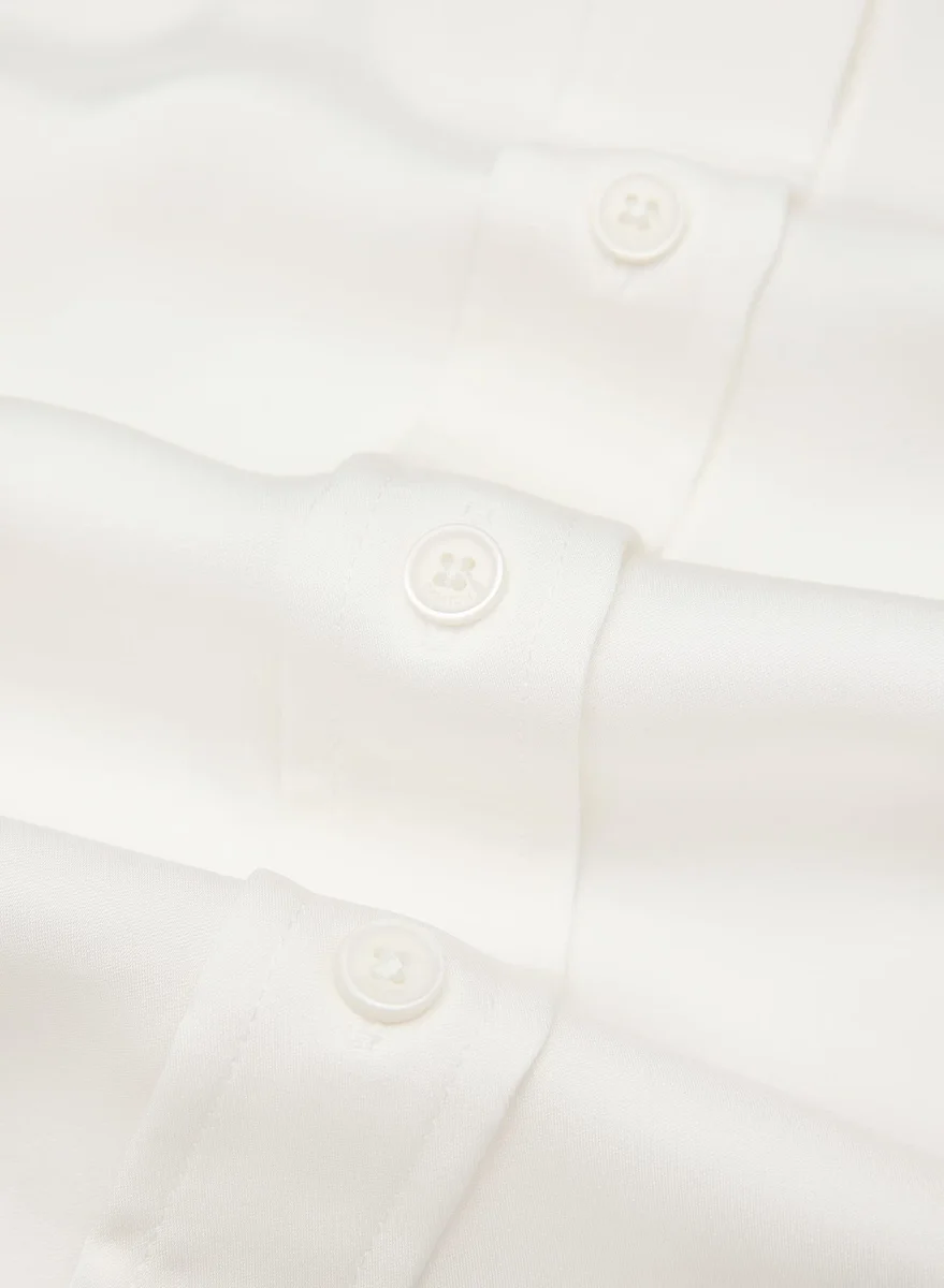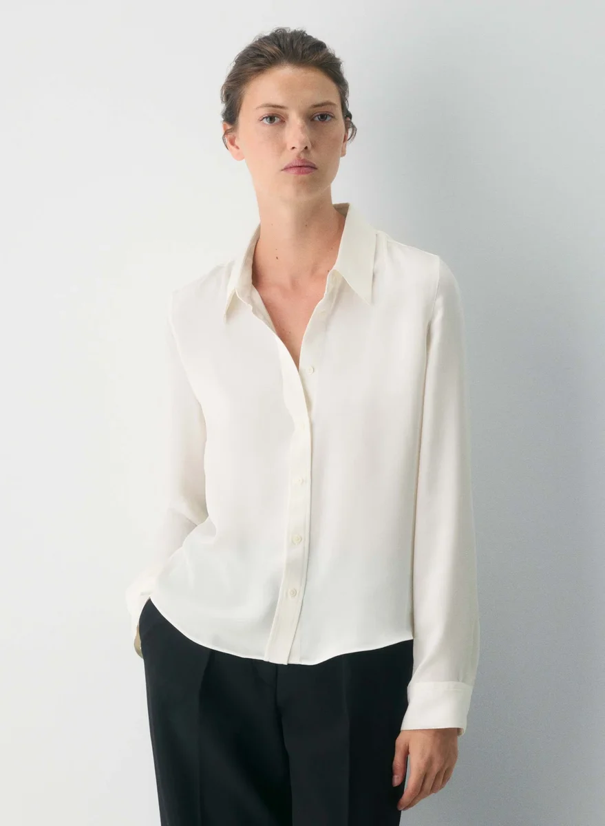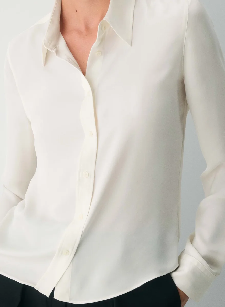 This is a button-up shirt with a classic fit. It’s cut from drapey Japanese double-faced satin with a soft sheen and luxurious next-to-skin feel.