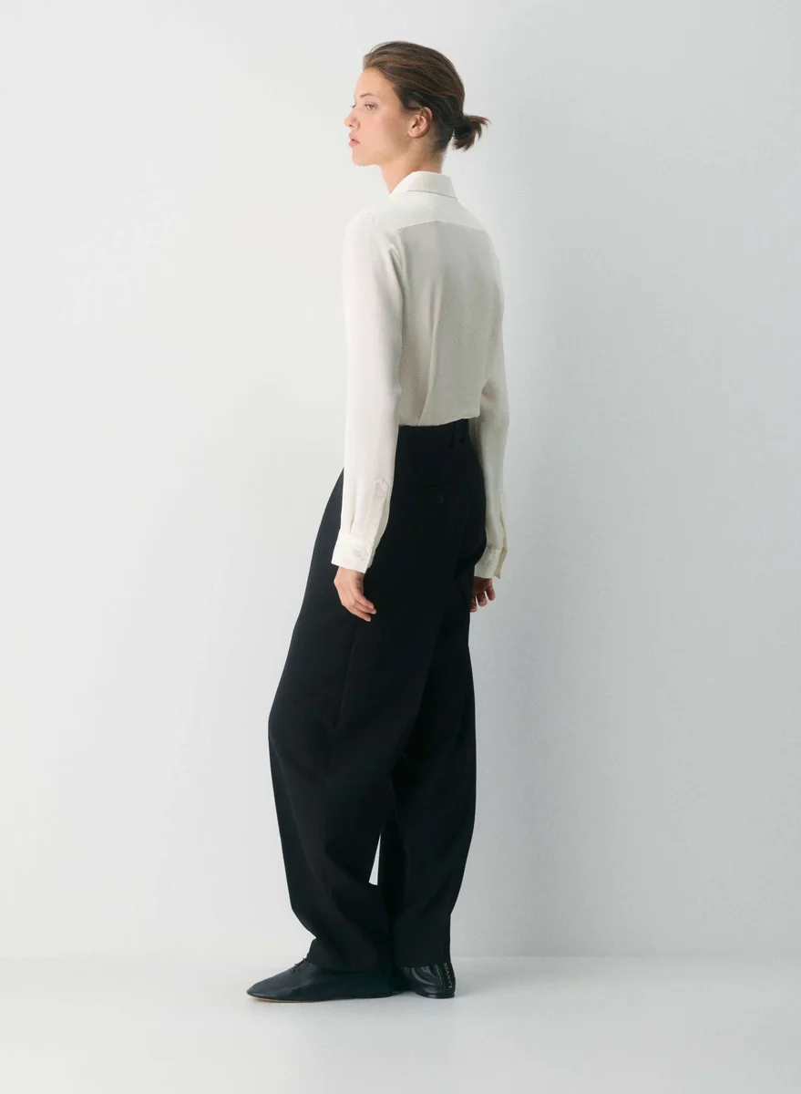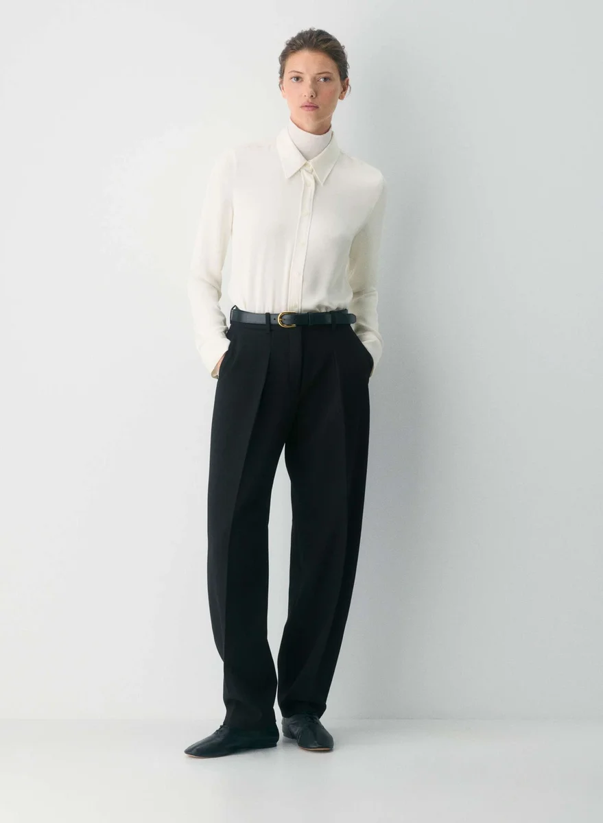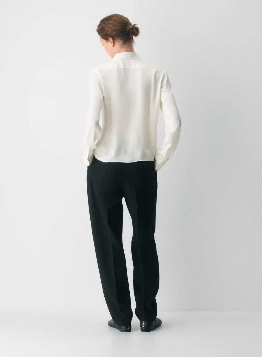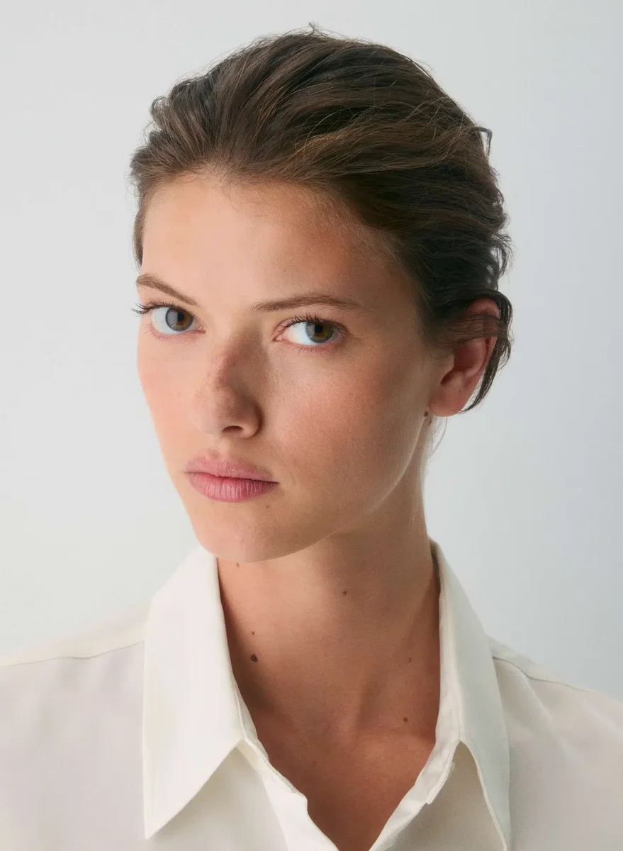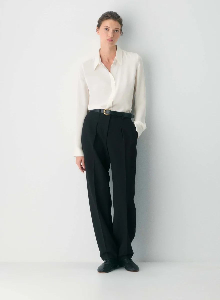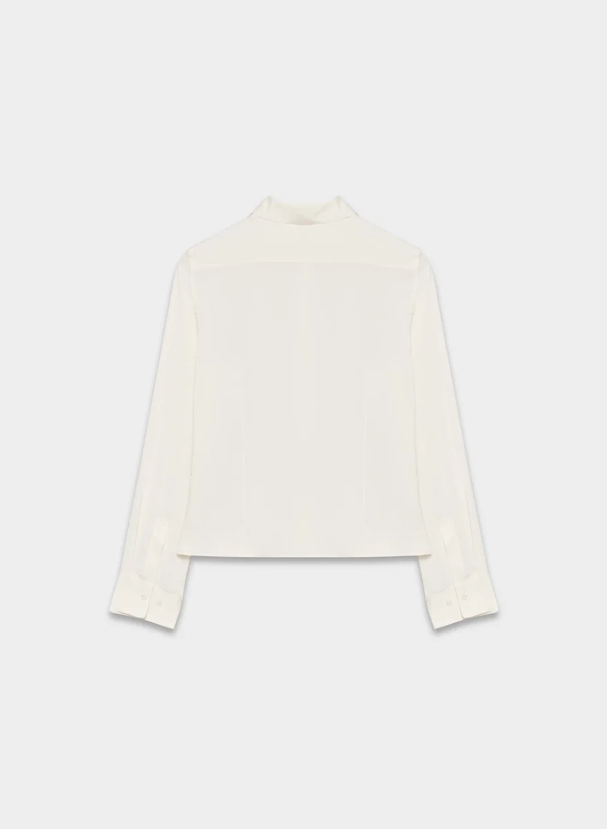 This is a button-up shirt with a classic fit. It’s cut from drapey Japanese double-faced satin with a soft sheen and luxurious next-to-skin feel.