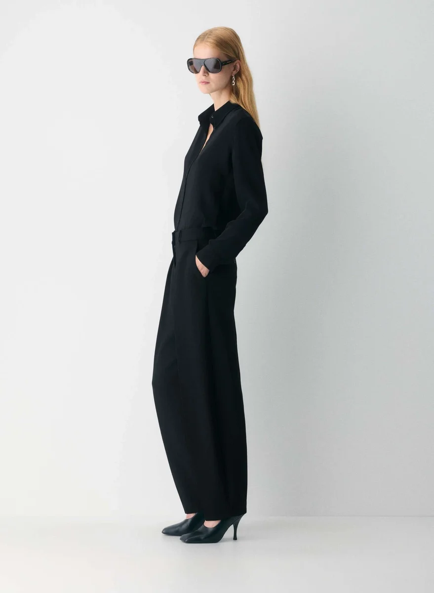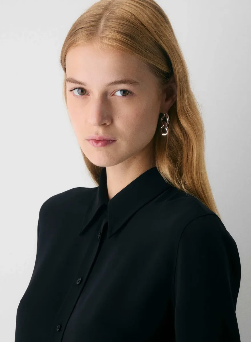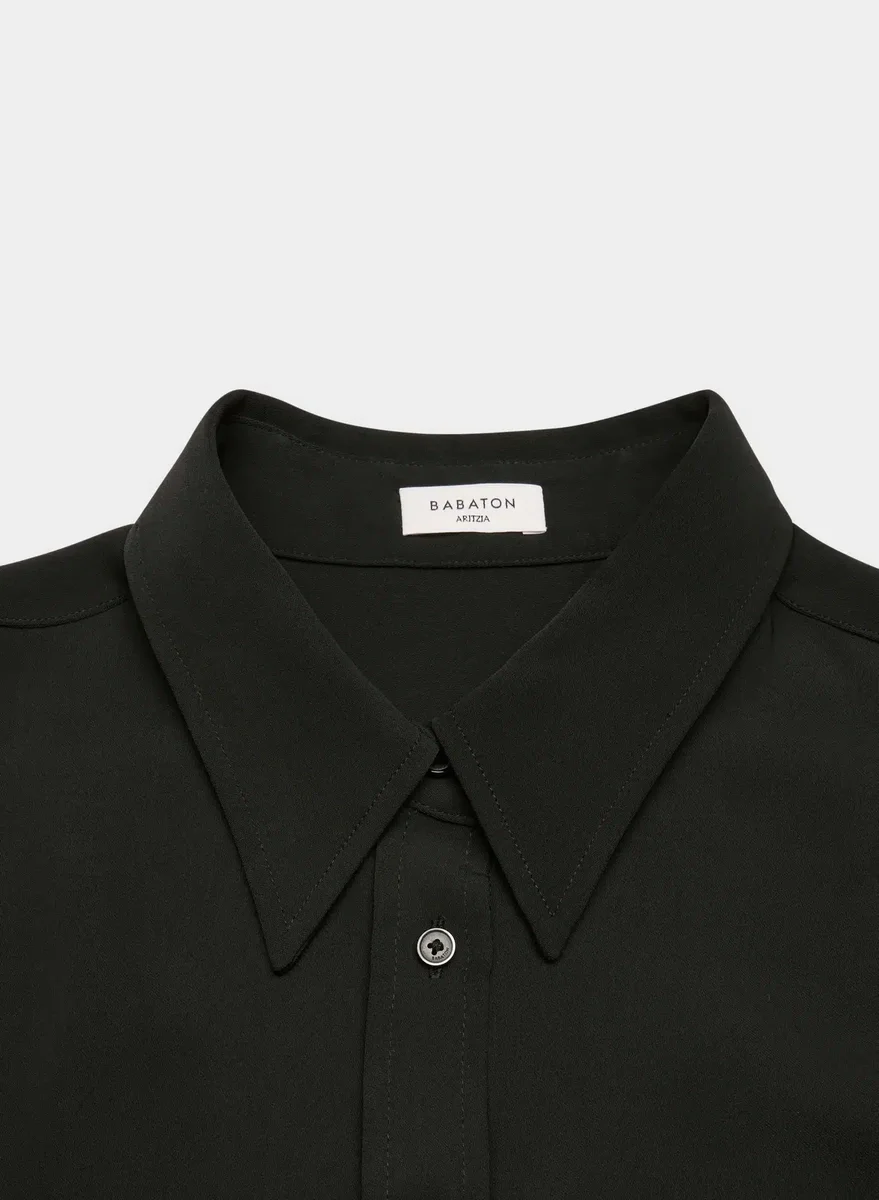 This is a button-up shirt with adjustable cuffs. It’s cut from Studio Drape — drapey matte satin with a smooth look and lightweight feel. This fabric is made with 50% recycled polyester.