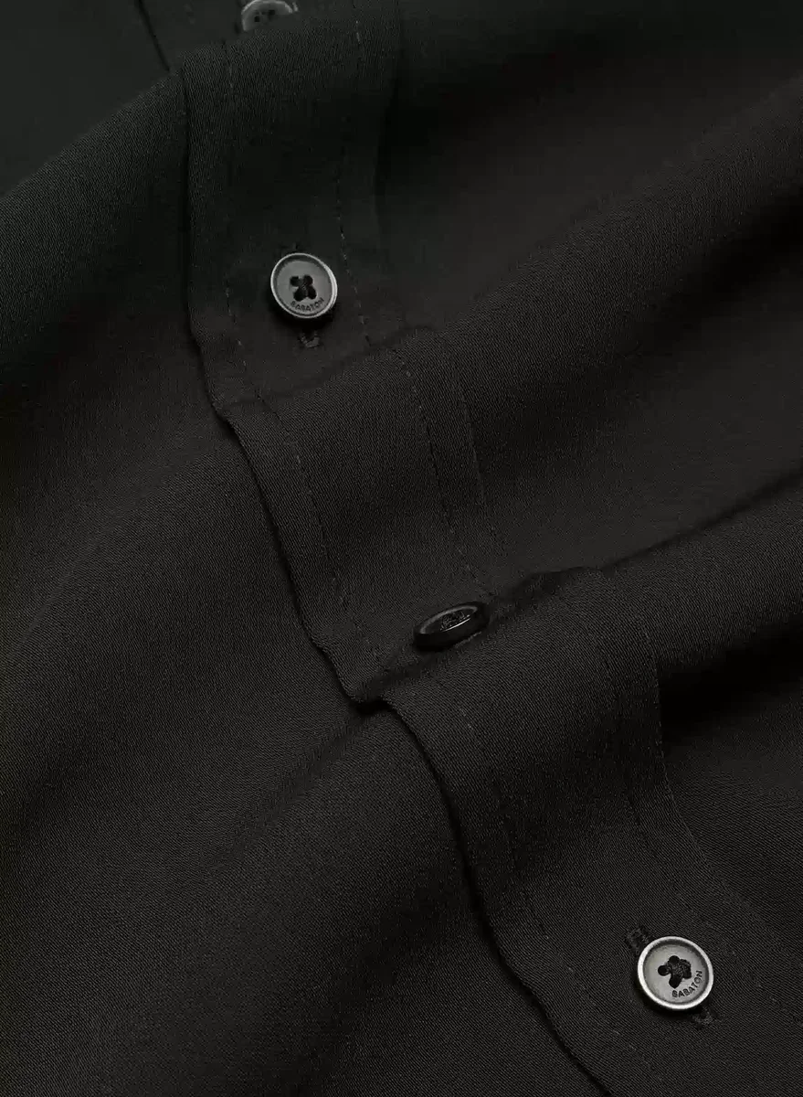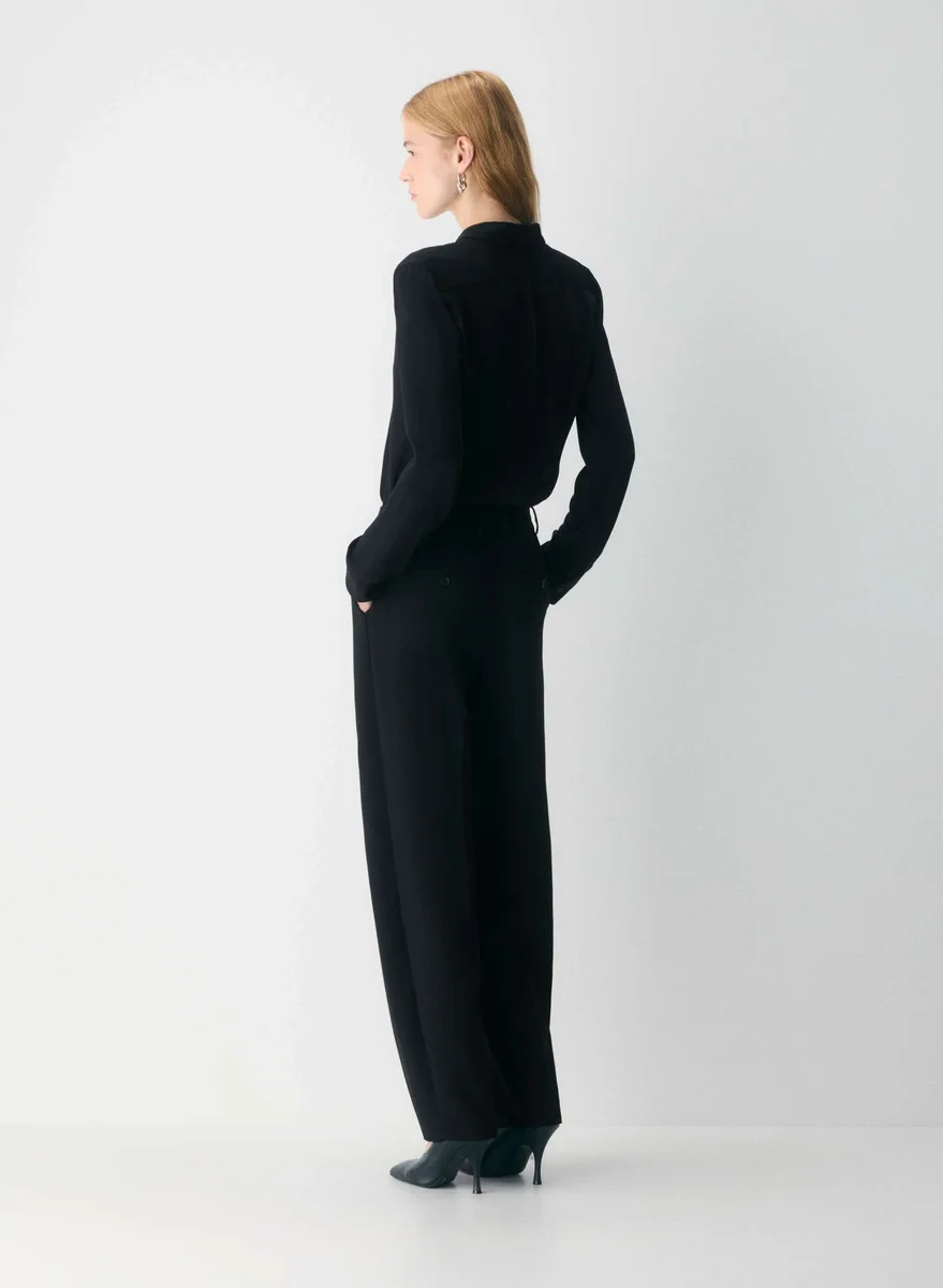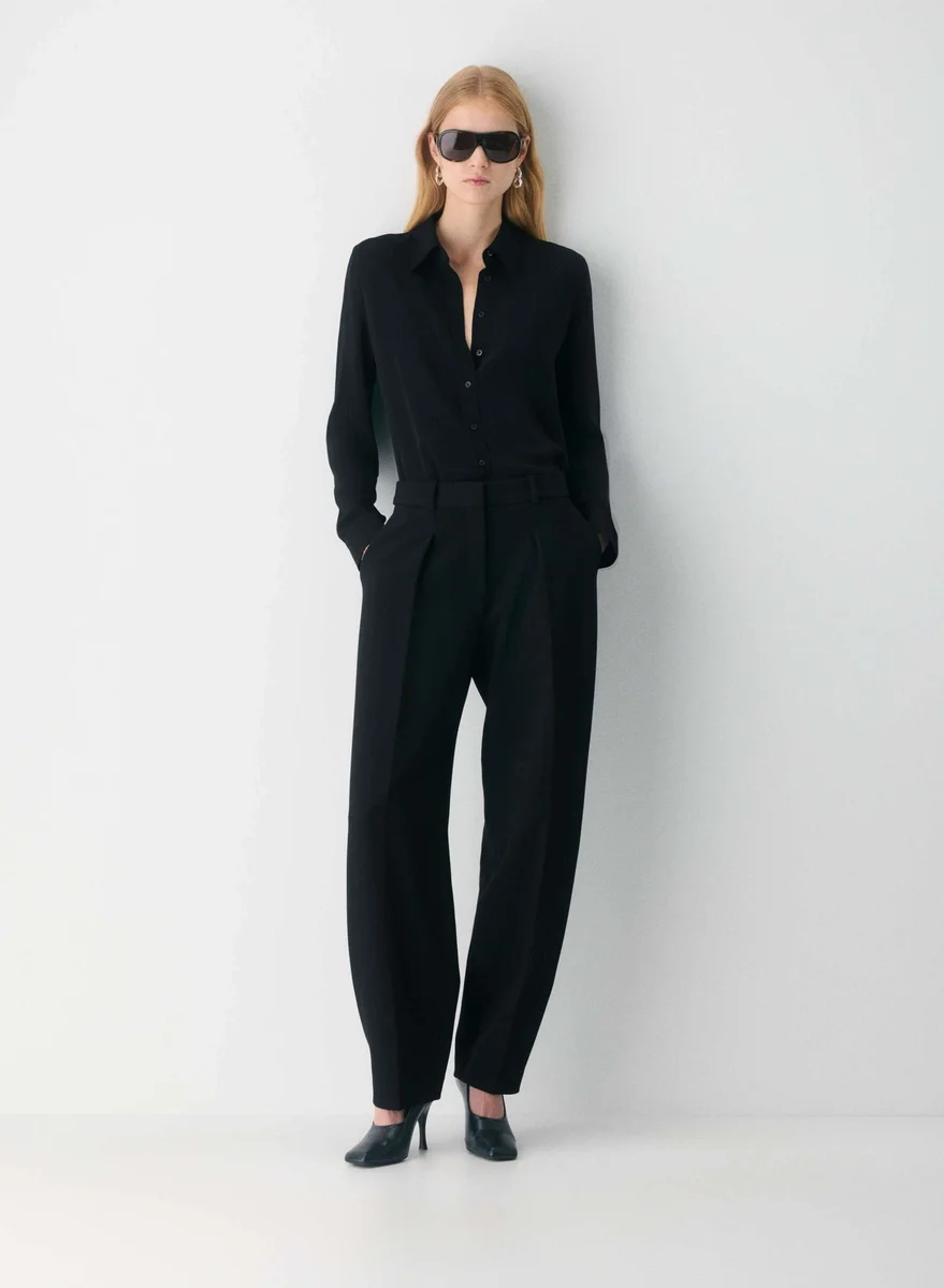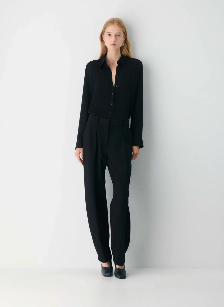 This is a button-up shirt with adjustable cuffs. It’s cut from Studio Drape — drapey matte satin with a smooth look and lightweight feel. This fabric is made with 50% recycled polyester.