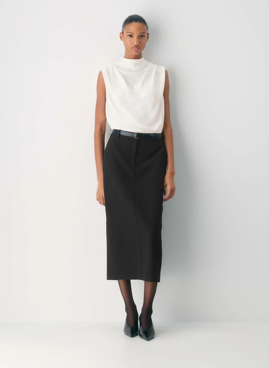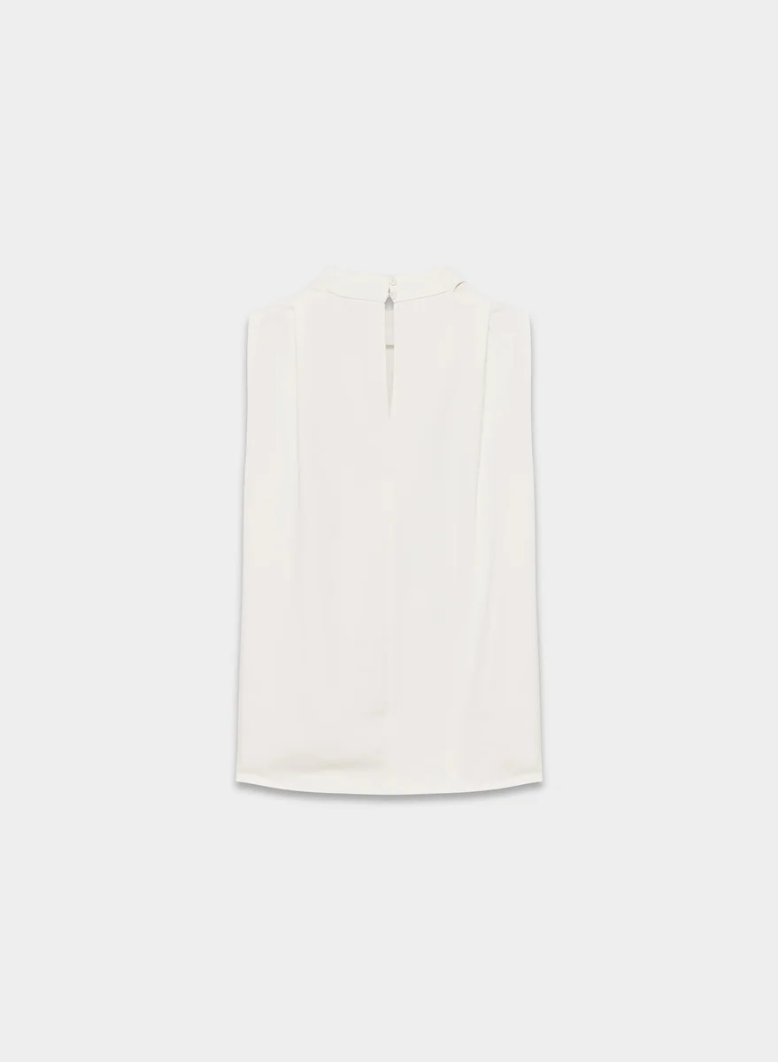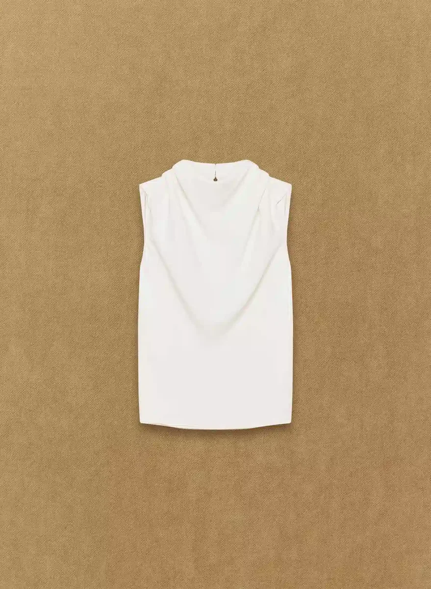 This mockneck wants to be differentThis is a sleeveless blouse with a mock-cowl neckline and a keyhole cutout at the back. It’s made with Studio Drape — drapey