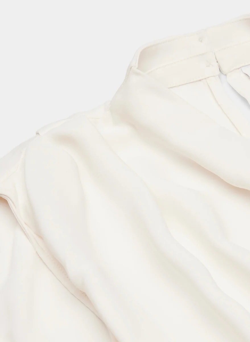 This is a sleeveless blouse with a mock-cowl neckline and a keyhole cutout at the back. It’s made with Studio Drape — drapey matte satin with a smooth look and lightweight feel. This fabric is made with 50% recycled polyester.