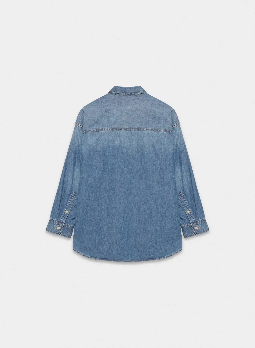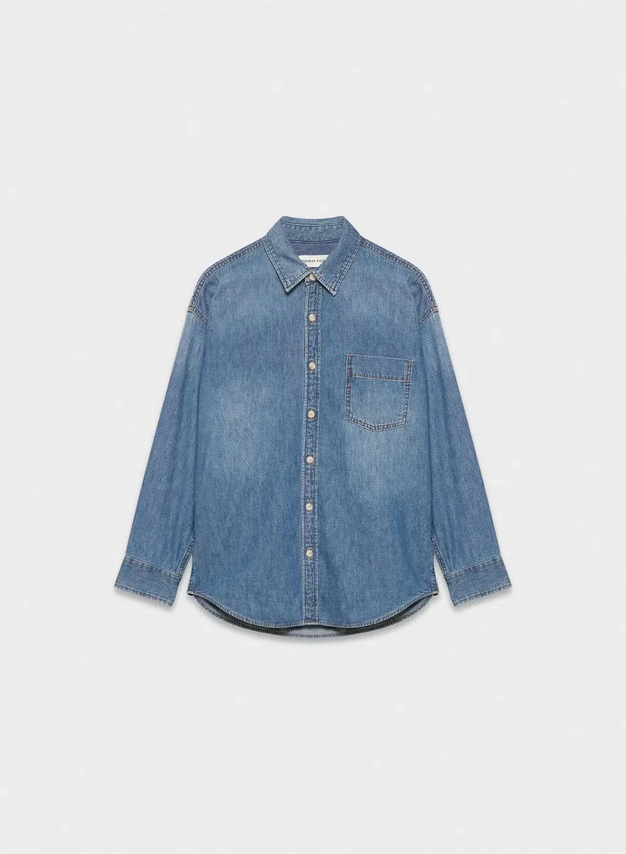 Inspired by the infamous decade, The ’80s Comfy is Denim Forum’s signature oversized button-up shirt. It has classic details like button-closure cuffs, a patch pocket and a rounded hem. It’s cut from lightweight and drapey non-stretch denim with a soft feel. This version comes in a medium indigo wash.