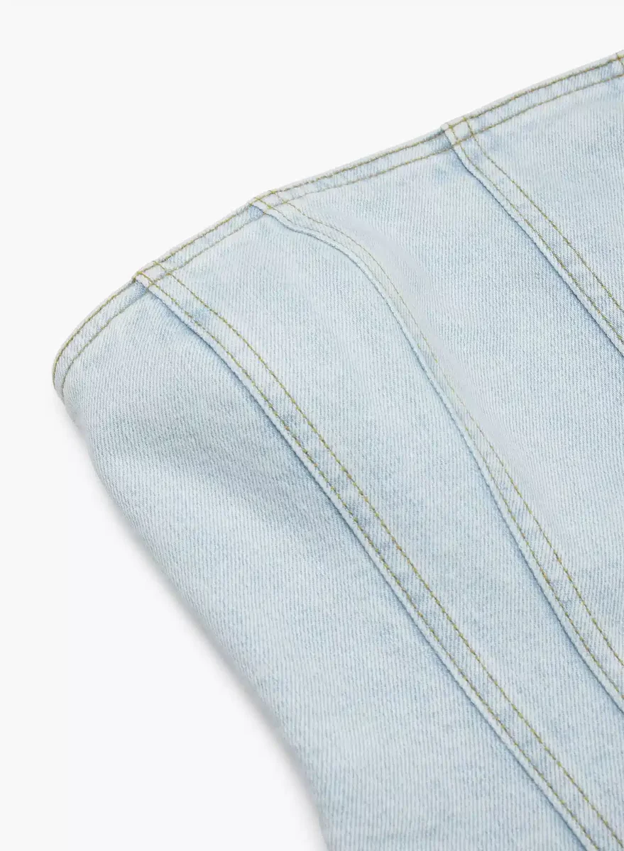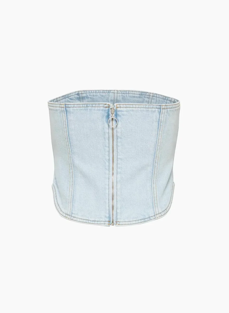 Inspired the casual-yet-bold aesthetic of the decade, The ’90s Debbie is a bustier top that features classic seaming details, an exposed back zip and — like any good corset — a tight fit. It’s cut from premium Italian comfort-stretch denim that only gets better with wear. This version comes in a light indigo wash.