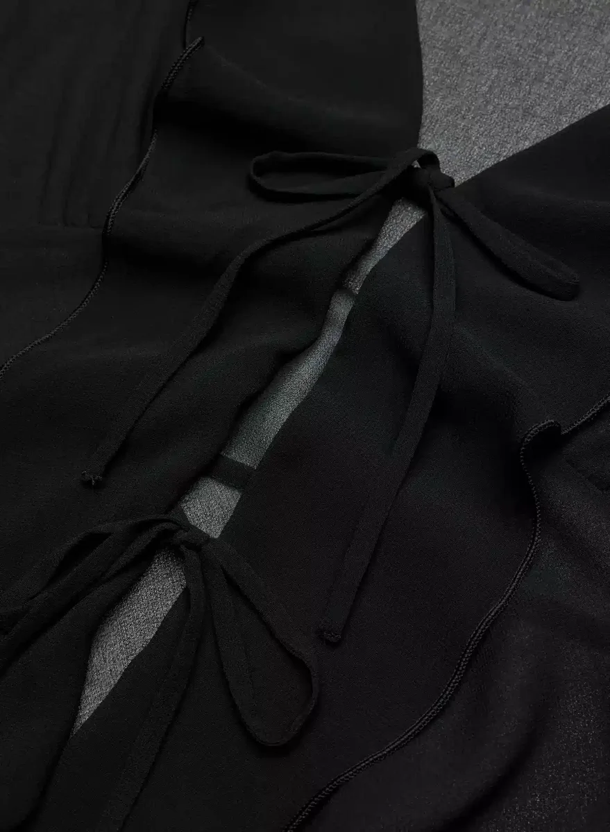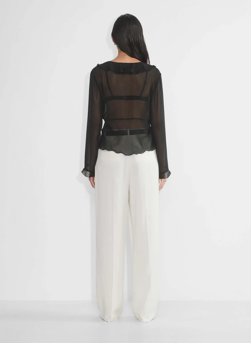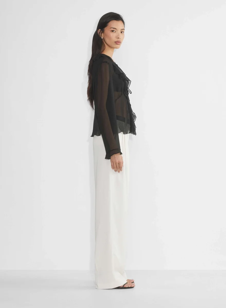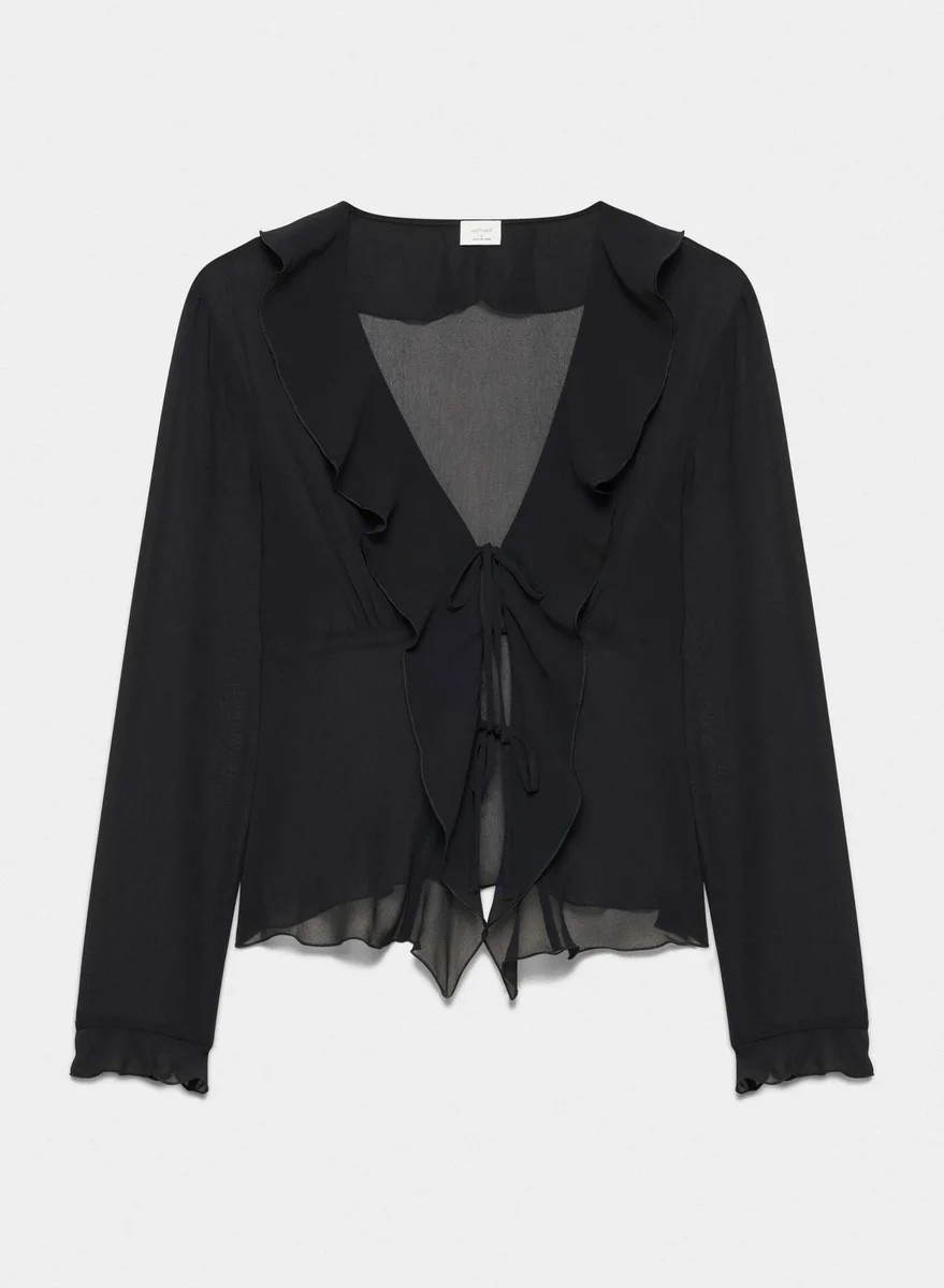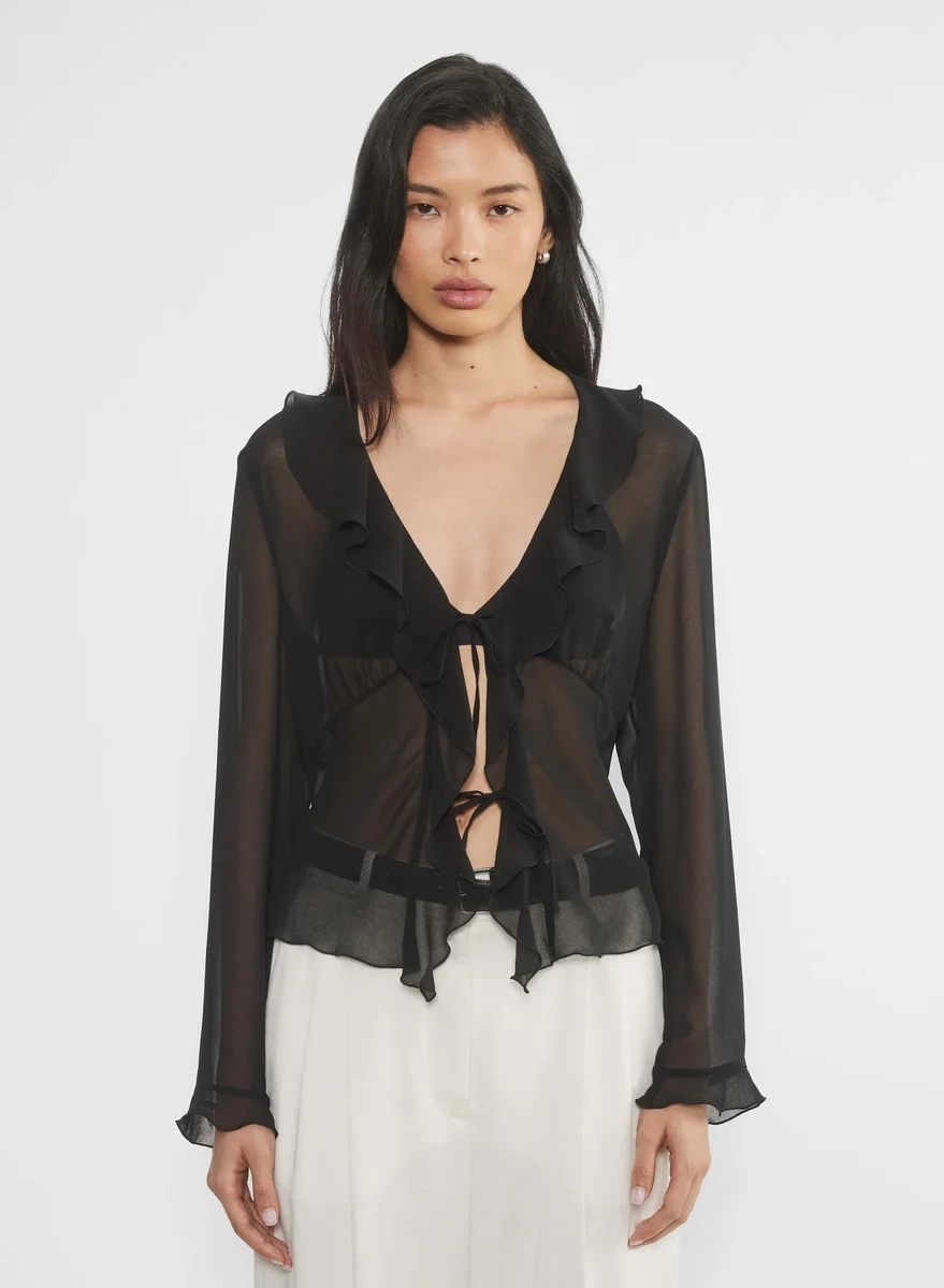 This is a V-neck blouse with ruffled edges and a tie closure. It’s made with Fête Chiffon™ — lightweight, semi-sheer fabric with an ethereal drape. This version is made from 100% recycled polyester.