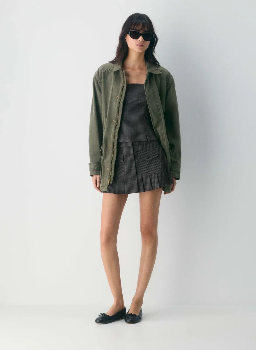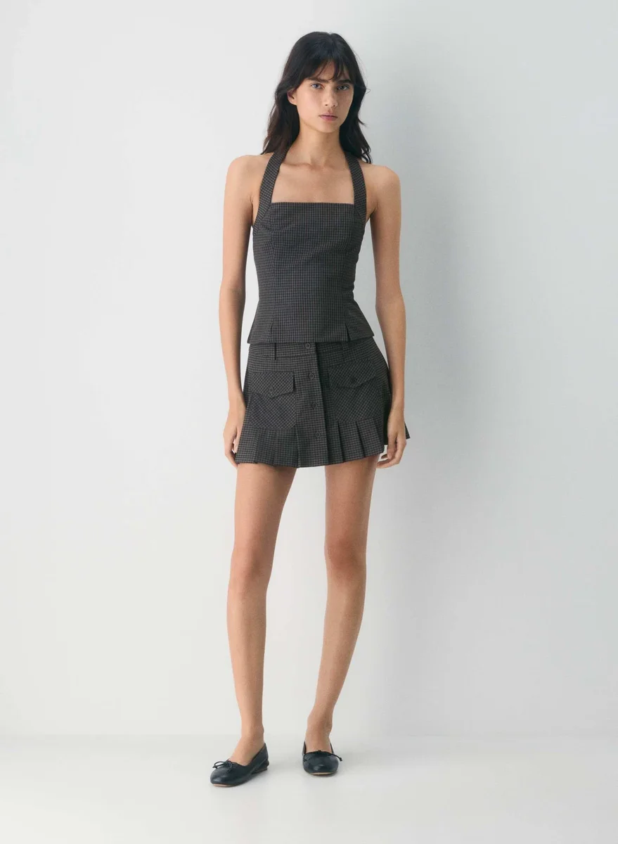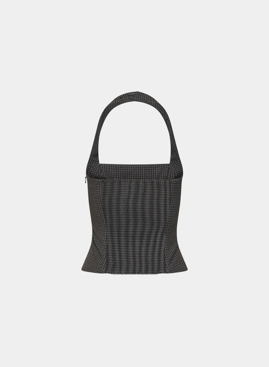 This is a bustier top with an adjustable halter neckline, an invisible side zip and princess seams for shaping. It’s made from softly structured suiting fabric with a smooth feel. This fabric is sourced from a premier Portuguese mill and made with 60% recycled polyester and 29% LENZING™ ECOVERO™ Viscose.