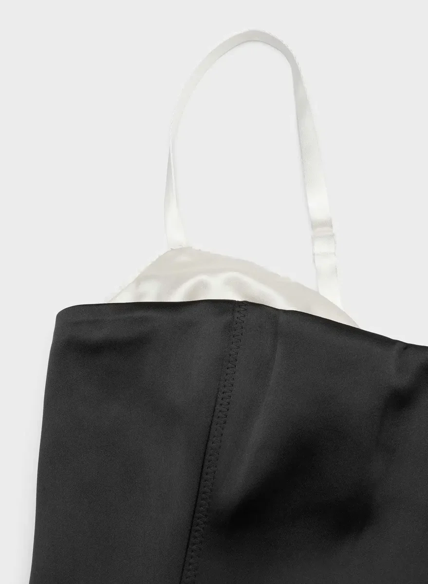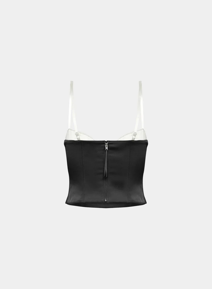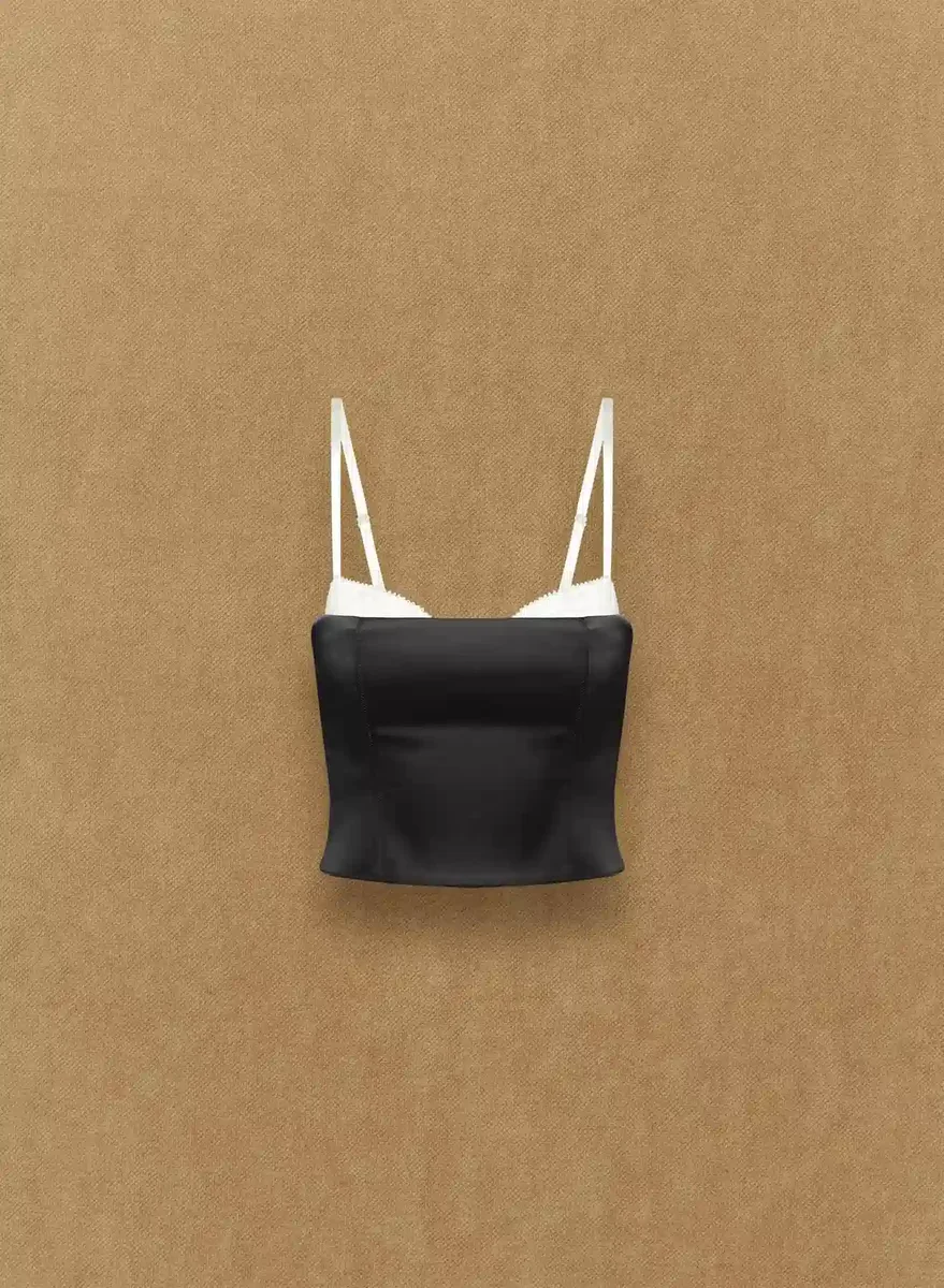 This is a bustier top with adjustable straps and princess seams for shaping. It’s crafted from a soft-sheen satin with a smooth feel and stretch for all-day comfort. This fabric is made with 65% recycled polyester.