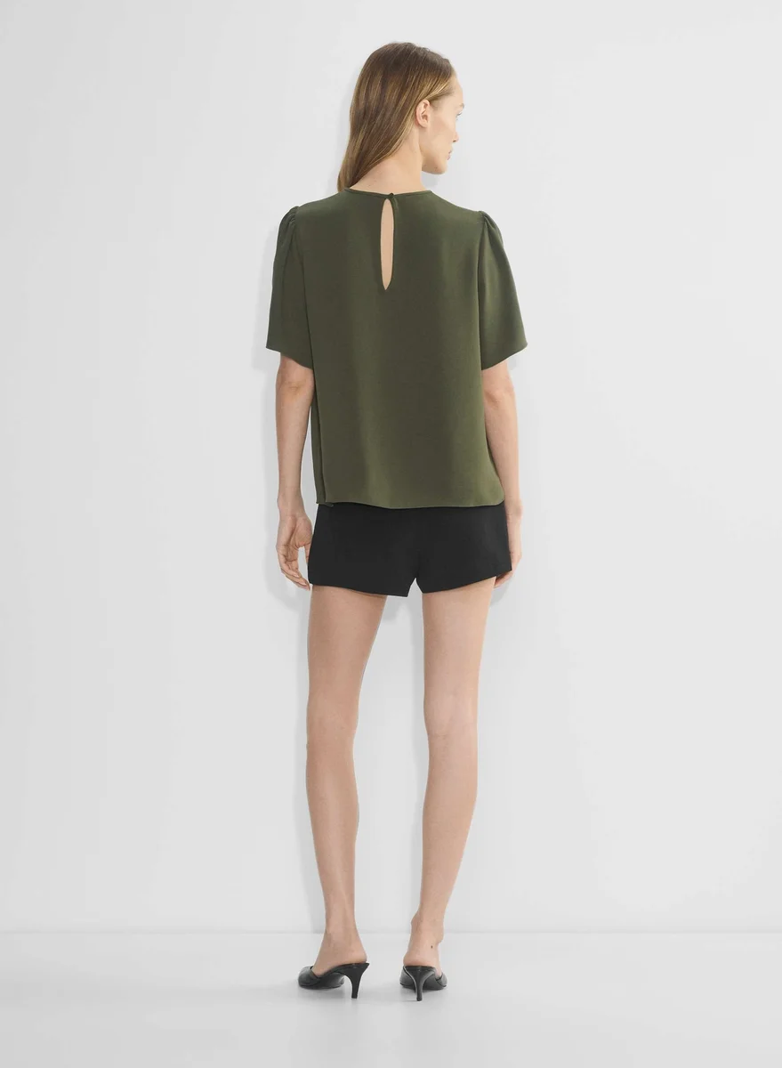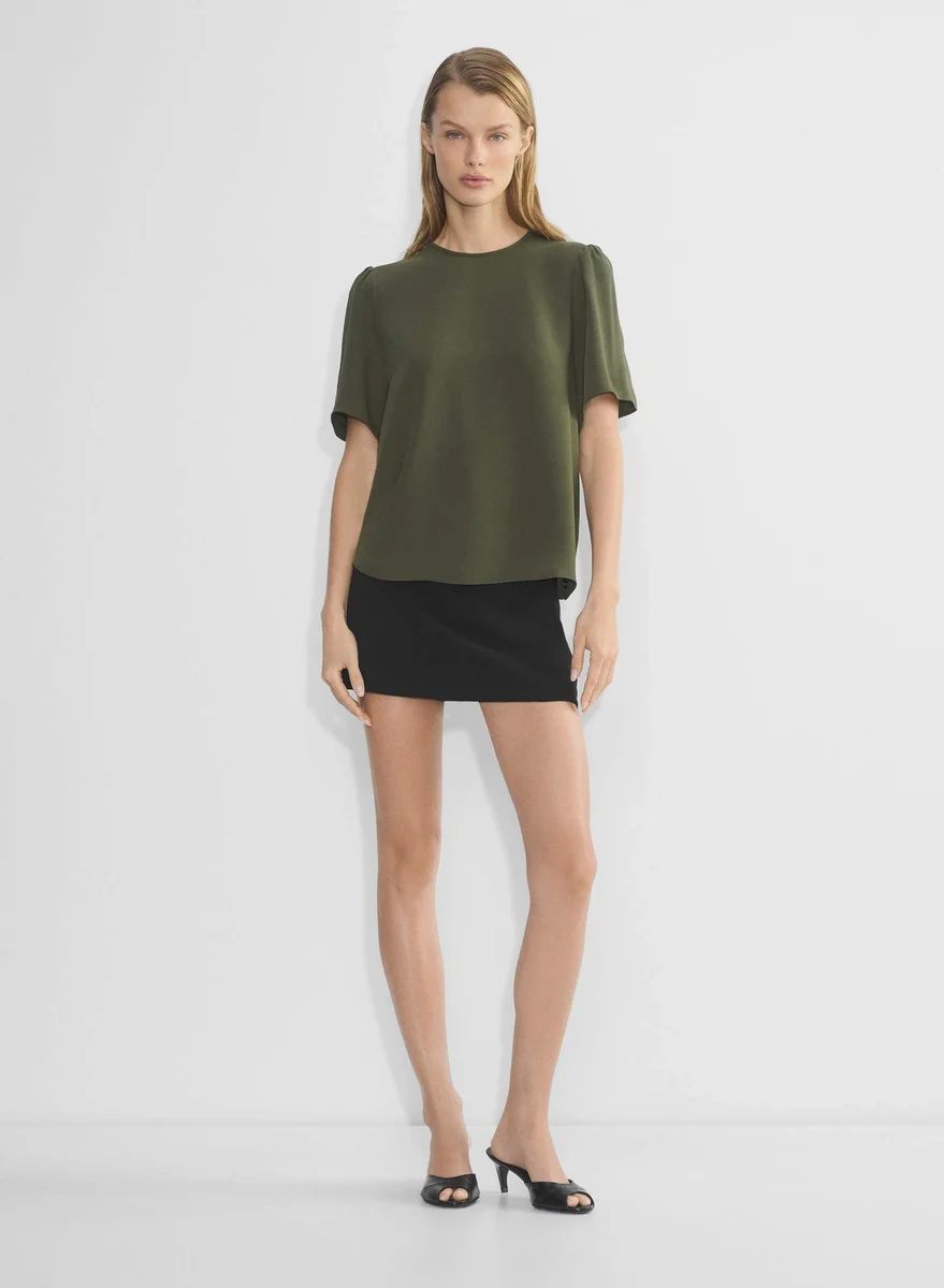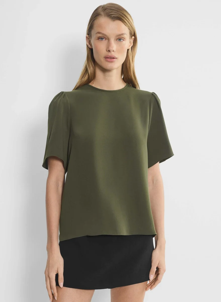 This is a shell blouse with flutter sleeves and a crew neckline. It’s made with Studio Drape — drapey matte satin with a smooth look and lightweight feel. This fabric is made with 50% recycled polyester.