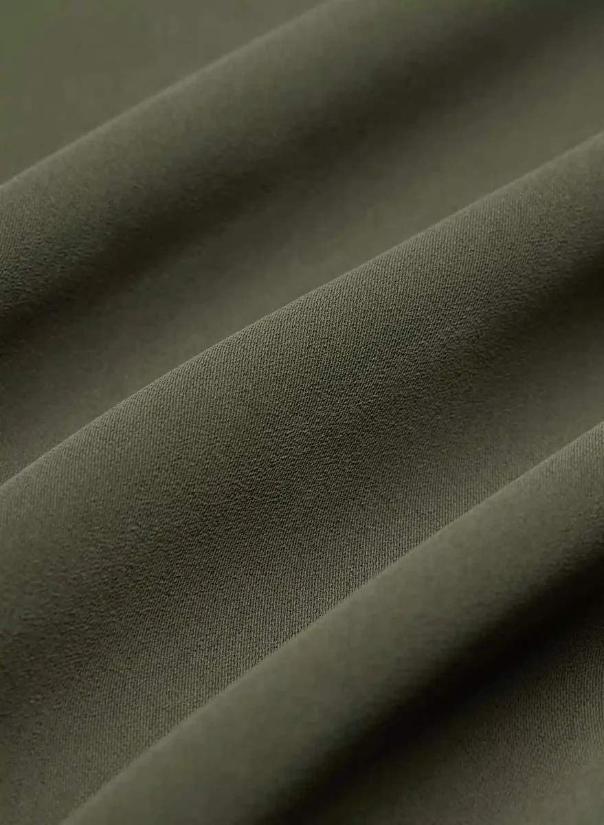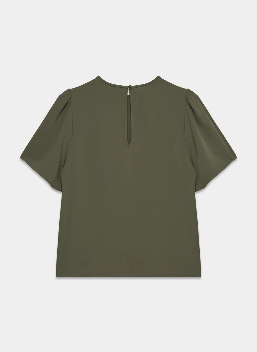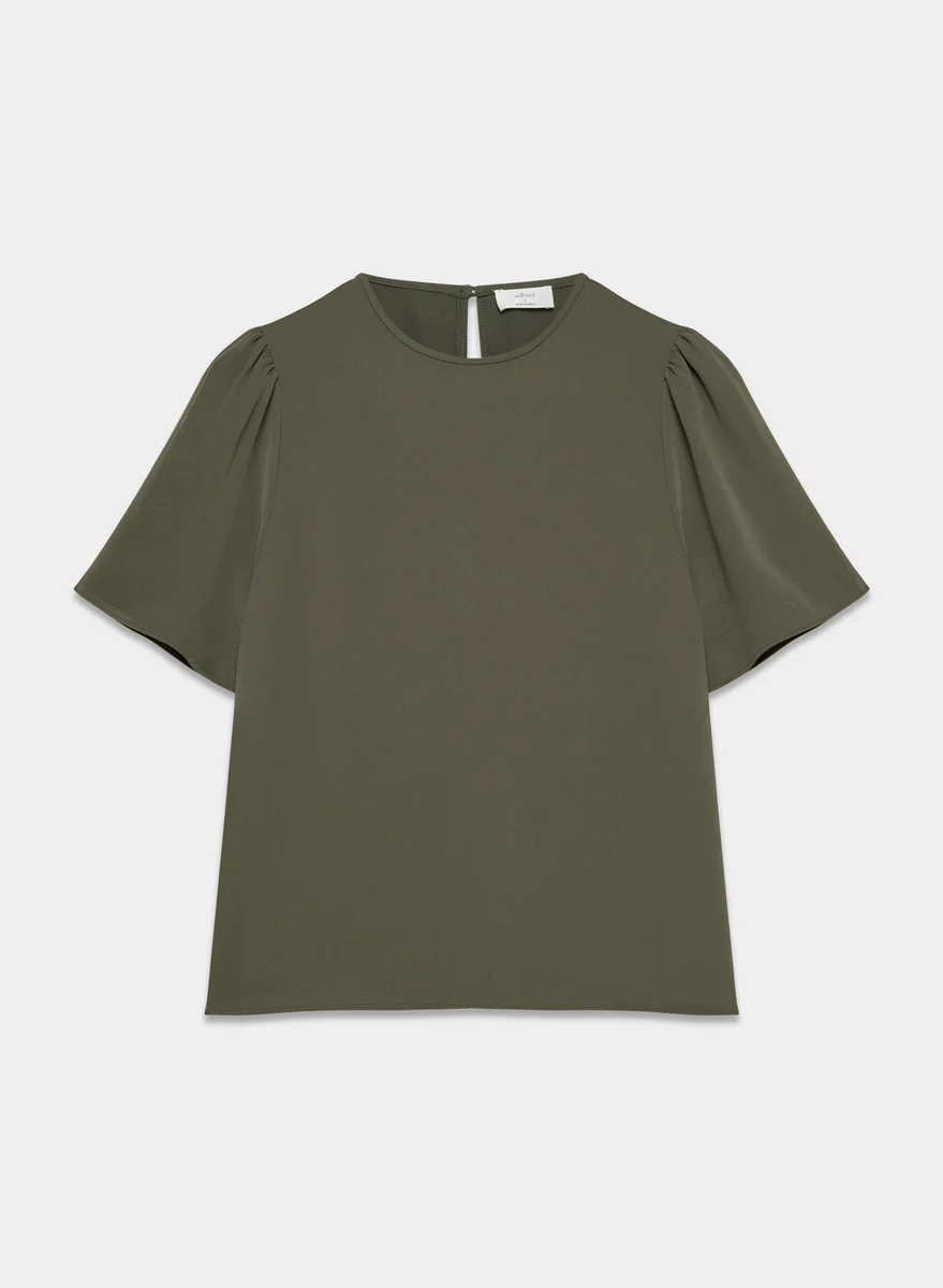 This is a shell blouse with flutter sleeves and a crew neckline. It’s made with Studio Drape — drapey matte satin with a smooth look and lightweight feel. This fabric is made with 50% recycled polyester.