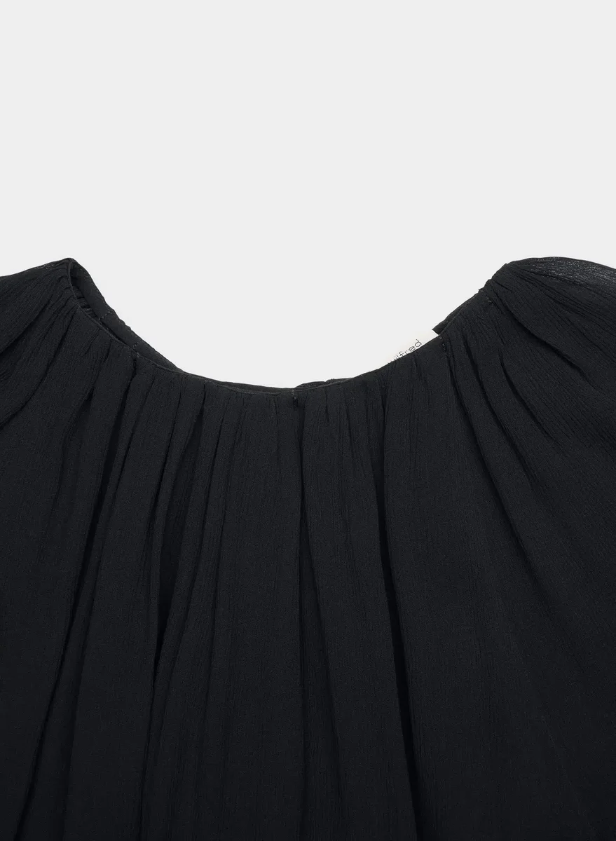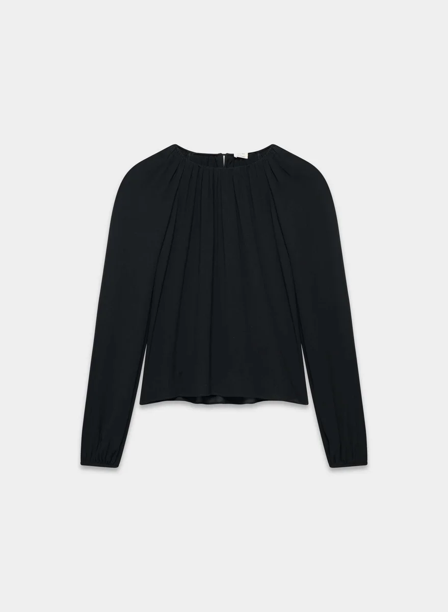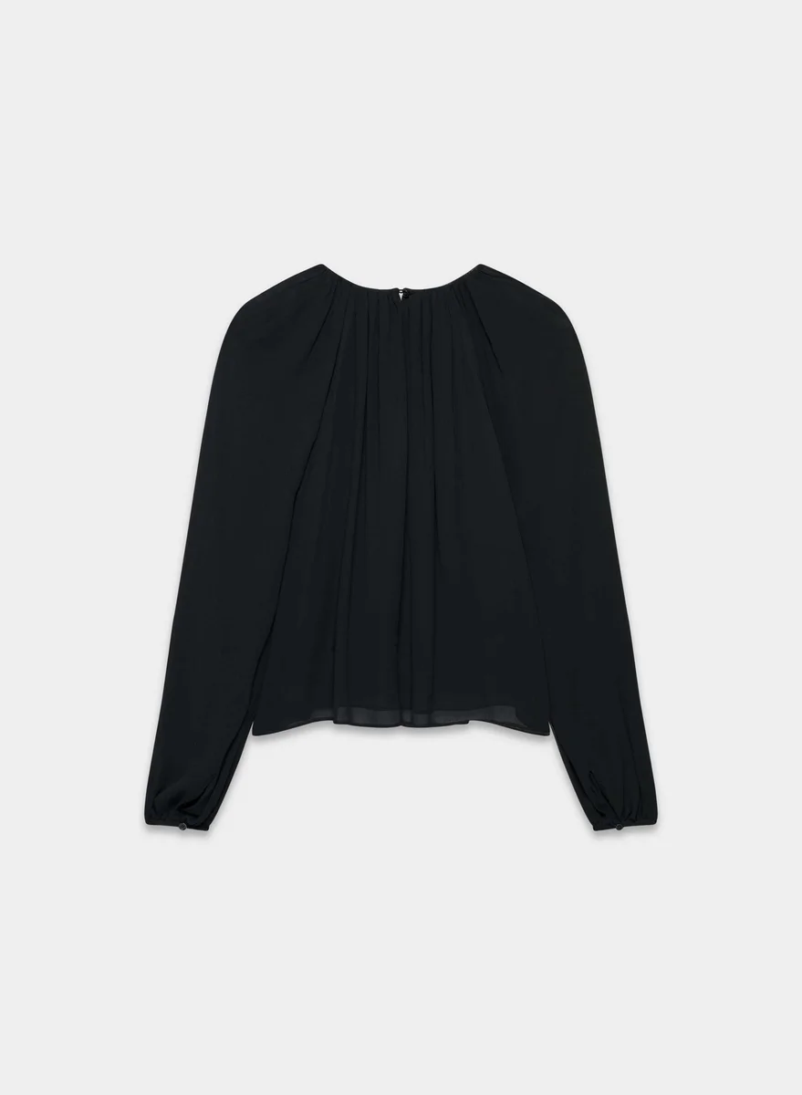 This is a crewneck shell blouse with a lined bodice and a keyhole cutout at the back. It’s crafted from semi-sheer chiffon with a crinkled texture and soft drape. This fabric is made with 55% LENZING™ ECOVERO™ Viscose.