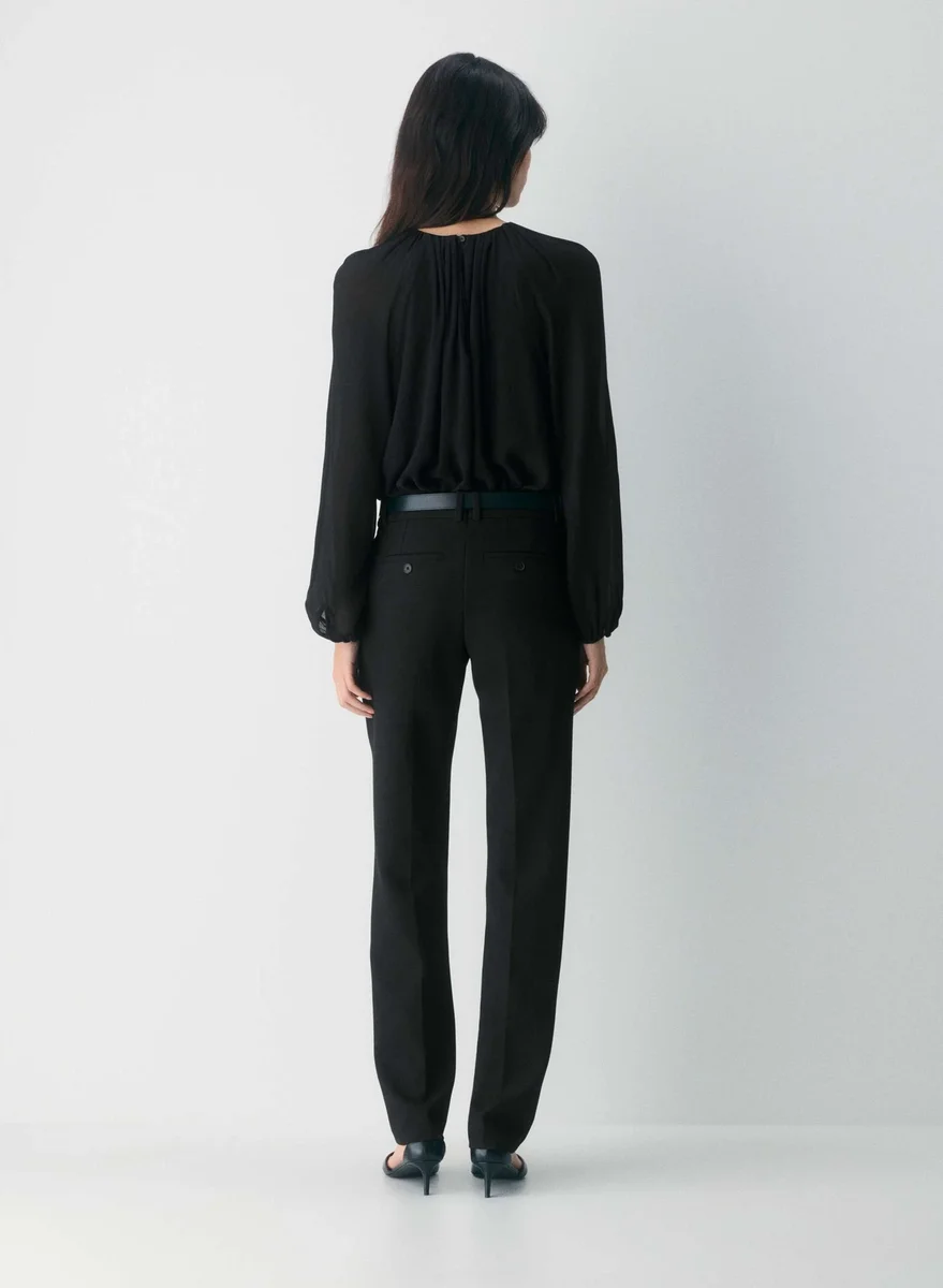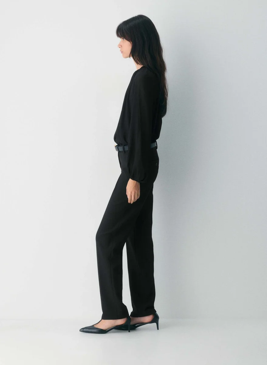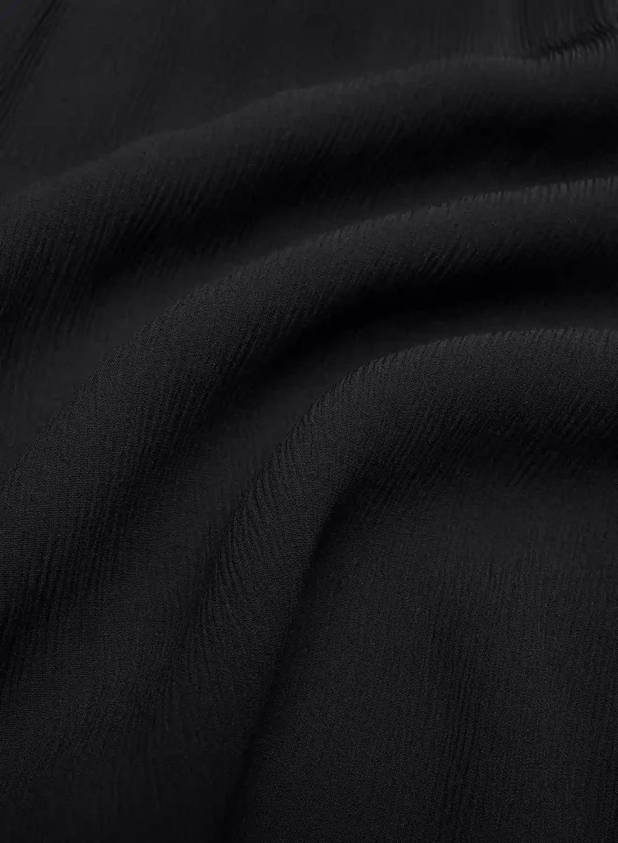 This is a crewneck shell blouse with a lined bodice and a keyhole cutout at the back. It’s crafted from semi-sheer chiffon with a crinkled texture and soft drape. This fabric is made with 55% LENZING™ ECOVERO™ Viscose.
