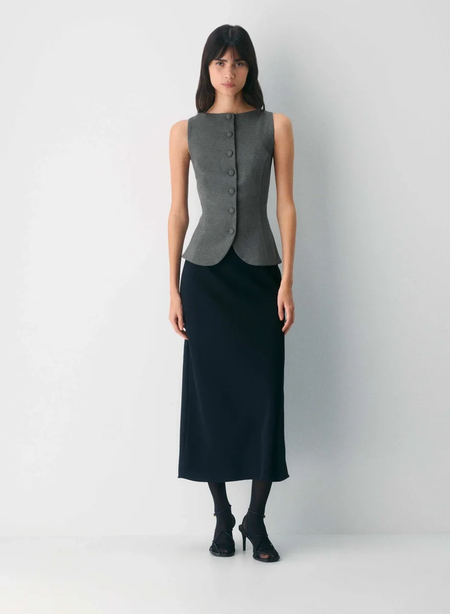 How properThis is a boatneck button-up vest with princess seams for shaping. It’s made with PonteFlex — a luxurious ponte knit with a soft feel and the perfect amount of stretch. This fabric is made with 83% rayon, wood-based fibres sourced from responsibly managed forests with a focus on protecting ecosystems.