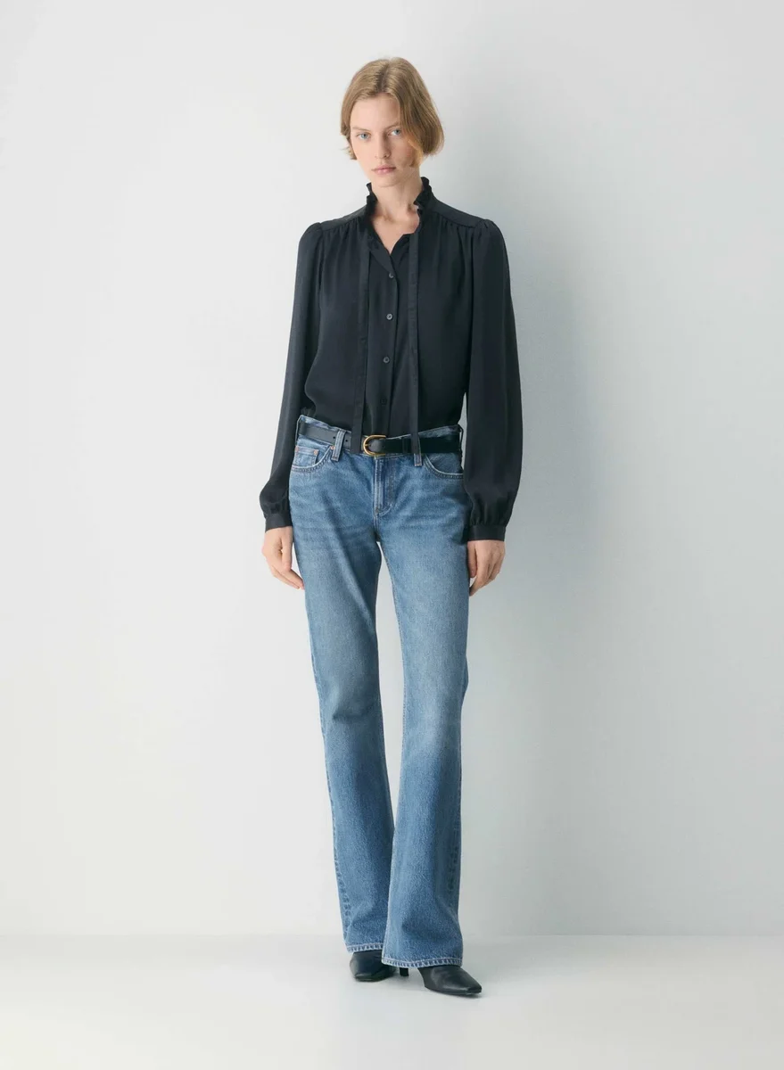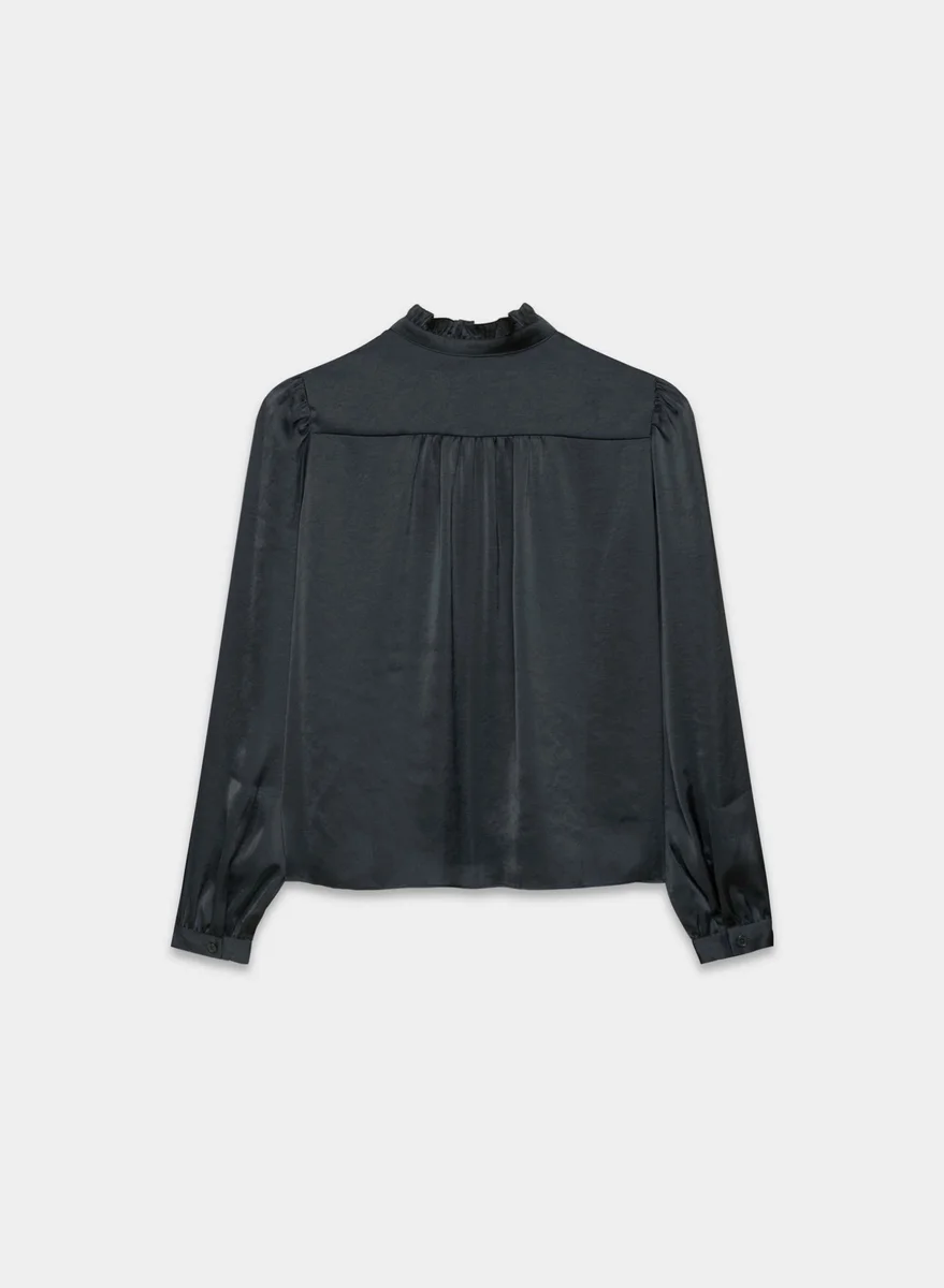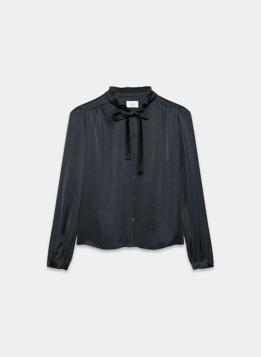 The accessory is the necklineThis is a button-up blouse featuring a ruffled collar with tie details. It’s cut from drapey Japanese satin with a soft sheen and