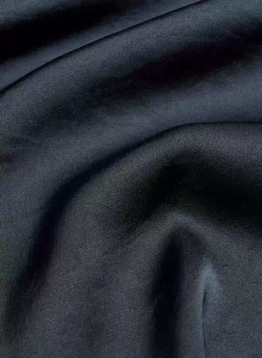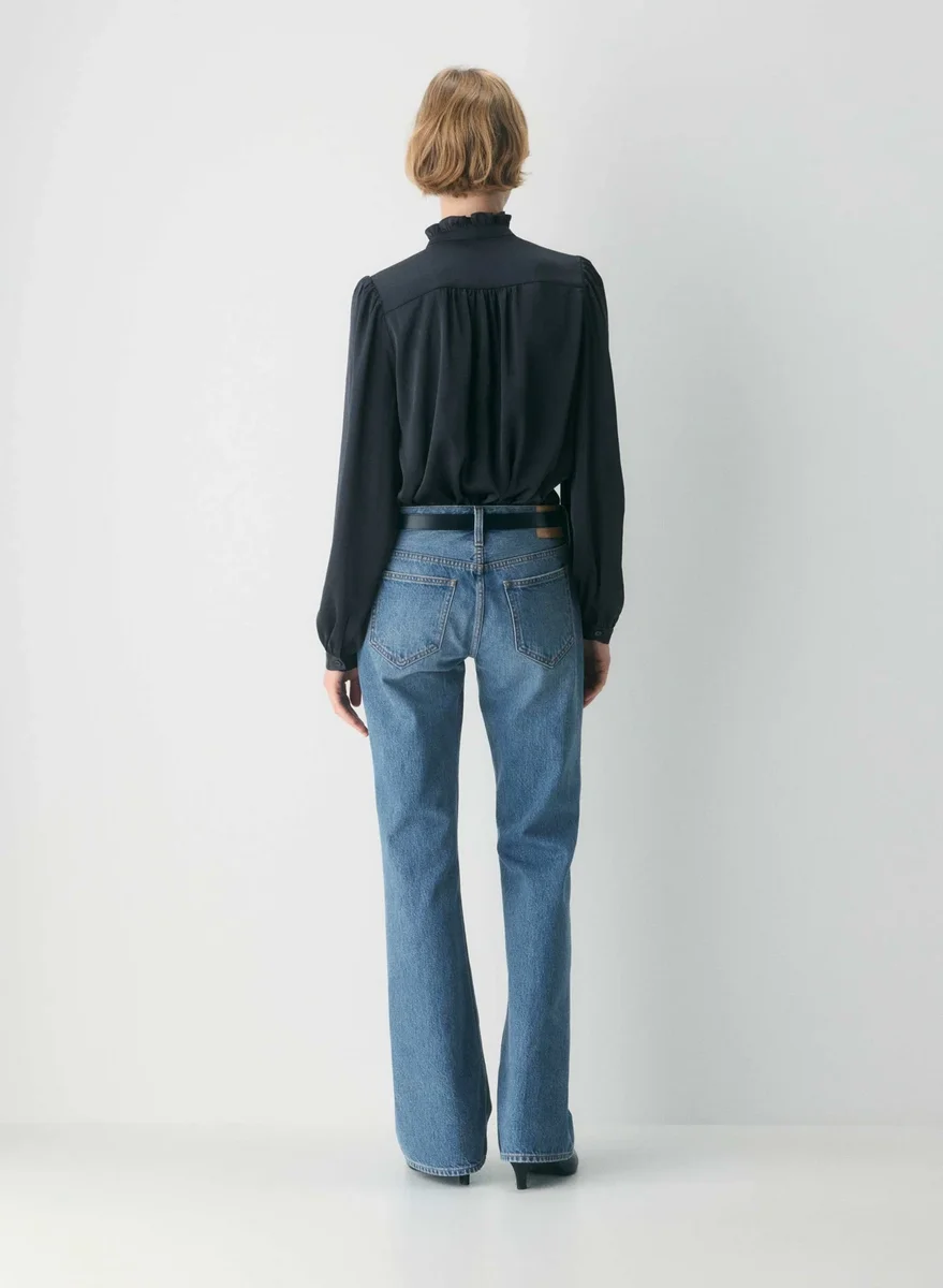 This is a button-up blouse featuring a ruffled collar with tie details. It’s cut from drapey Japanese satin with a soft sheen and vintage finish for a crinkled look and feel.