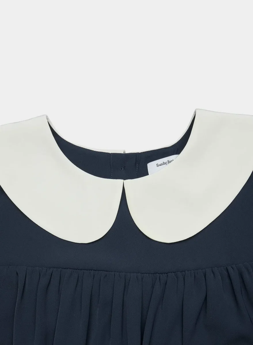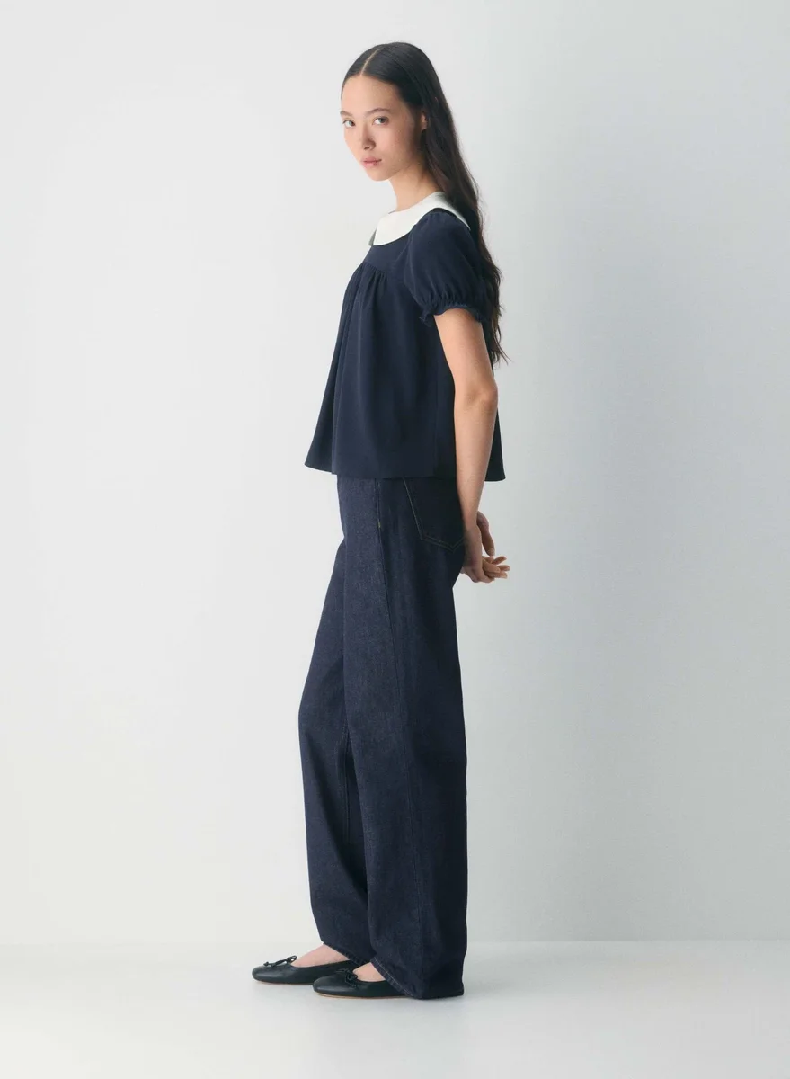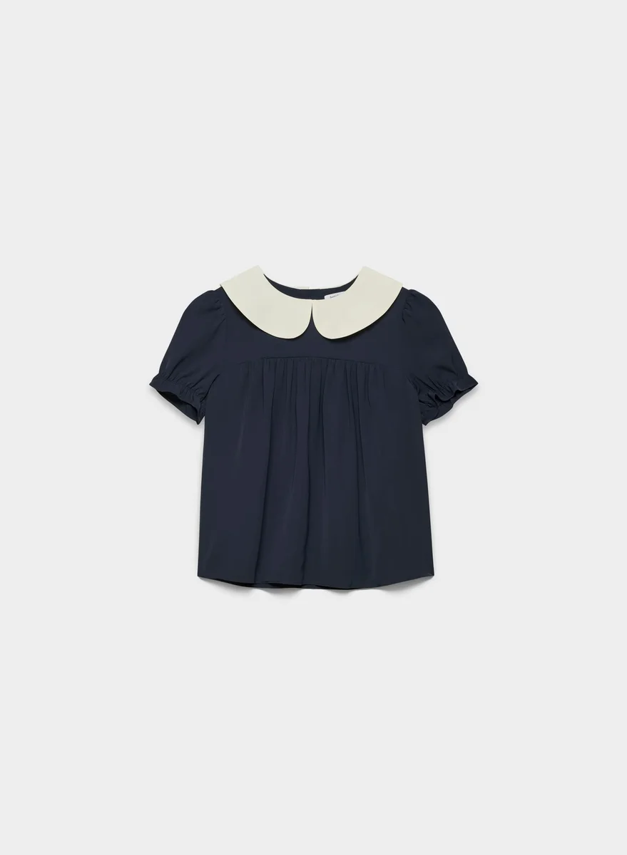 This is a babydoll blouse with a silk collar, puff sleeves and a classic fit. It’s cut from drapey matte material with a luxuriously smooth next-to-skin feel. This fabric is made with 100% recycled polyester.