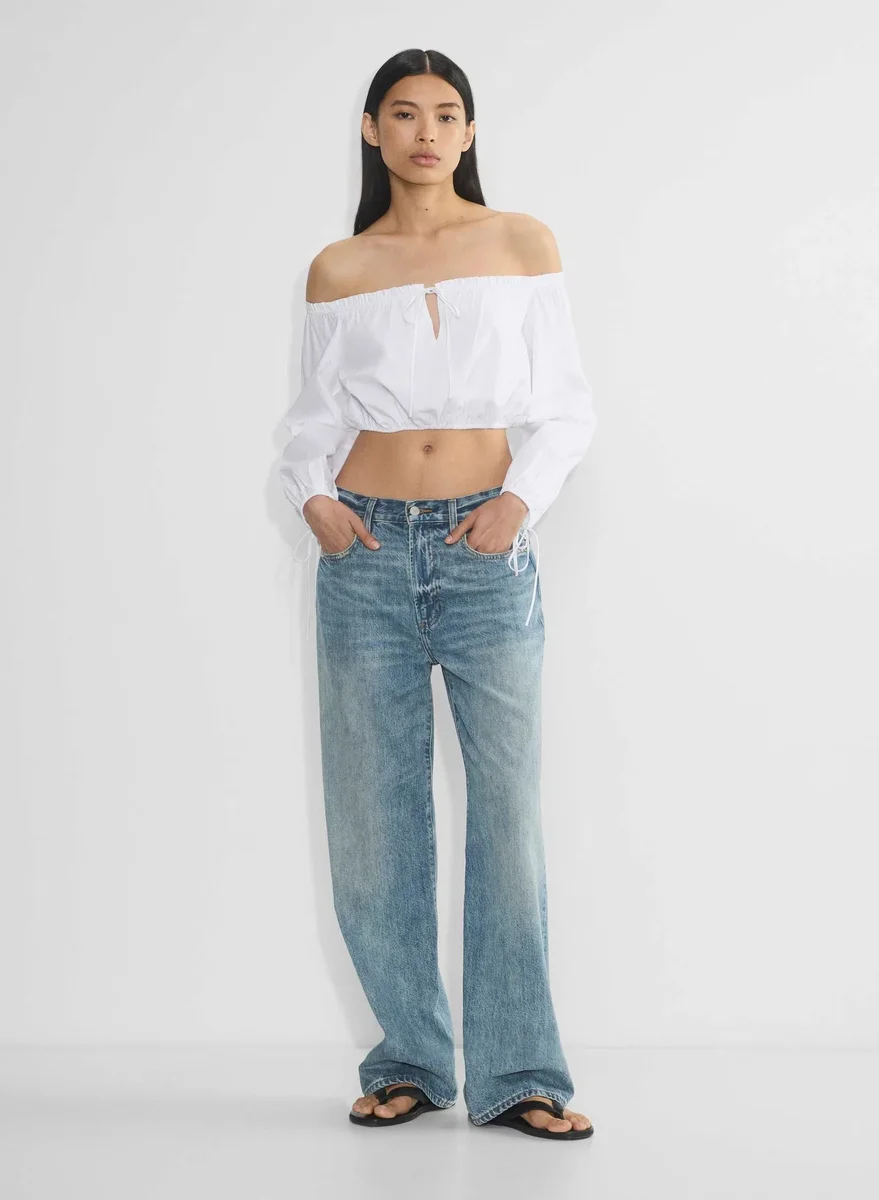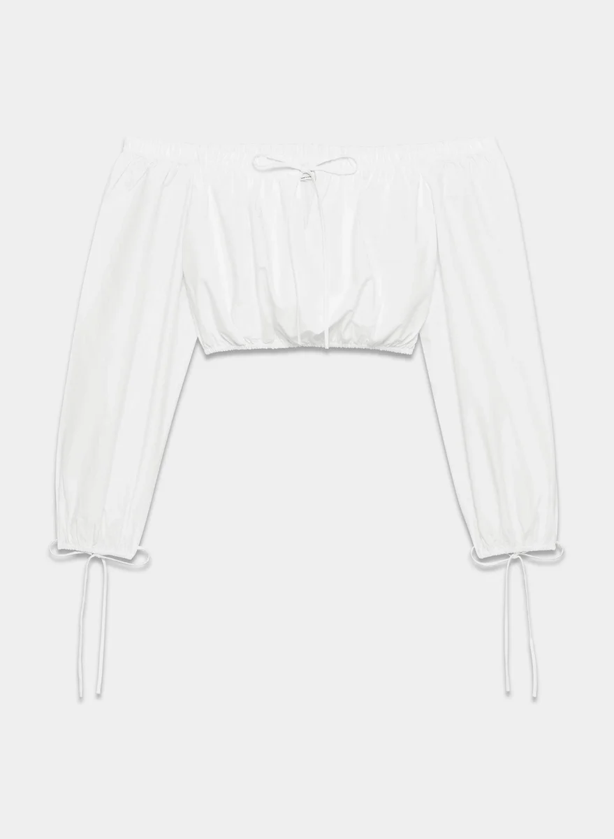 Meet by the main stage?This is an cropped off-the-shoulder blouse with tie details at the cuffs and neckline. It’s made from breathable cotton poplin with a crisp, airy feel that’s smooth to the touch.